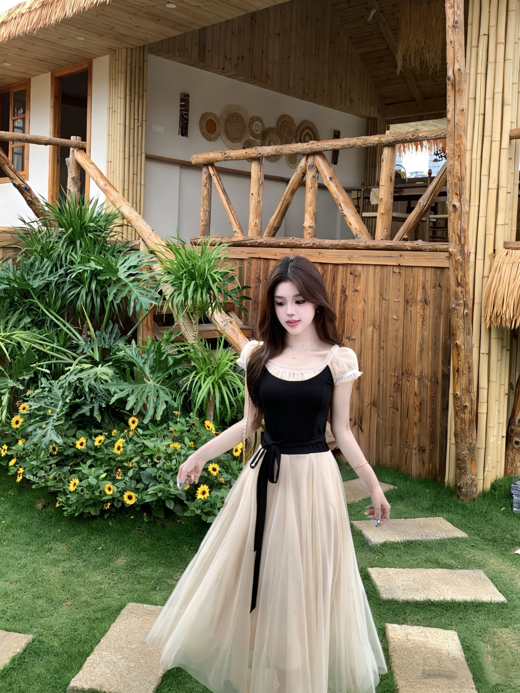 빅 사이즈 달콤한 안개 꽃 리플 레트로 V넥 자수 꽃무늬 여성 드레스 품격 고급 몸매 가꾸기 슬림해 보이는 프랑스식 롱 스커트