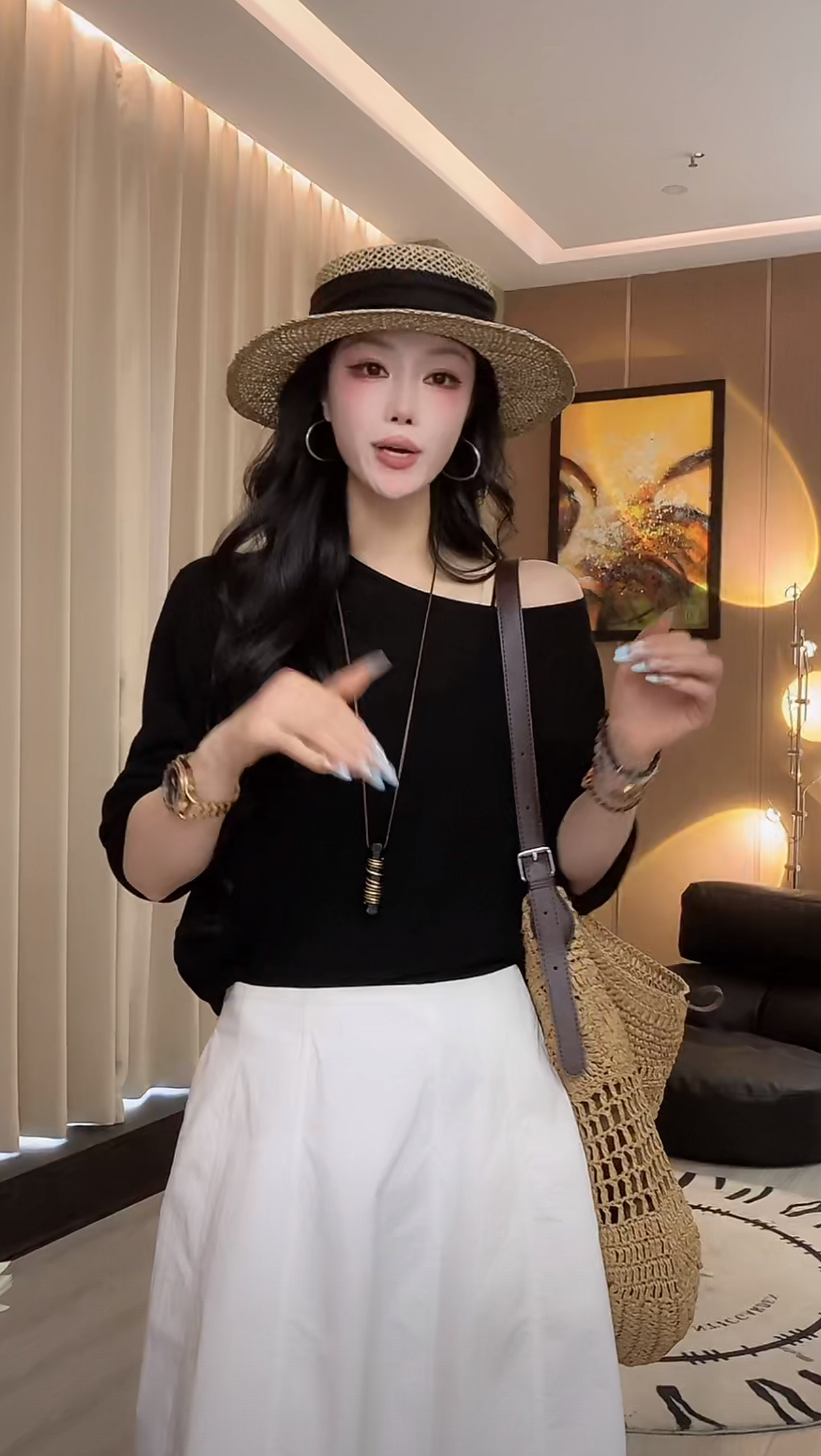 녹색 岚 구름 슈 치마 세트 비스듬한 어깨 디자인 센스 하이웨이스트 품격 다용도 캐주얼 세트 3종 세트