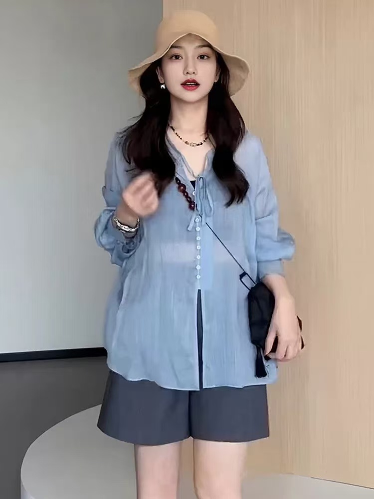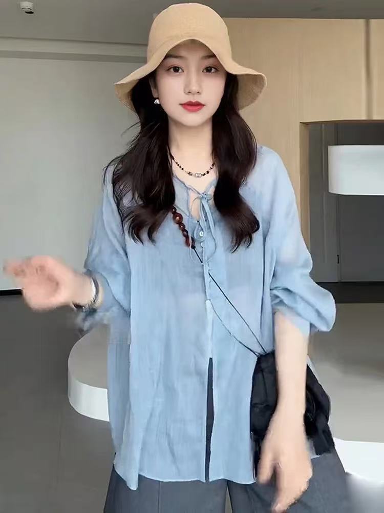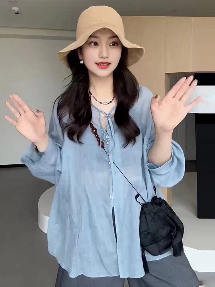 파란색 레이스업 주간 실크 아마 태양 보호 셔츠 셔츠 여성 코트 여름 루즈핏 얇은 스타일 마이크로 ~을 통해 라미 긴팔 맨위