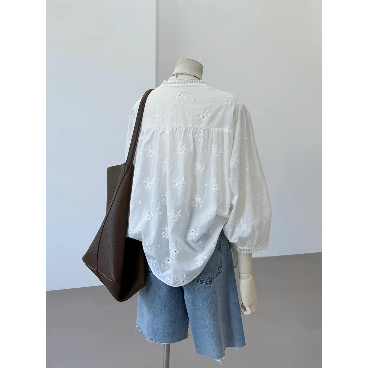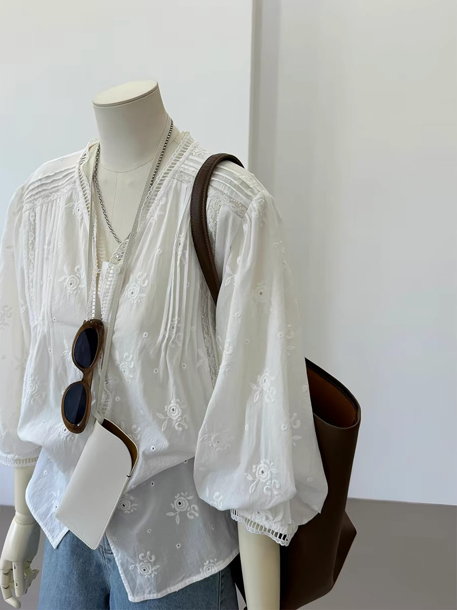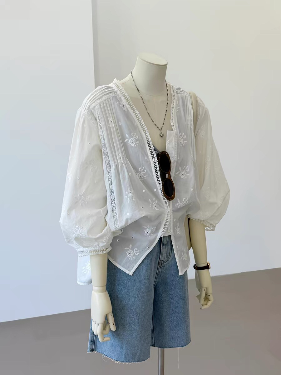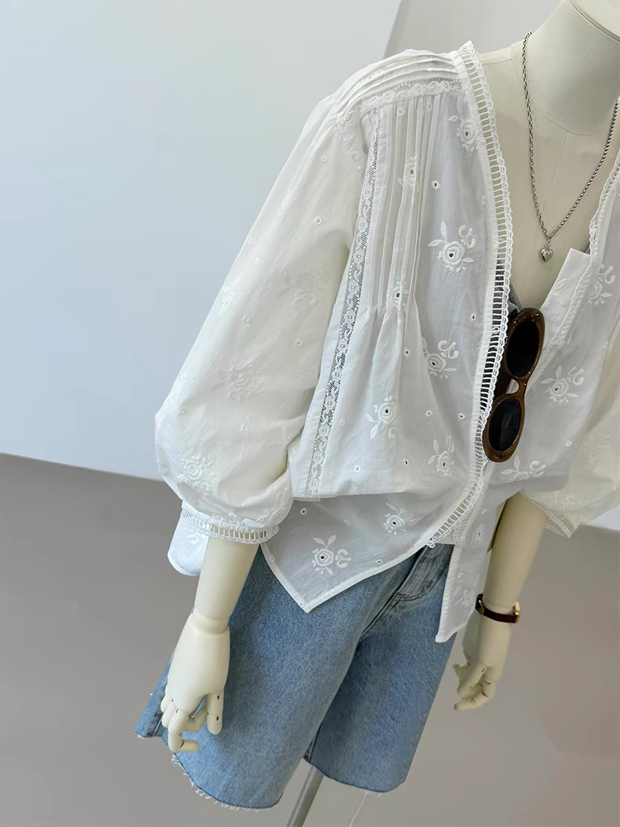 프랑스식 패션 레이스 측면 홀로우 아웃 V넥 여성 셔츠 2026 여름 새로운 루즈핏 슬림해 보이는 빛 럭셔리 연령 감소 맨위