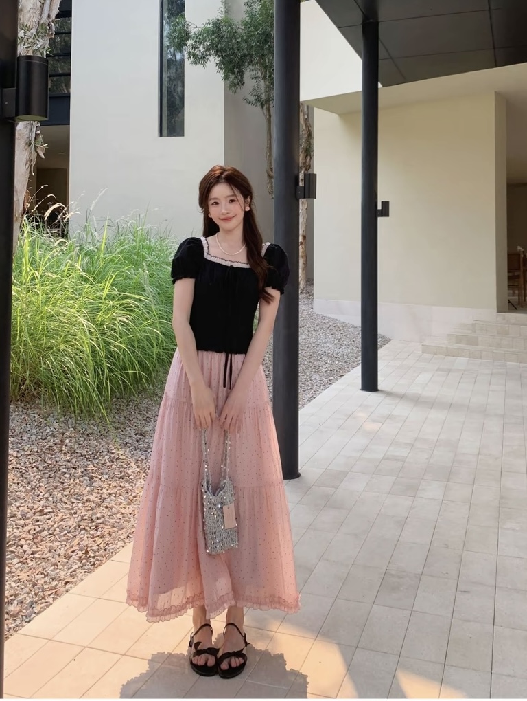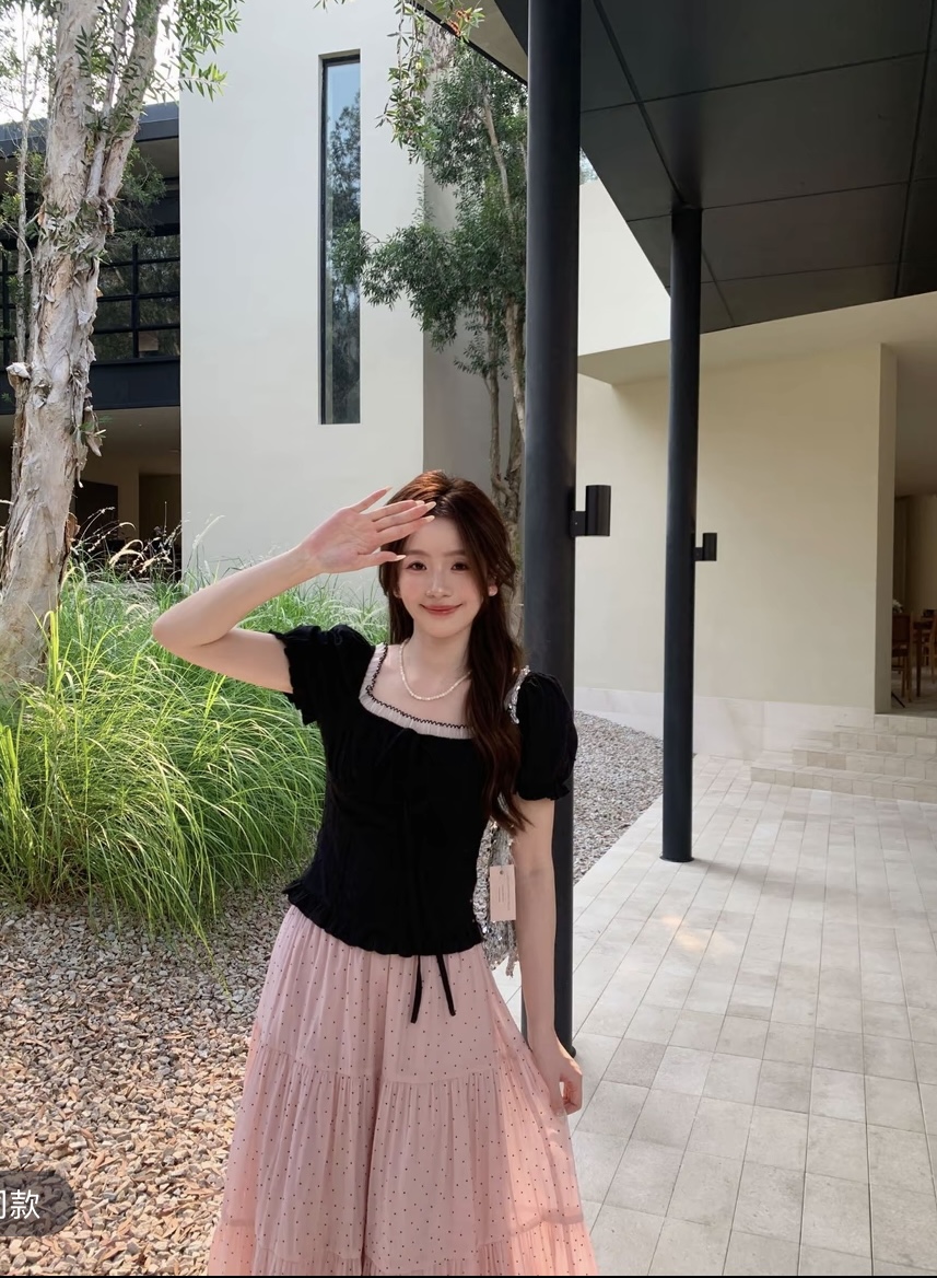 4 15 pm20 신제품 켜기 새로운 하나 달콤한 복숭아 yikett 행침 목 맨위 반 스커트 세트