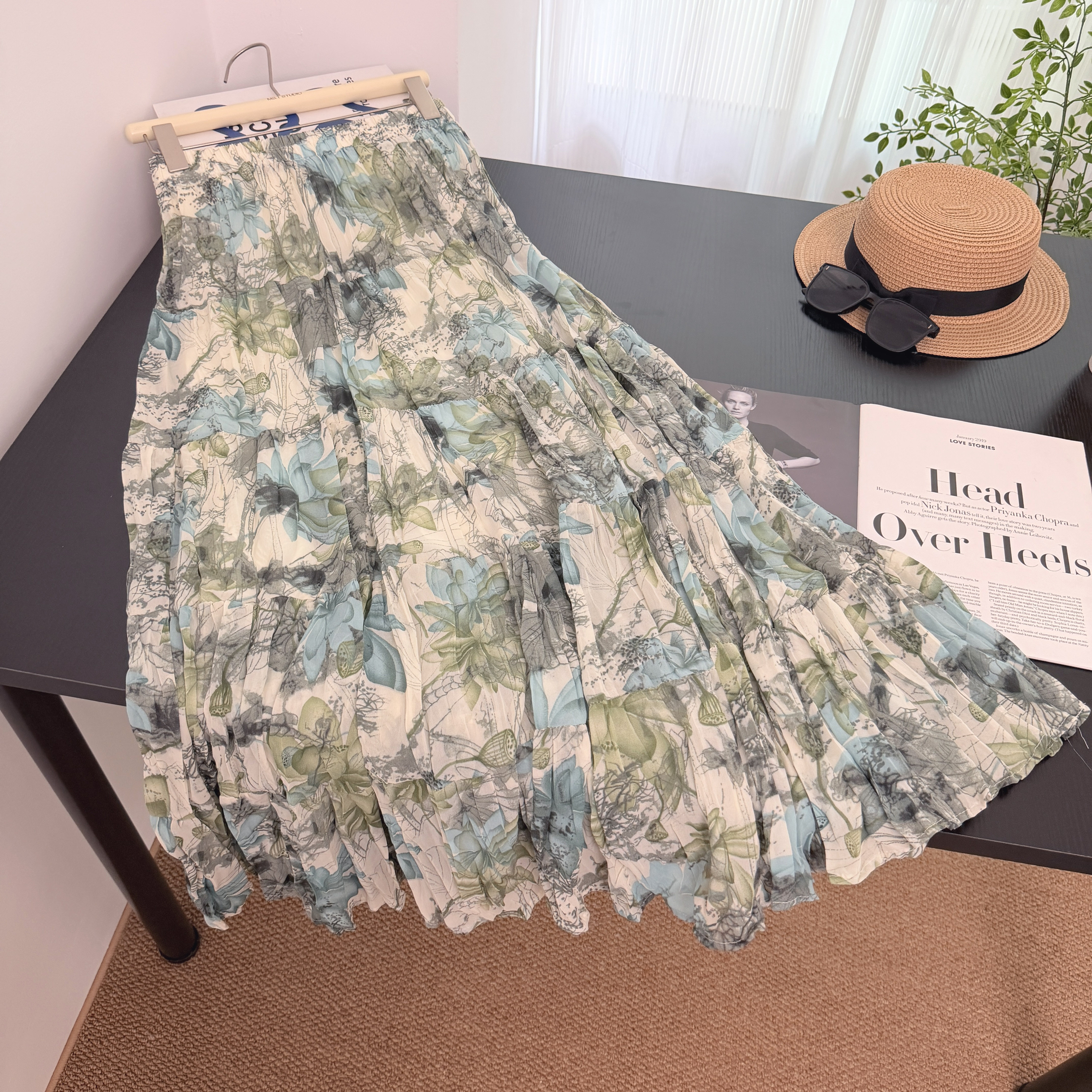 여름 새로운 큰 진자 반신 롱 스커트 여성 2025 새로운 표지 십자가 패치워크 한 마디 케이크 쉬폰 꽃무늬 반신 스커트