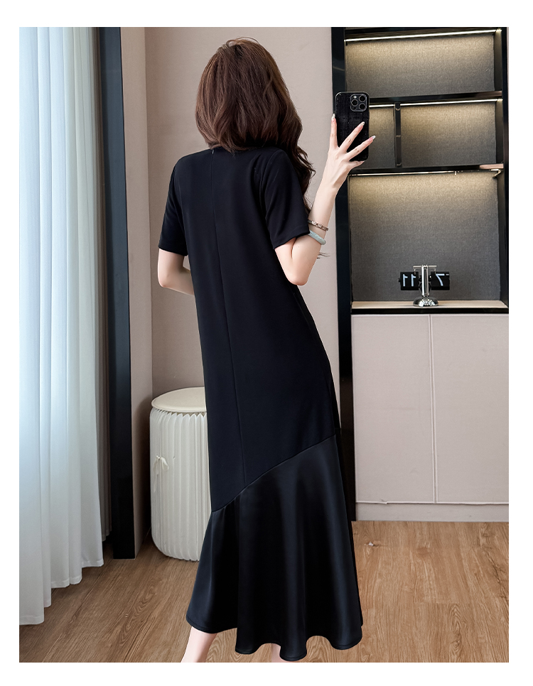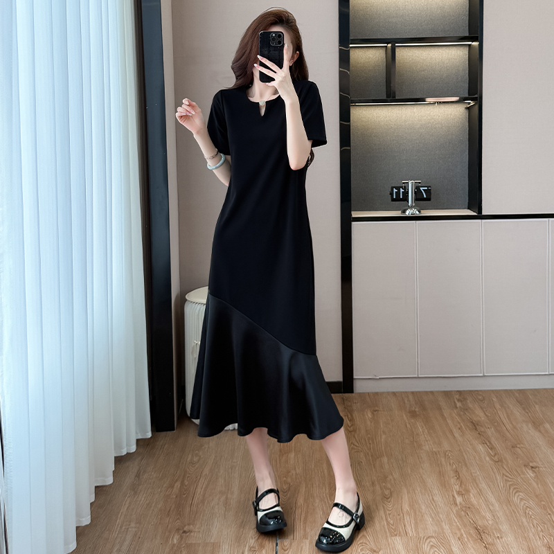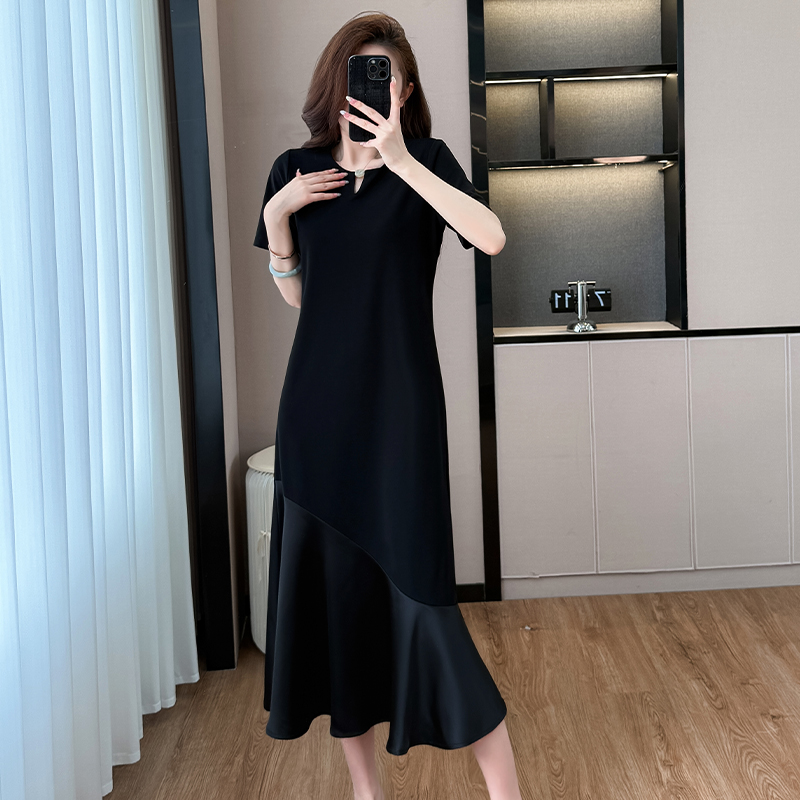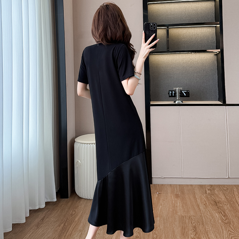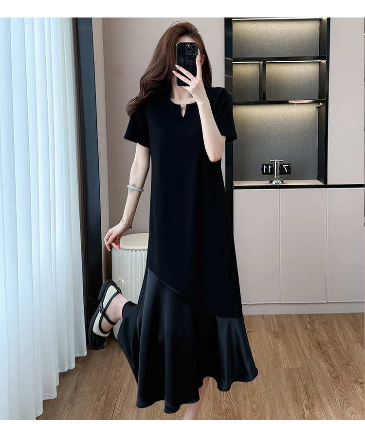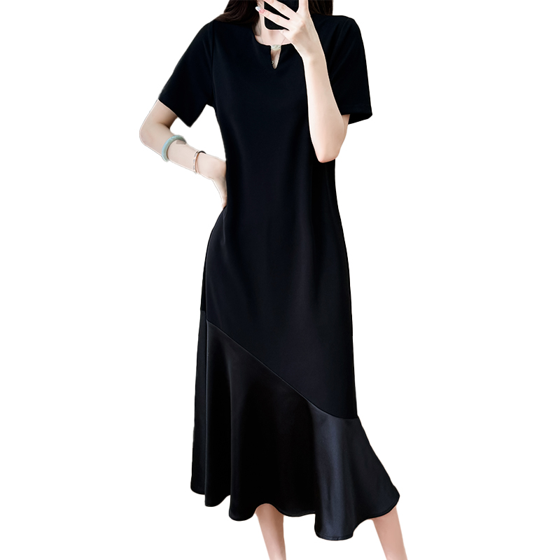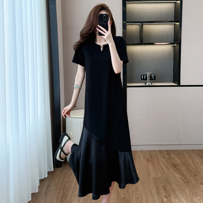 실사 패치워크 드레스 계층의 감각 고급 검정색 구름 실 중간 길이 빅 사이즈 티셔츠 치마 여성 여름