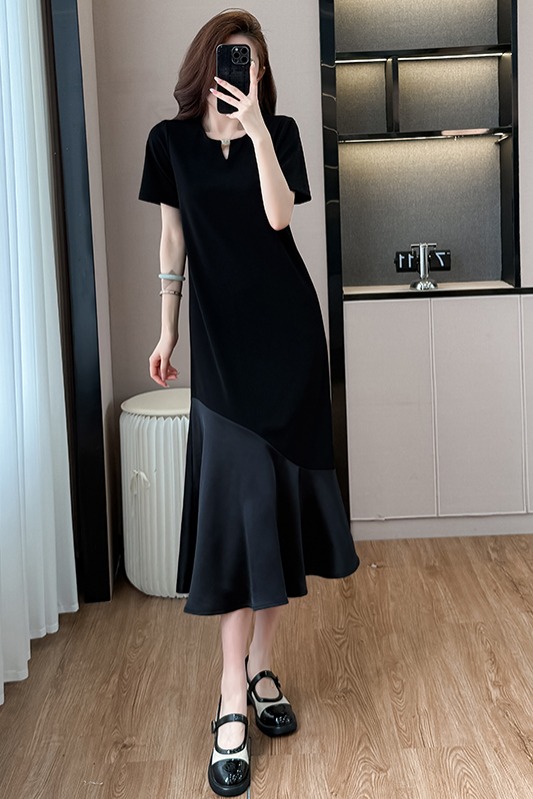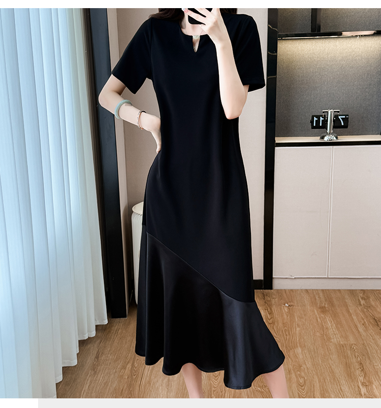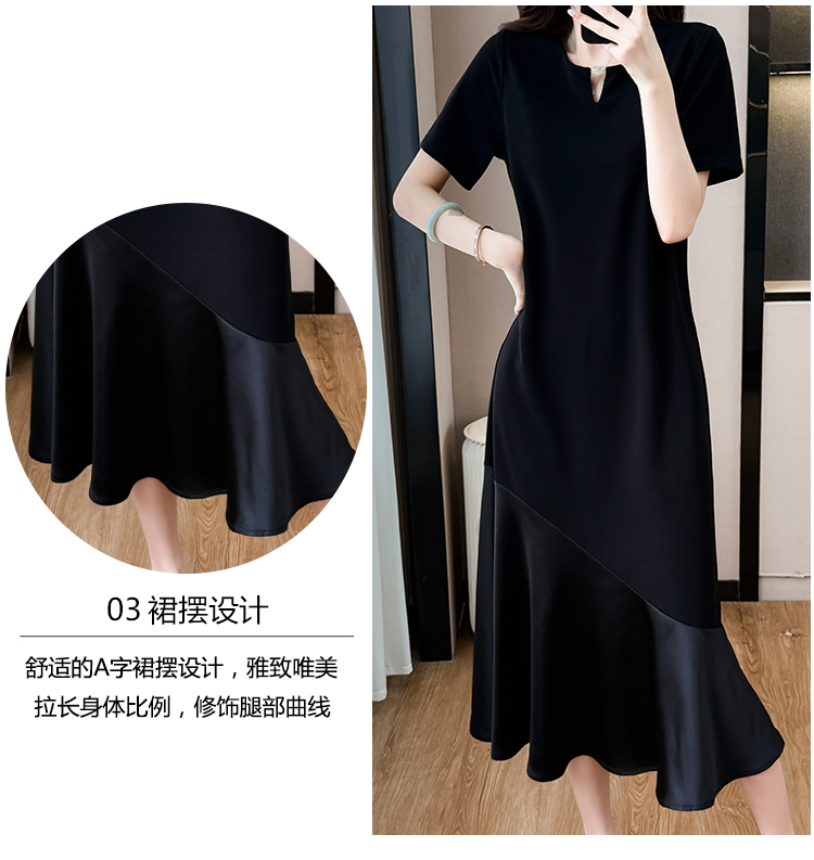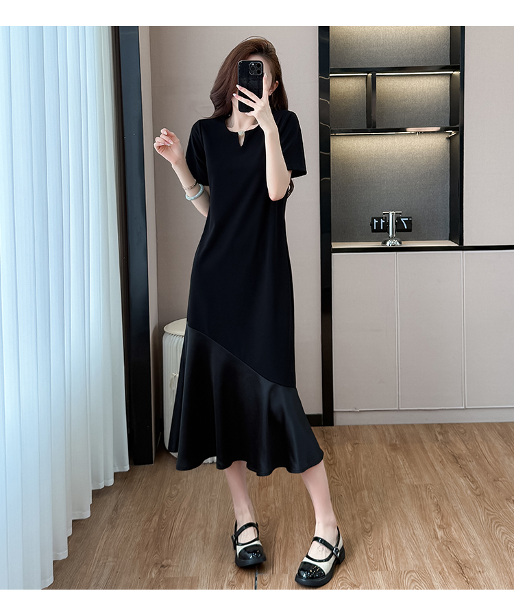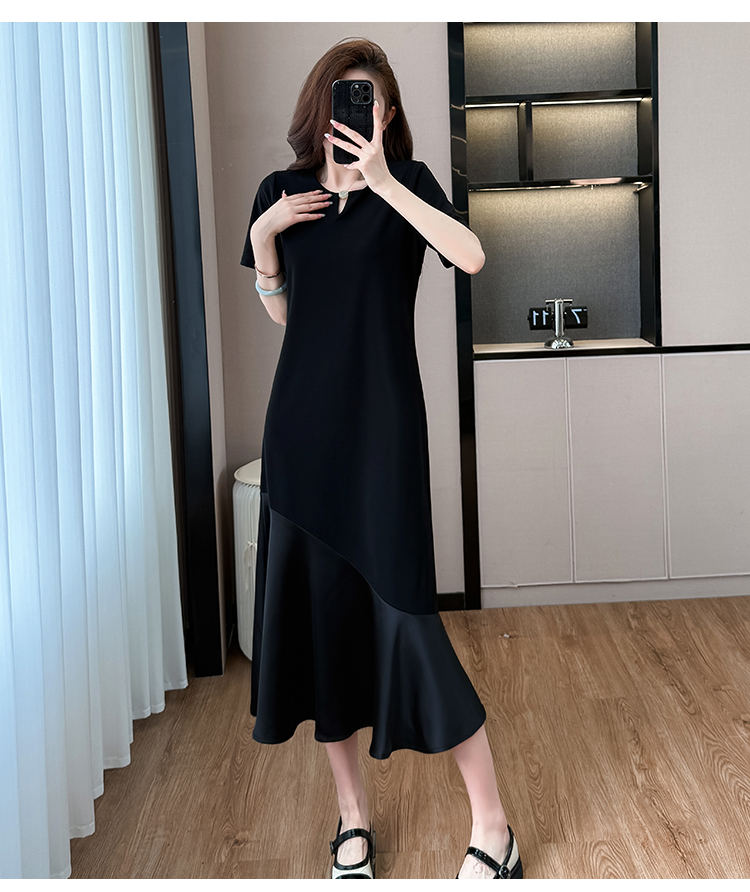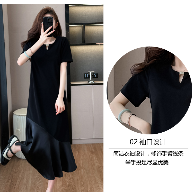 실사 패치워크 여성 드레스 여름 네클라인 구슬 장식 루즈핏 슬림해 보이는 중간 길이 빅 사이즈 티셔츠 치마
