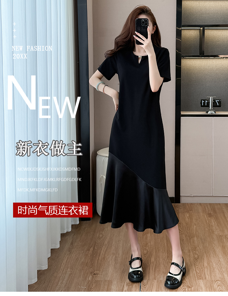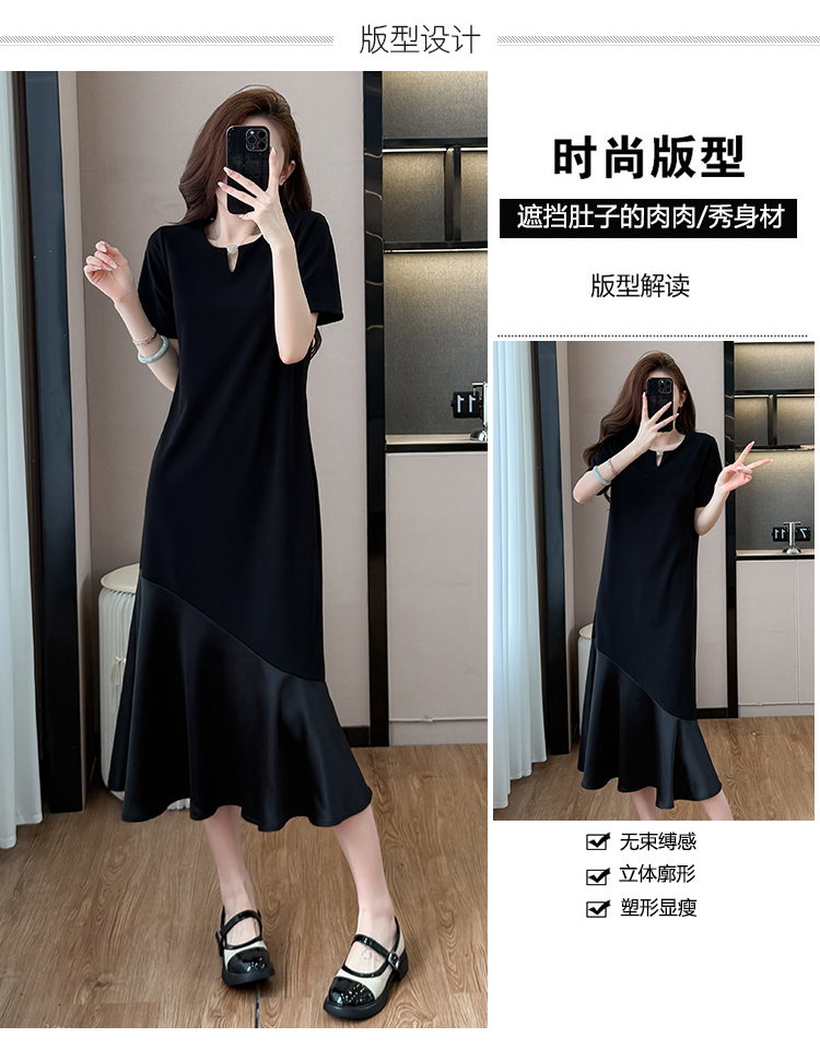 실사 작은 키 구름 실 패치워크 드레스 슬림해 보이는 표지 고기 레이스 커프스 중간 길이 빅 사이즈 티셔츠 치마 여성 여름