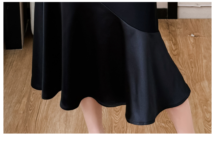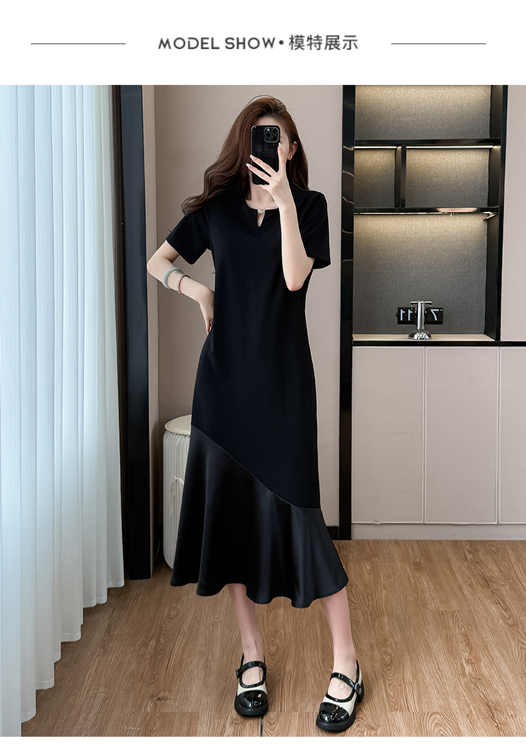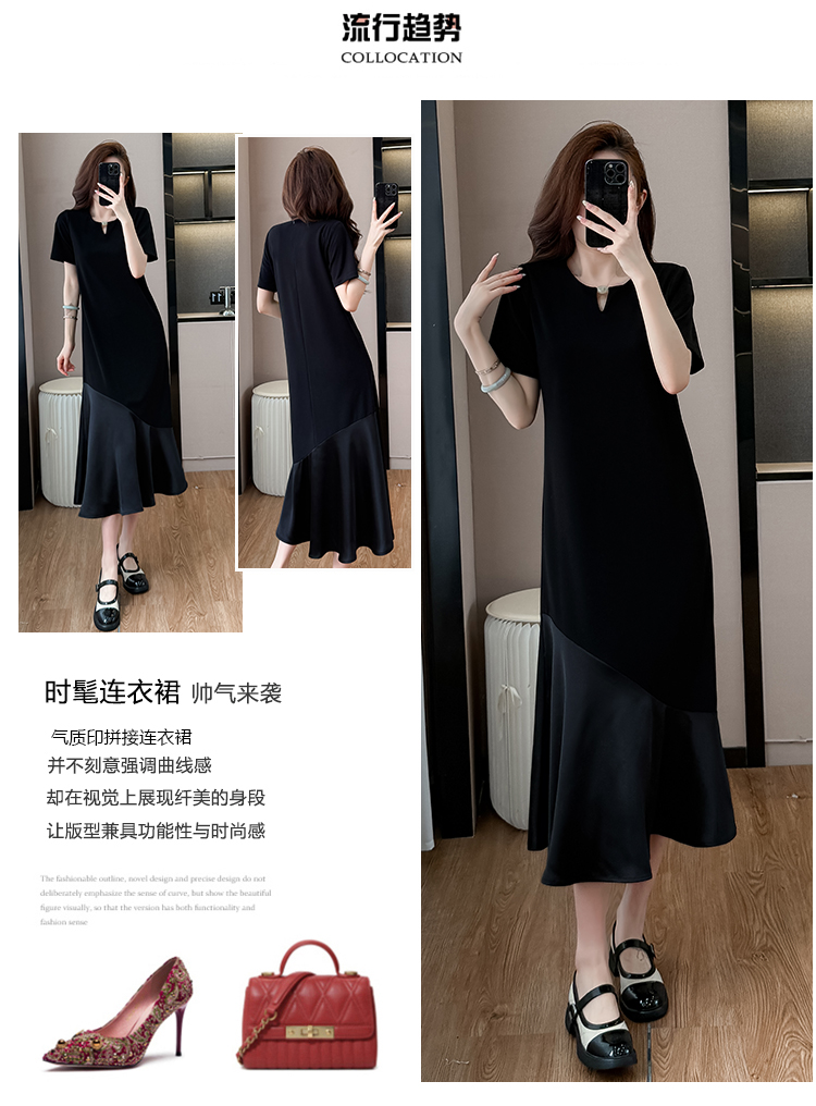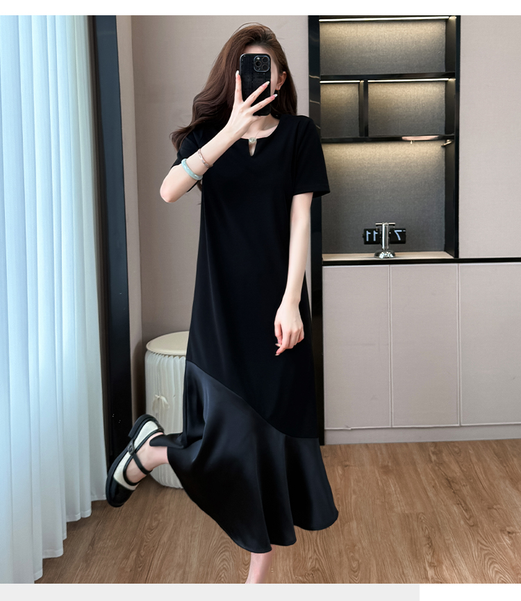 실사 무거운 작업 드레스 배색 패치워크 주름 장식 표지 고기 슬림해 보이는 트임 중간 길이 빅 사이즈 티셔츠 치마