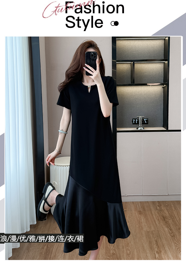 실사 2026 여름 새로운 드레스 중간 길이 티셔츠 치마 배색 패치워크 요정 가스 펄럭 이는 빅 사이즈 여성 드레스