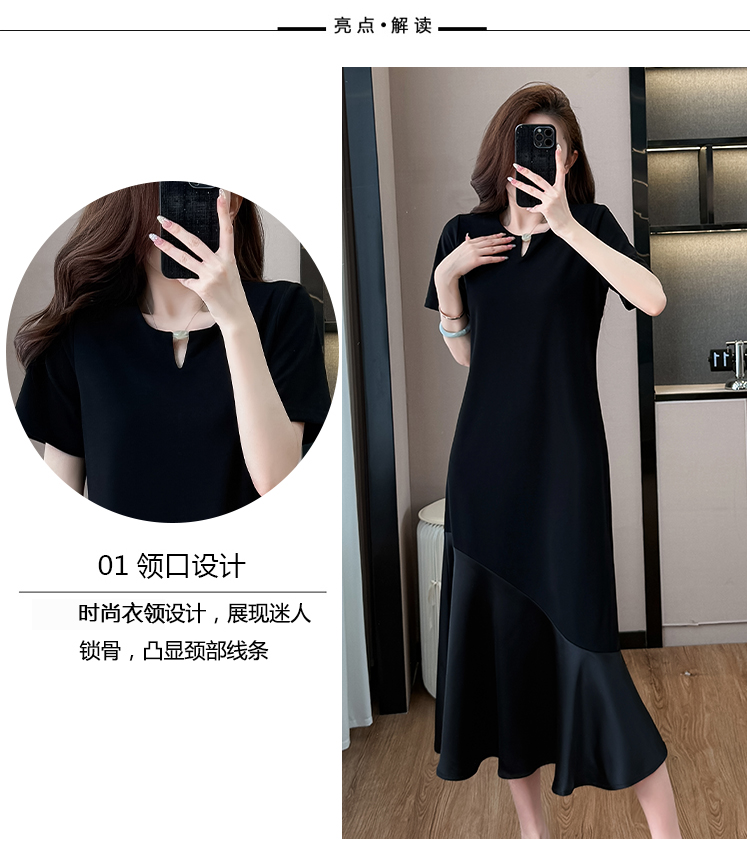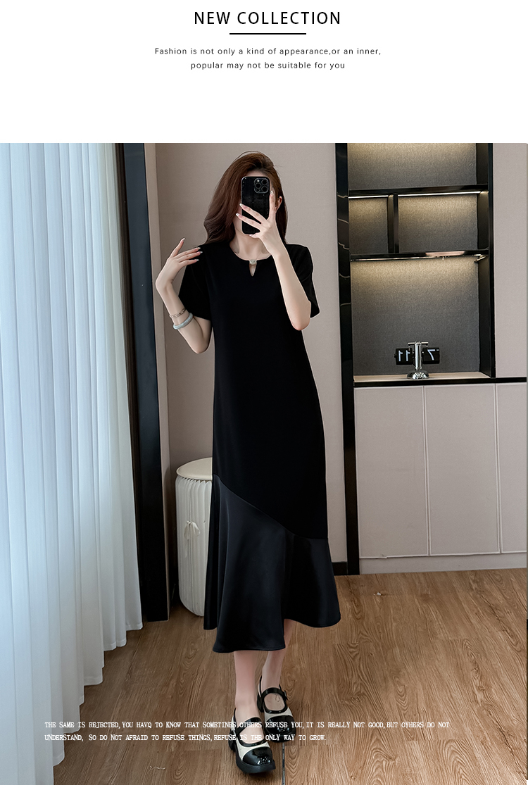 실사 홀로우 아웃 드레스 직선 통과 표지 고기 슬림해 보이는 트임 중간 길이 빅 사이즈 티셔츠 치마 여성 여름