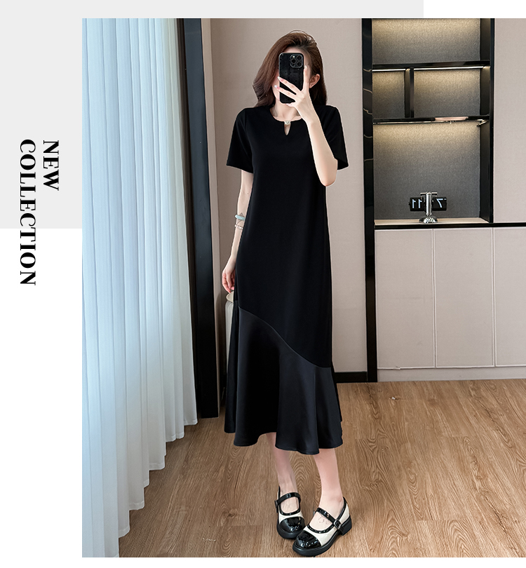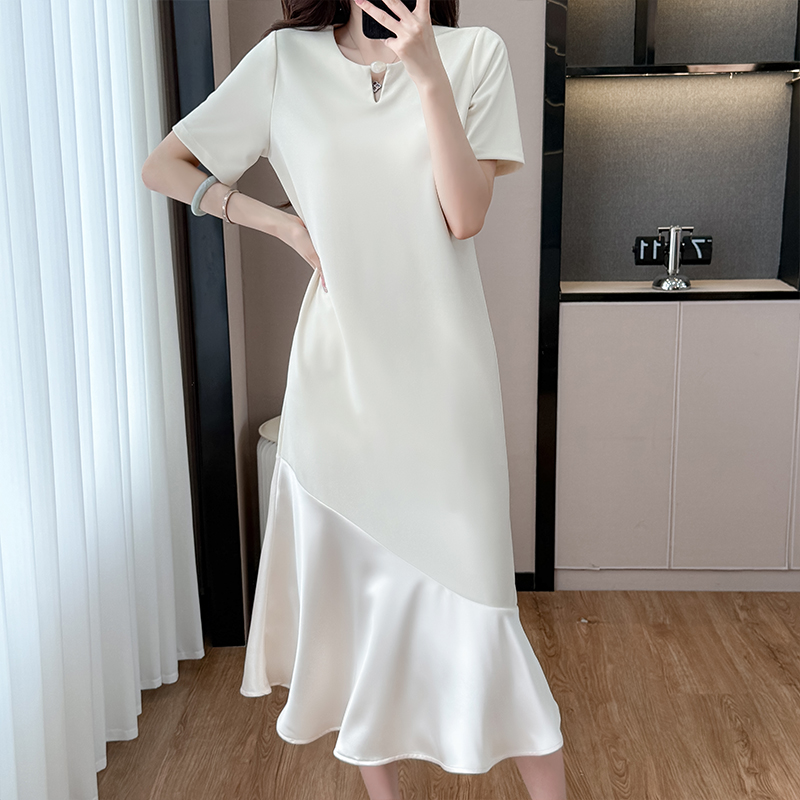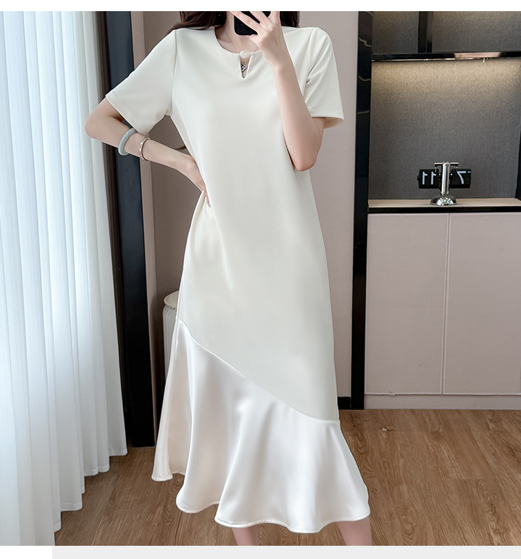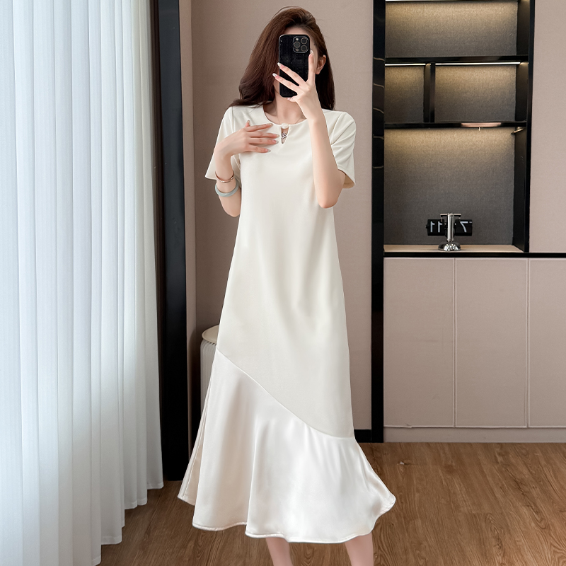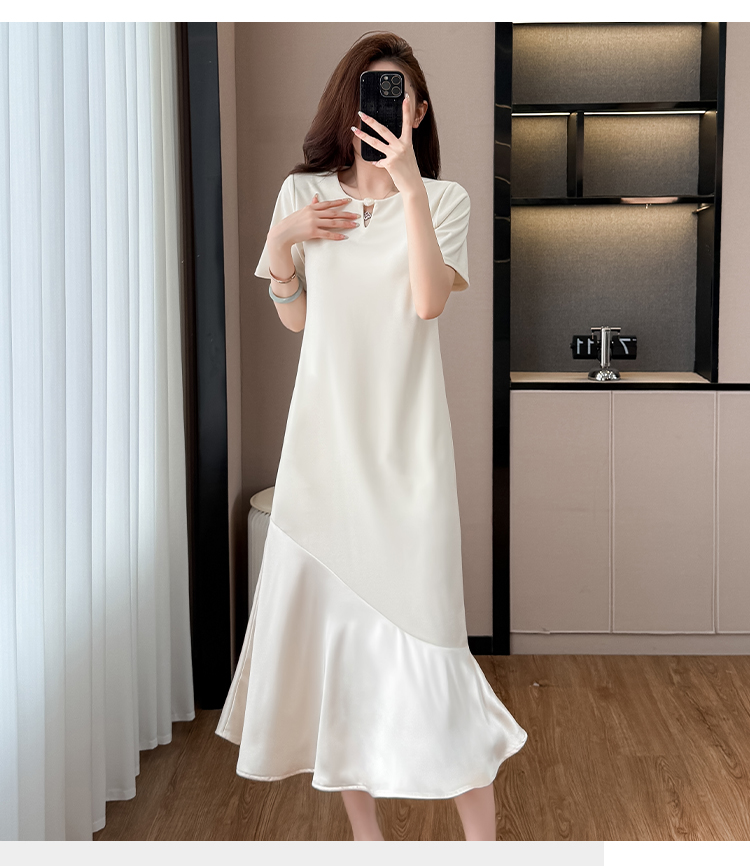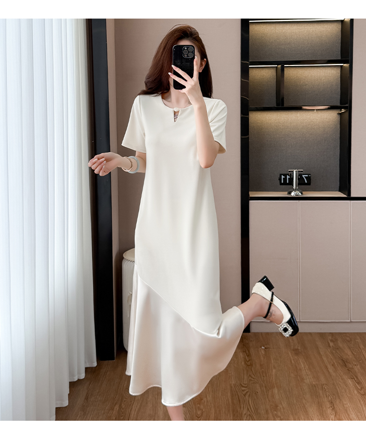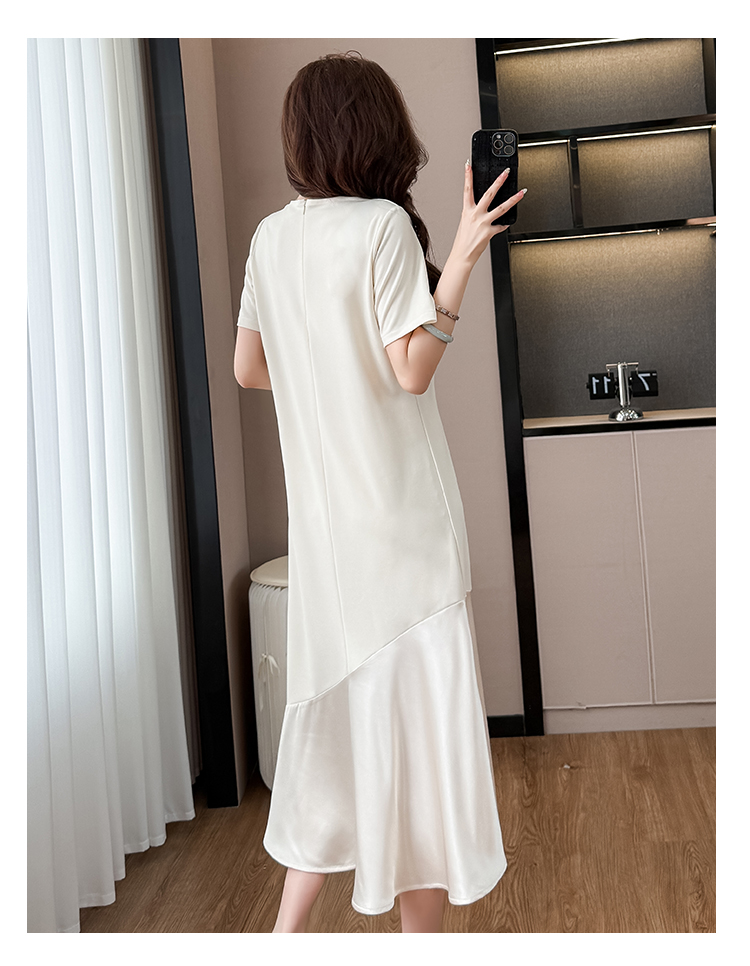 실사 패치워크 여성 드레스 여름 네클라인 구슬 장식 루즈핏 슬림해 보이는 중간 길이 빅 사이즈 티셔츠 치마