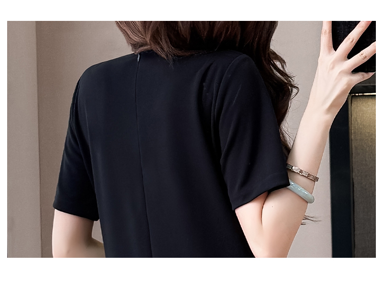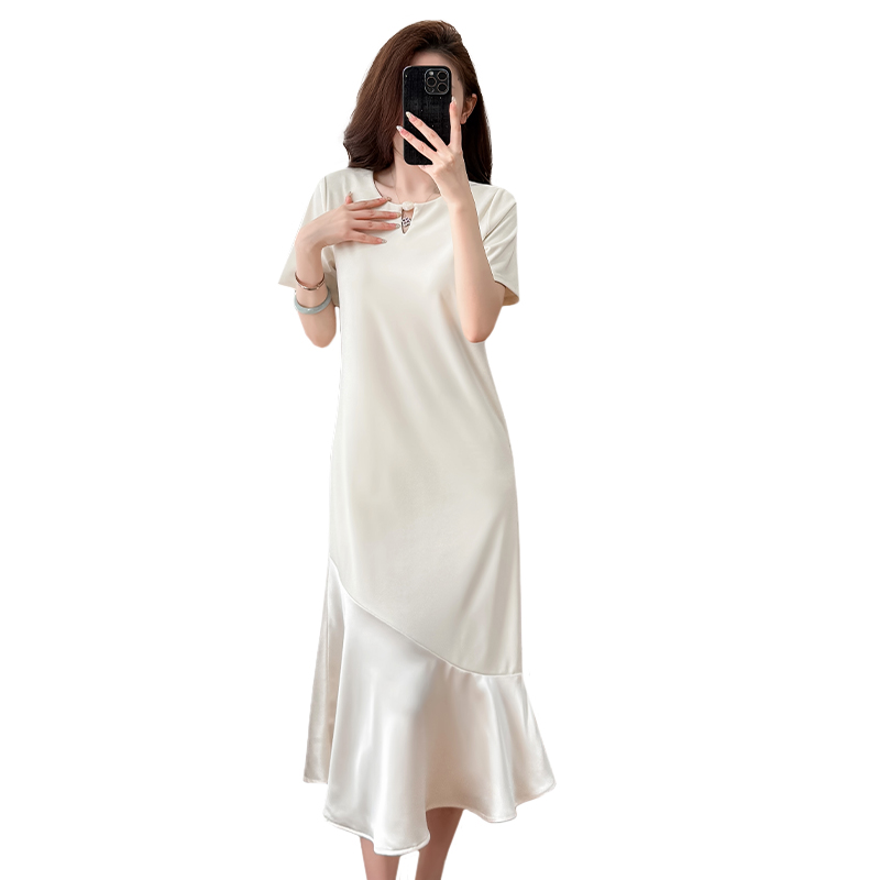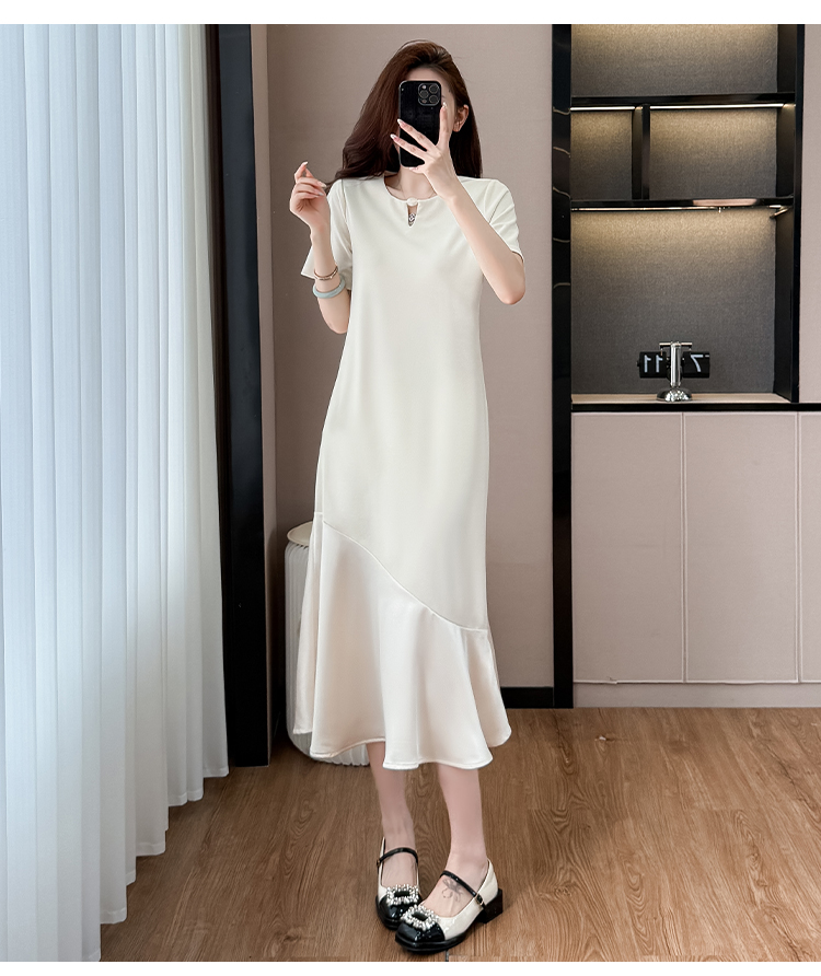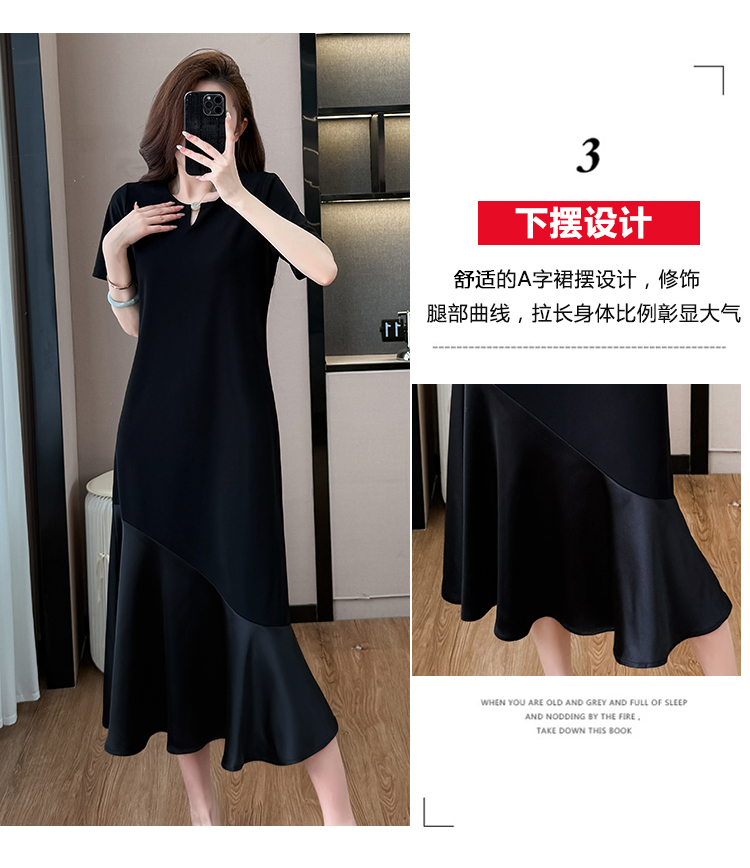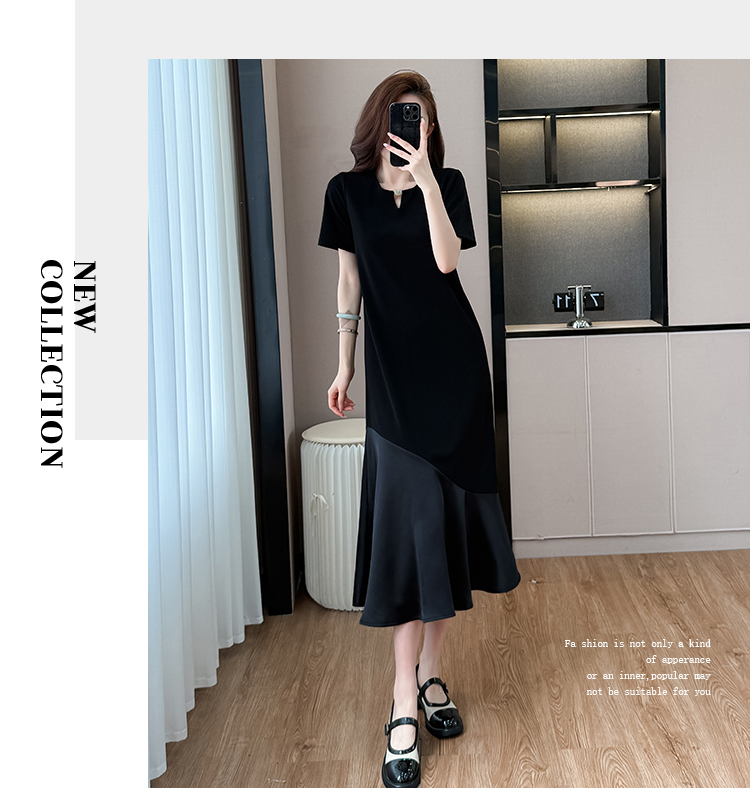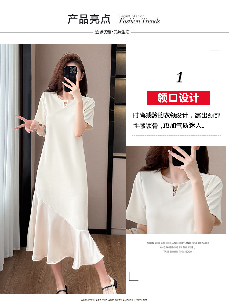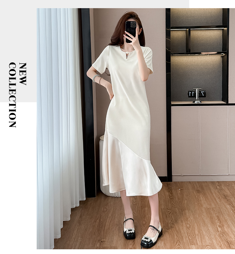 실사 패치워크 여성 드레스 여름 네클라인 구슬 장식 루즈핏 슬림해 보이는 중간 길이 빅 사이즈 티셔츠 치마