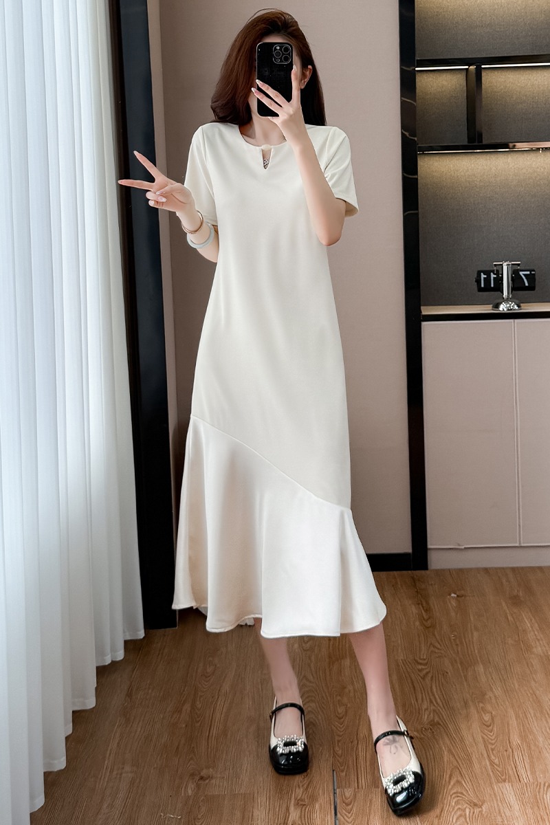 실사 홀로우 아웃 드레스 직선 통과 표지 고기 슬림해 보이는 트임 중간 길이 빅 사이즈 티셔츠 치마 여성 여름