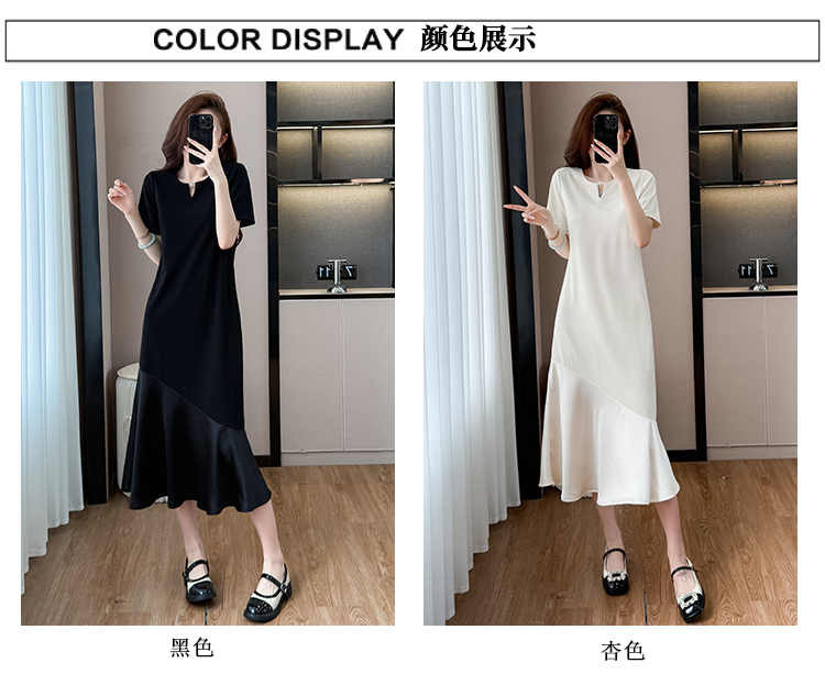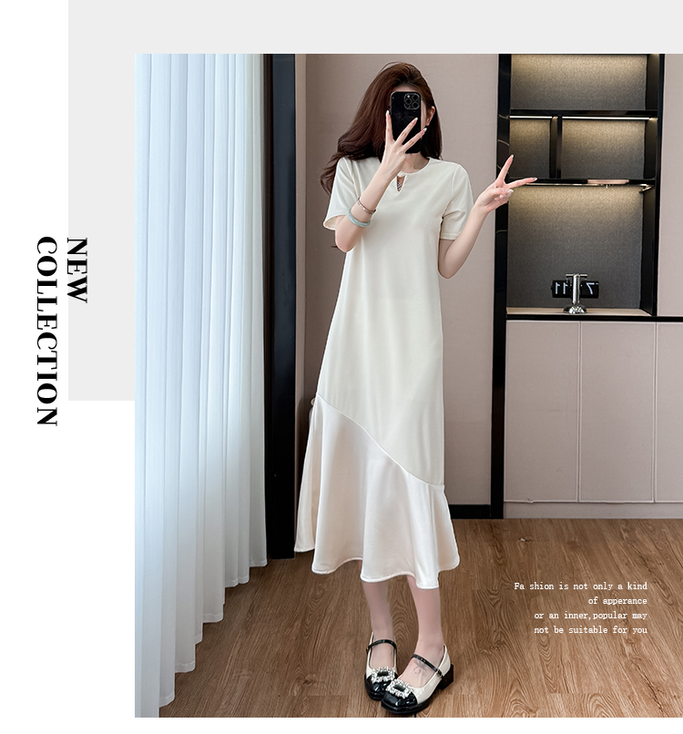 실사 2026 여름 새로운 드레스 중간 길이 티셔츠 치마 배색 패치워크 요정 가스 펄럭 이는 빅 사이즈 여성 드레스