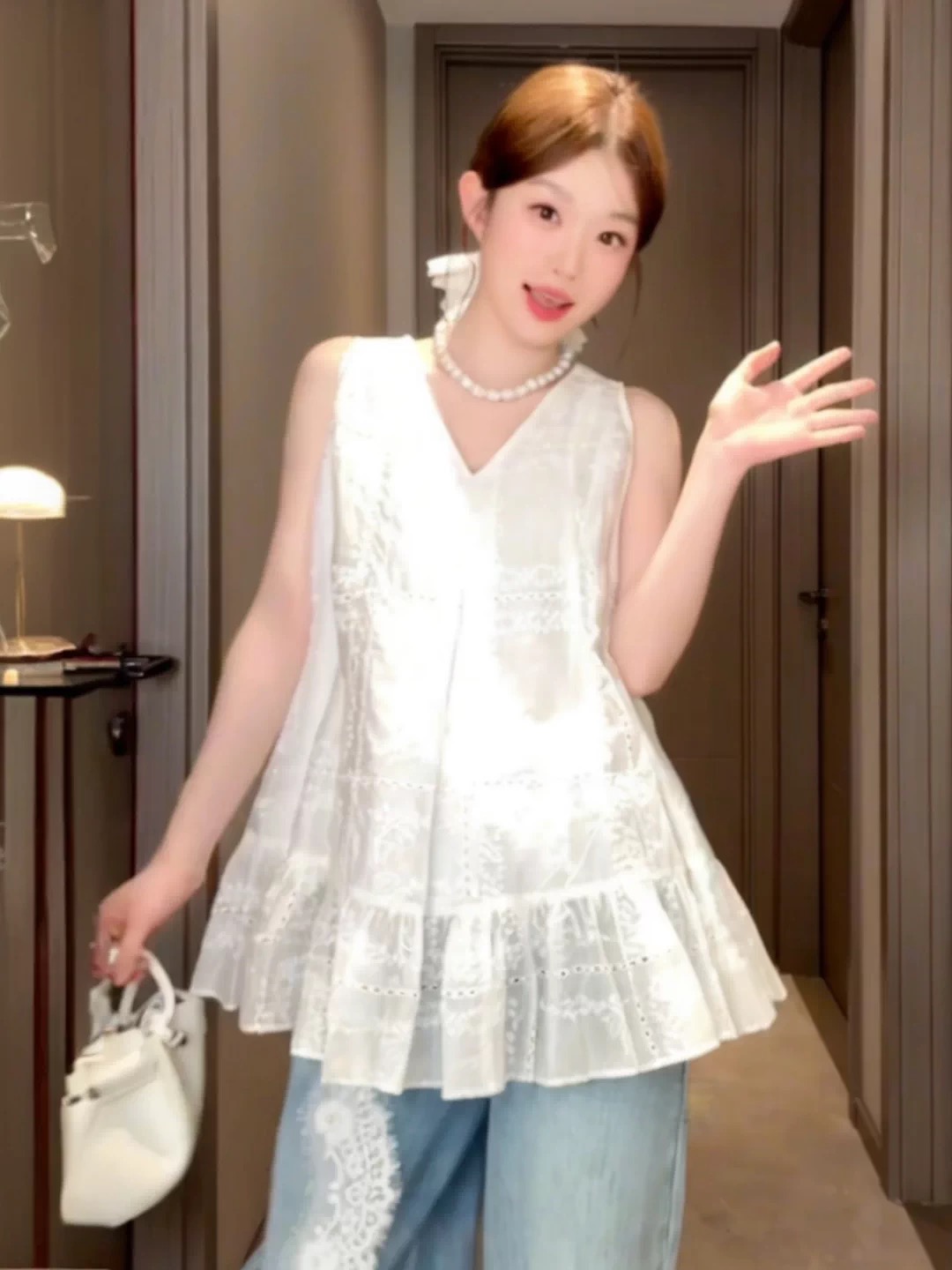 화이트 레이스 밑단 V넥 긍정적 인 어깨 반팔 티셔츠 여성 2026 여름 빅 사이즈 지방 mm 슬림해 보이는 고유 한 슈퍼 잘 생긴 맨위