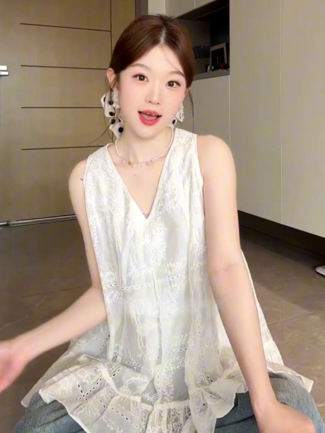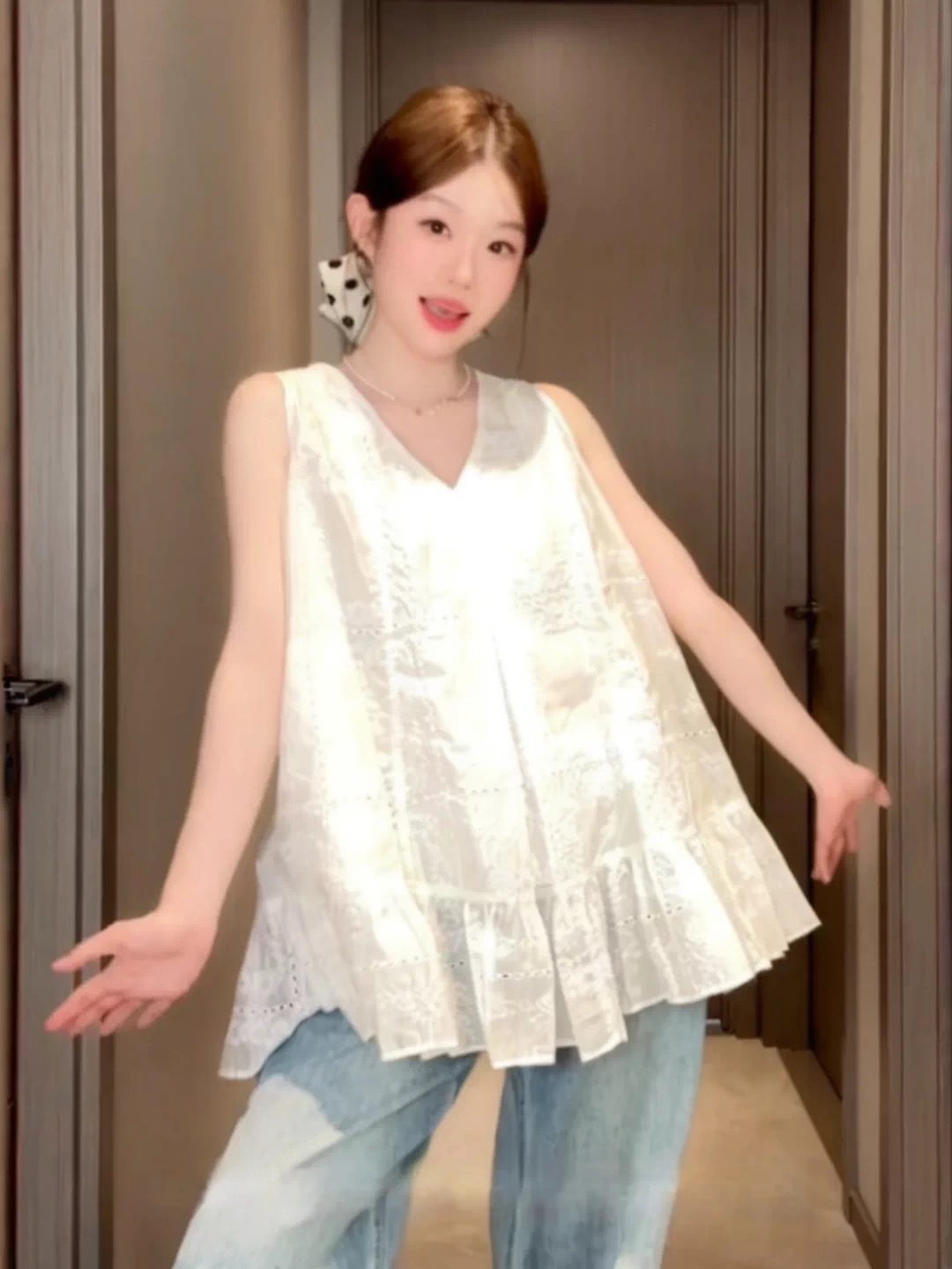 여름 레트로 해변가 휴가 바람 마이크로 ~을 통해 헤일로 염색 여성 셔츠 루즈핏 슬림해 보이는 프릴 자외선 차단 V넥 맨위