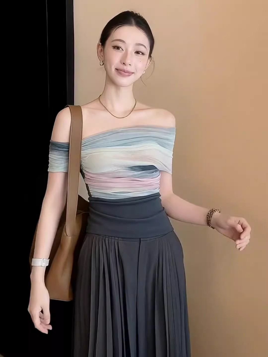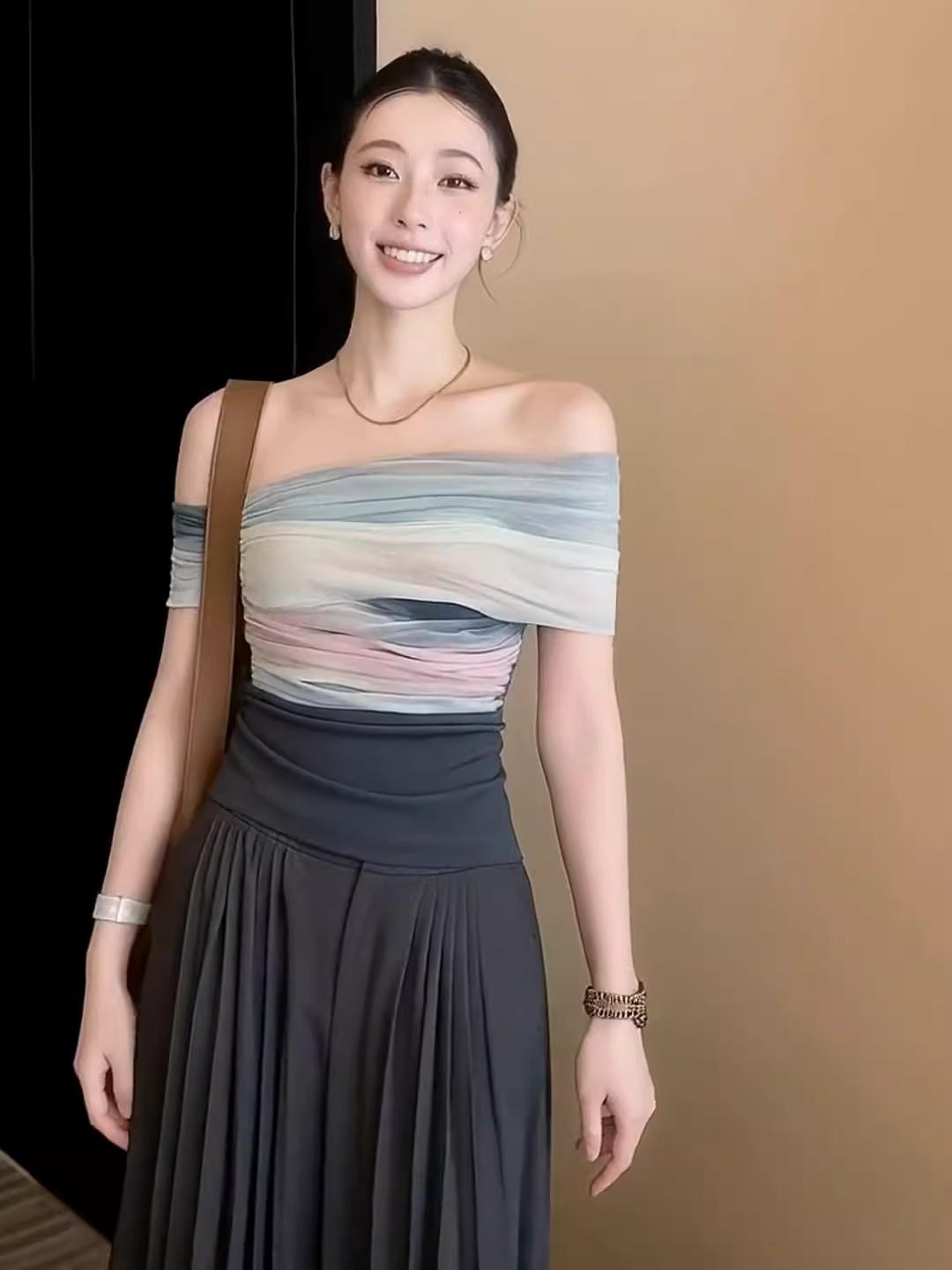 아름다운 헤일로 염색 망사 패치워크 오프숄더 맨위 여성 2026 새로운 여름 고급 센스 주름 허리 수축 티셔츠