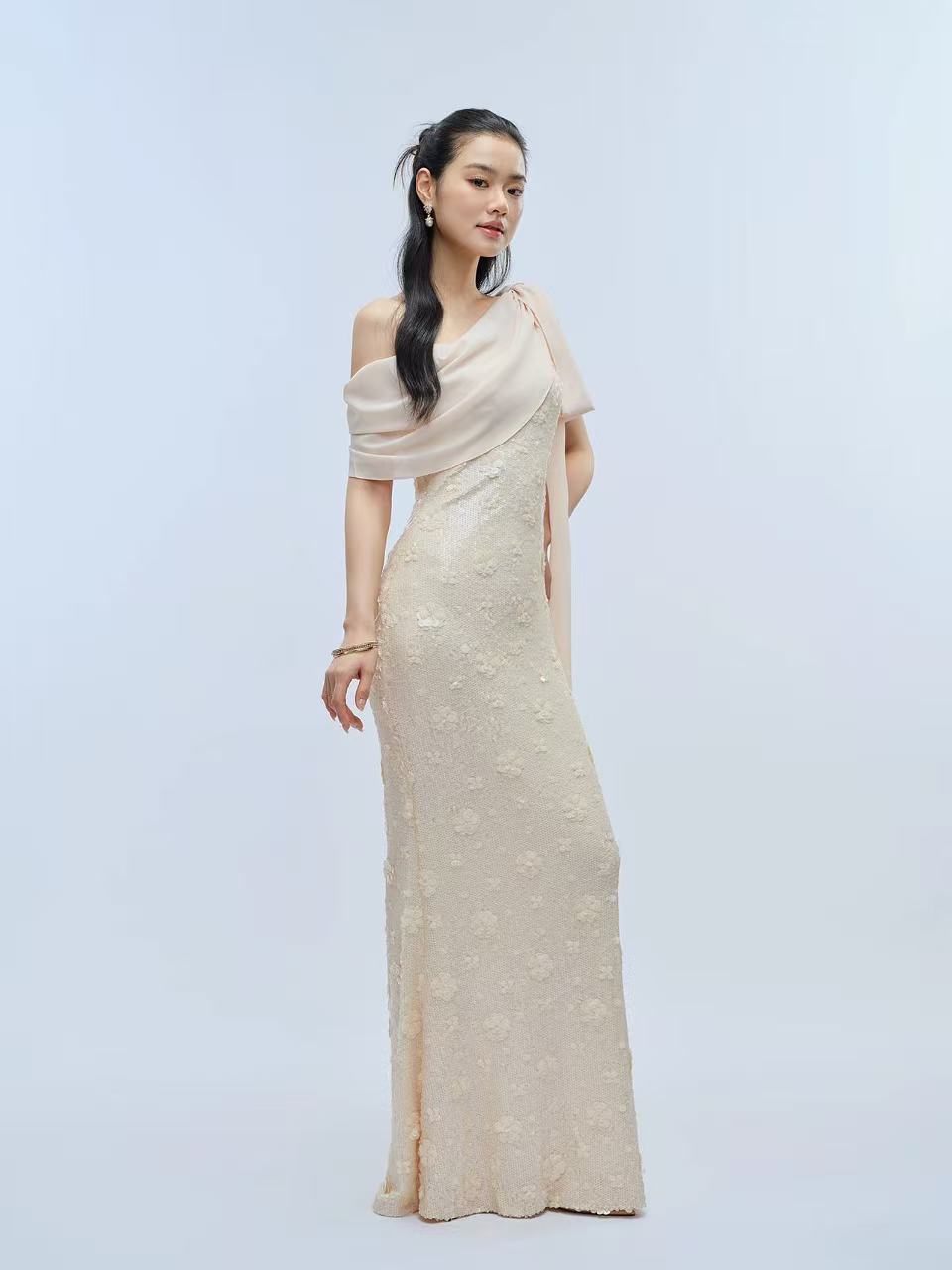 프랑스식 빛 럭셔리 바람 새틴 이슬 허리 디자인 고급 센스 연회 품격 이브닝 드레스 롱 스커트
