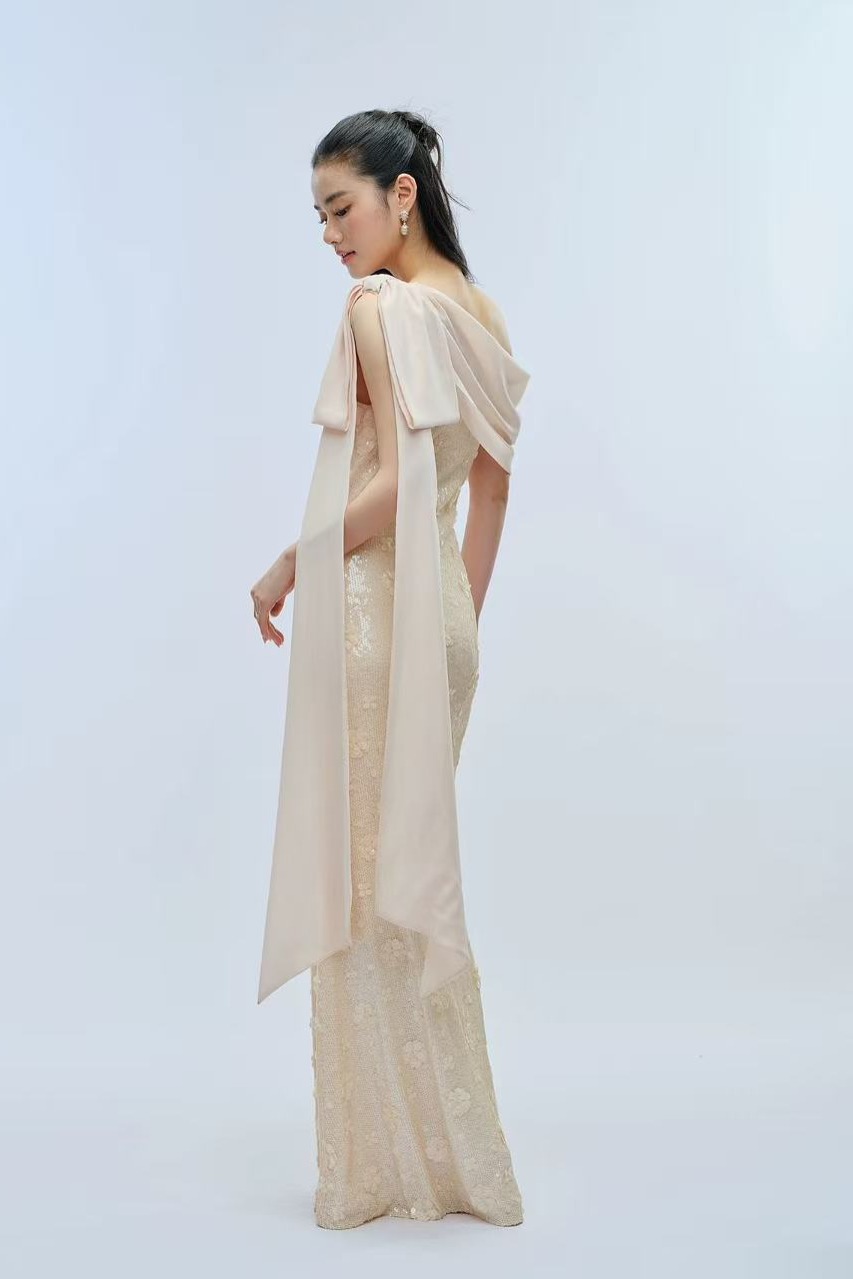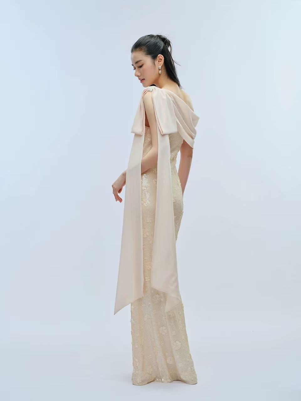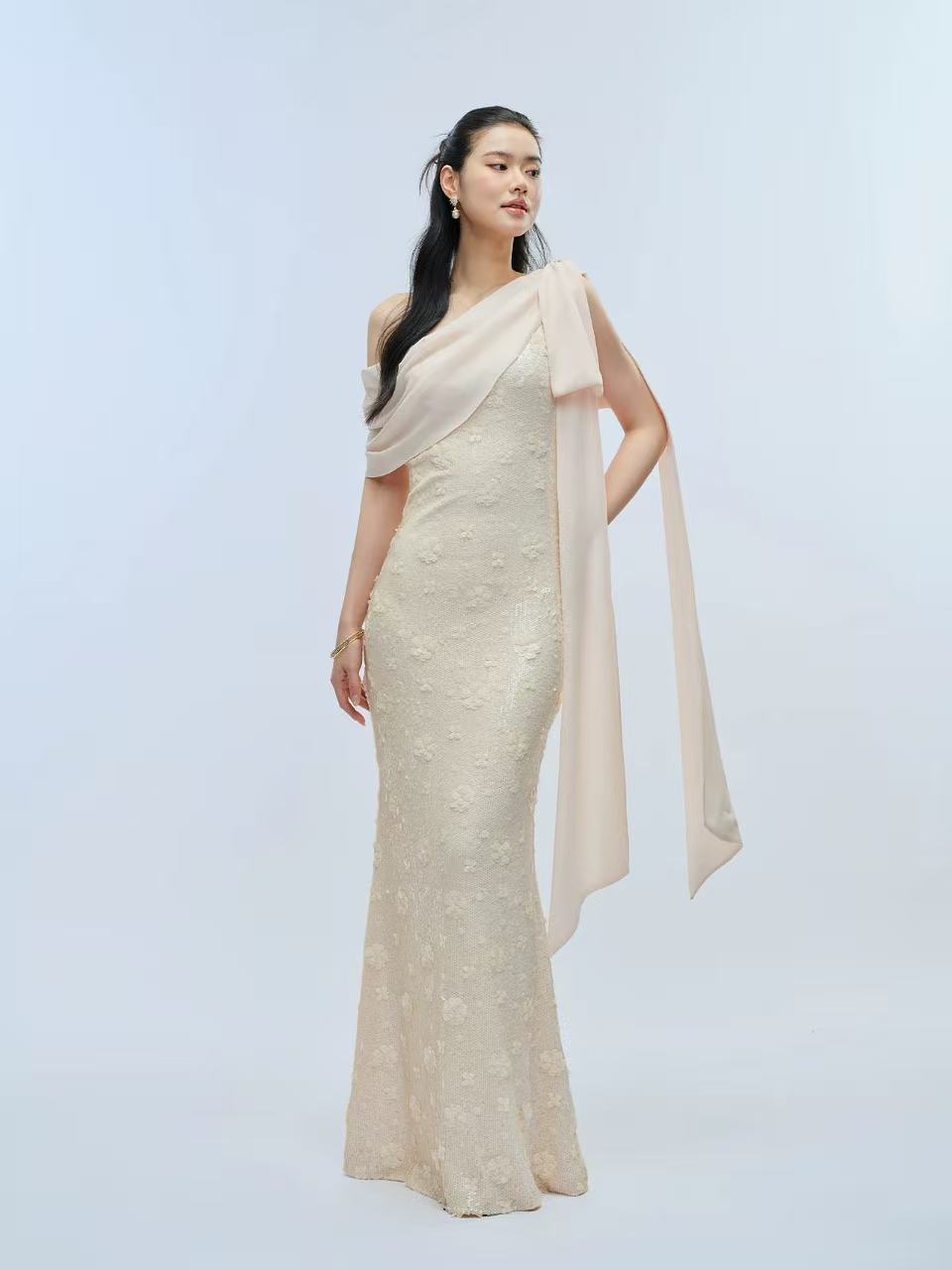 나비 크 사이 비스듬한 어깨 스팽글 신축성 몸매 가꾸기 롱 스커트 나비 매듭 쉬폰 리본 드레스
