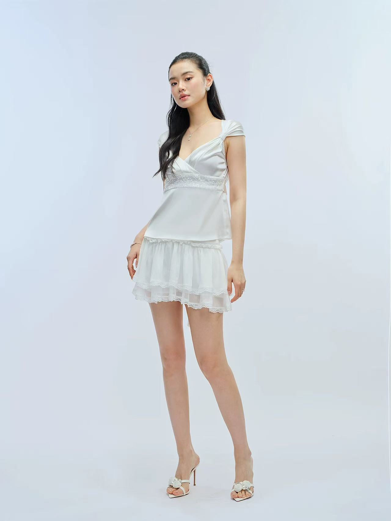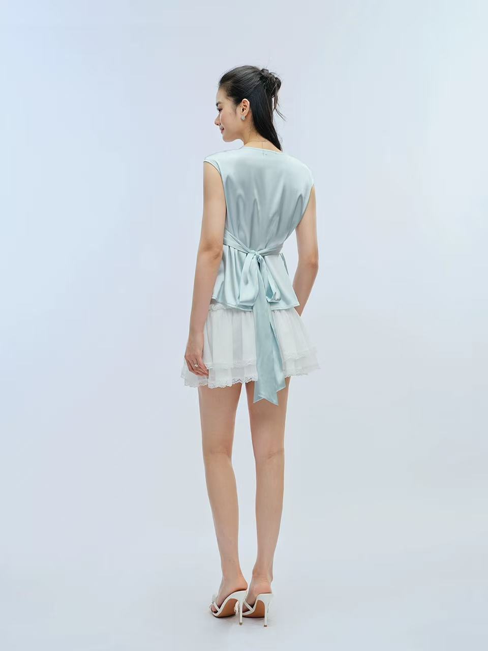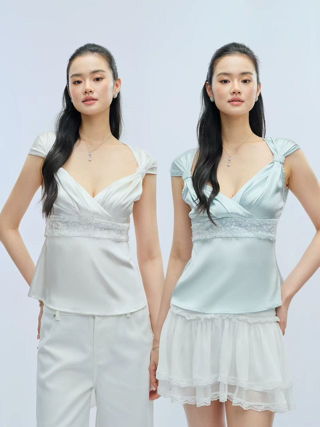 부드러운 시간 새틴 비즈 박기 패치워크 V넥 스트랩 허리 수축 조끼 맨위