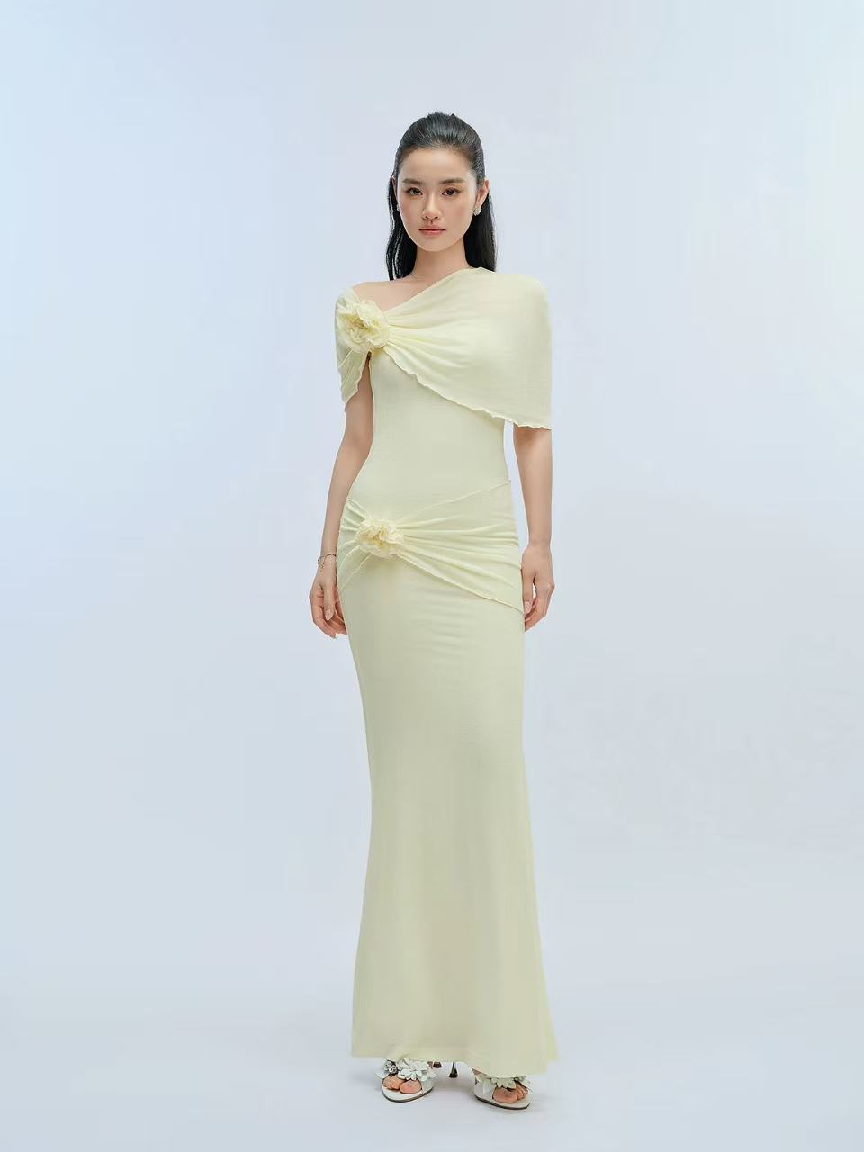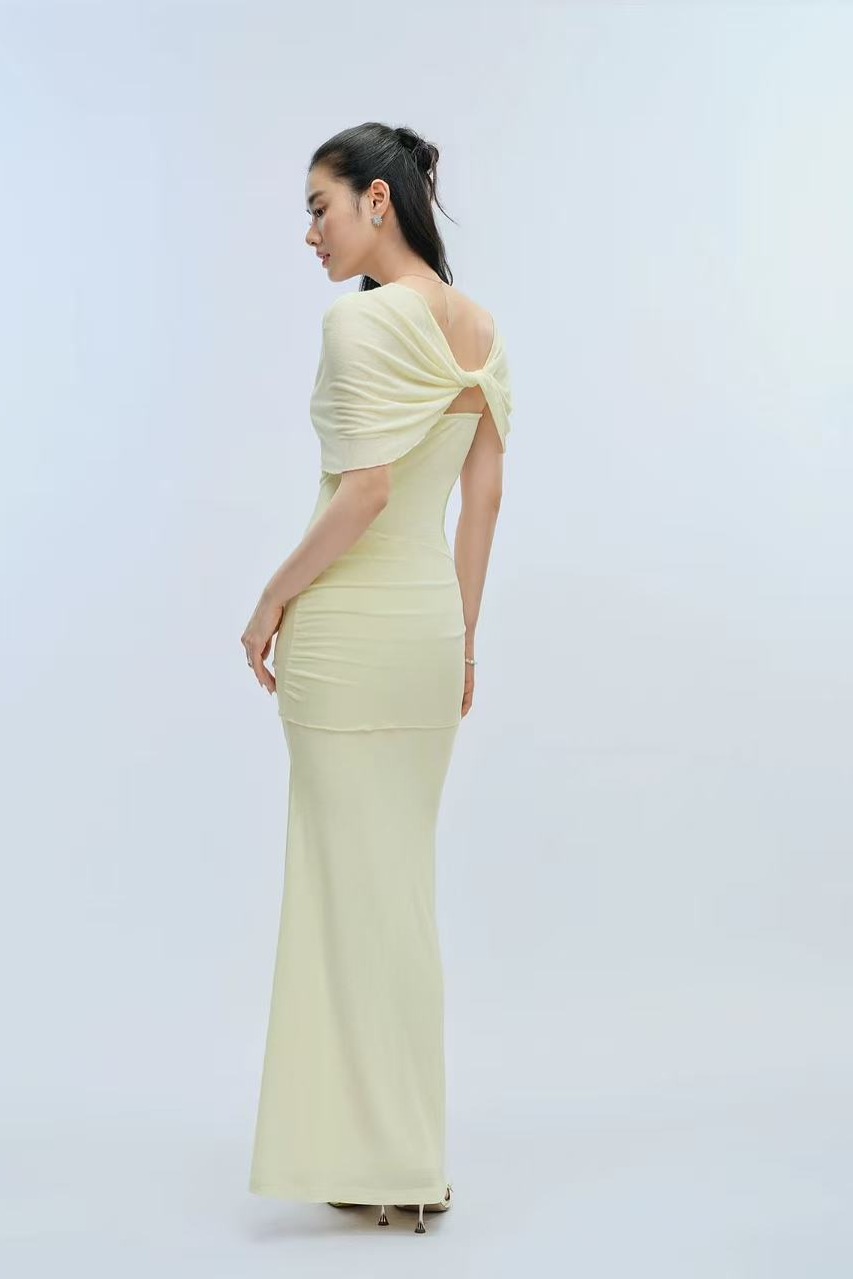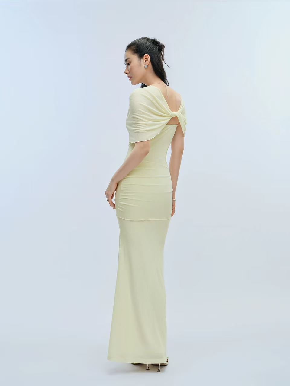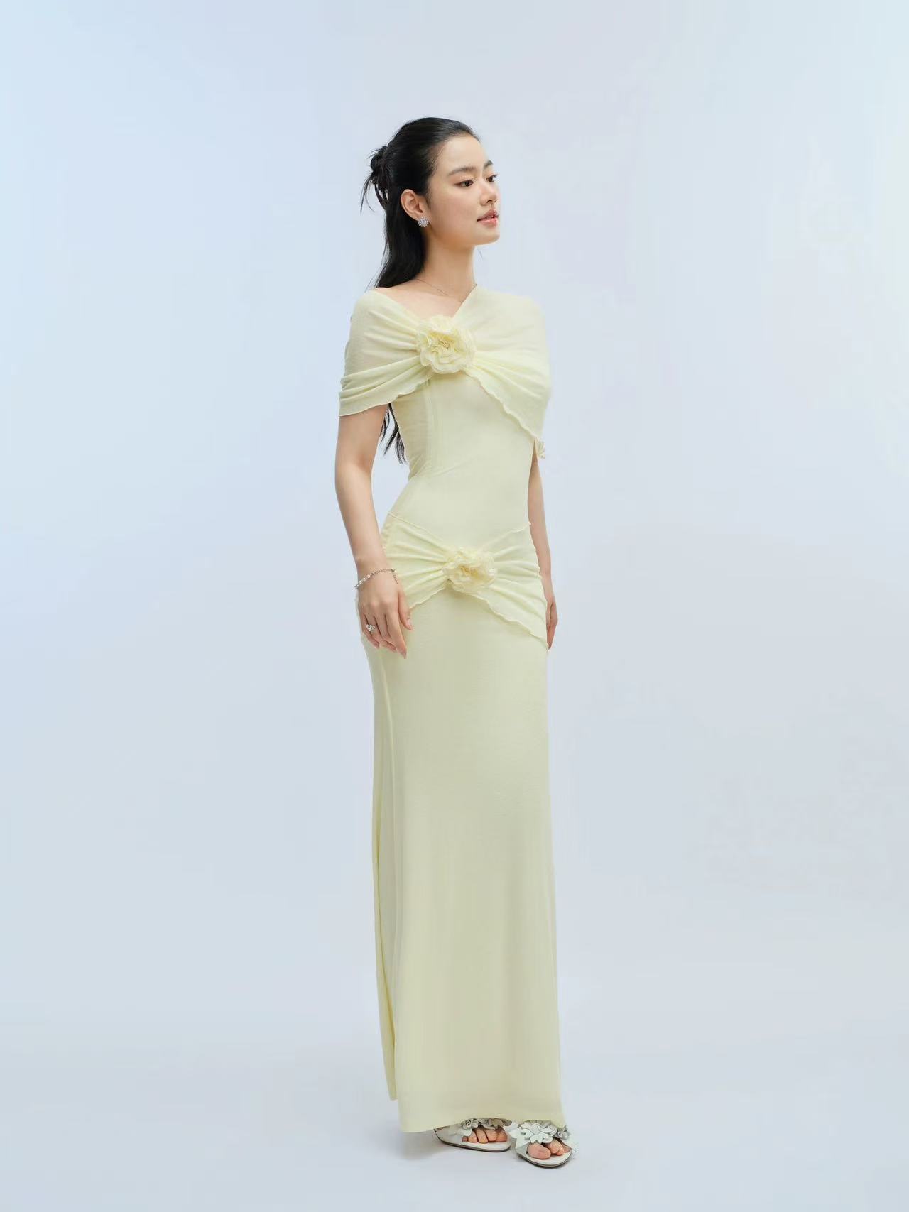 나비 크 사이 비스듬한 어깨 스팽글 신축성 몸매 가꾸기 롱 스커트 나비 매듭 쉬폰 리본 드레스
