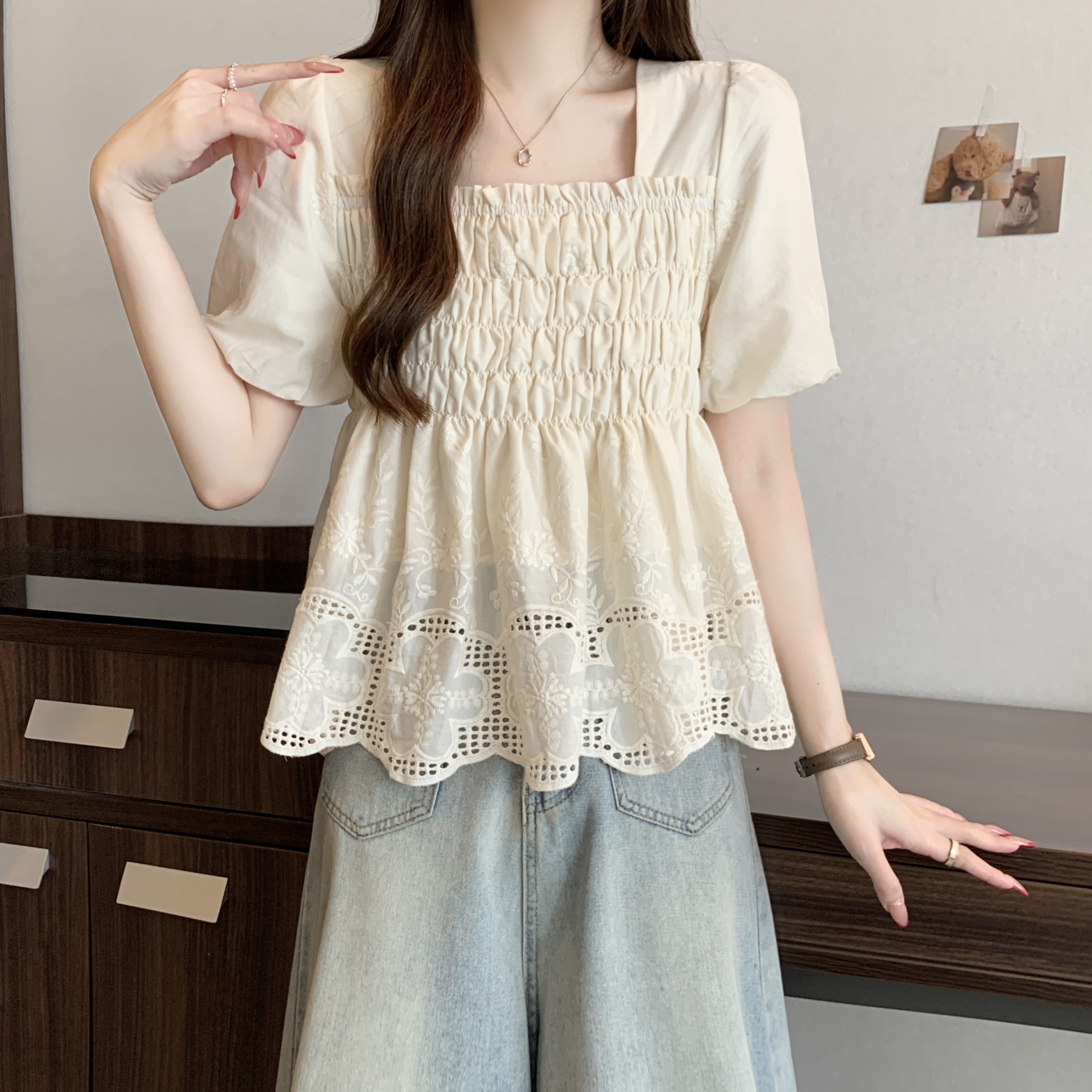 실사 2026 새로운 빅 사이즈 여성 의류 지방 mm 프랑스식 디자인 센스 인형 셔츠 광장 칼라 표지 배 슬림해 보이는 다용도 맨위