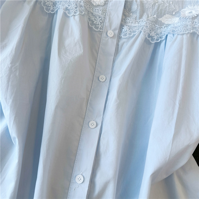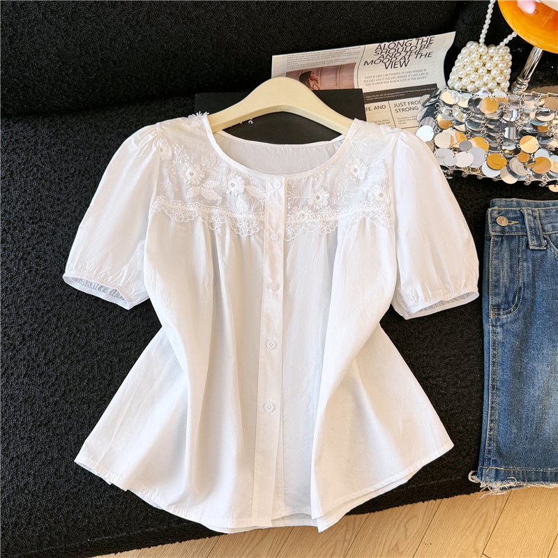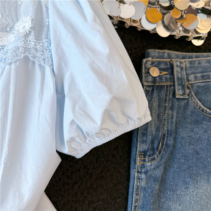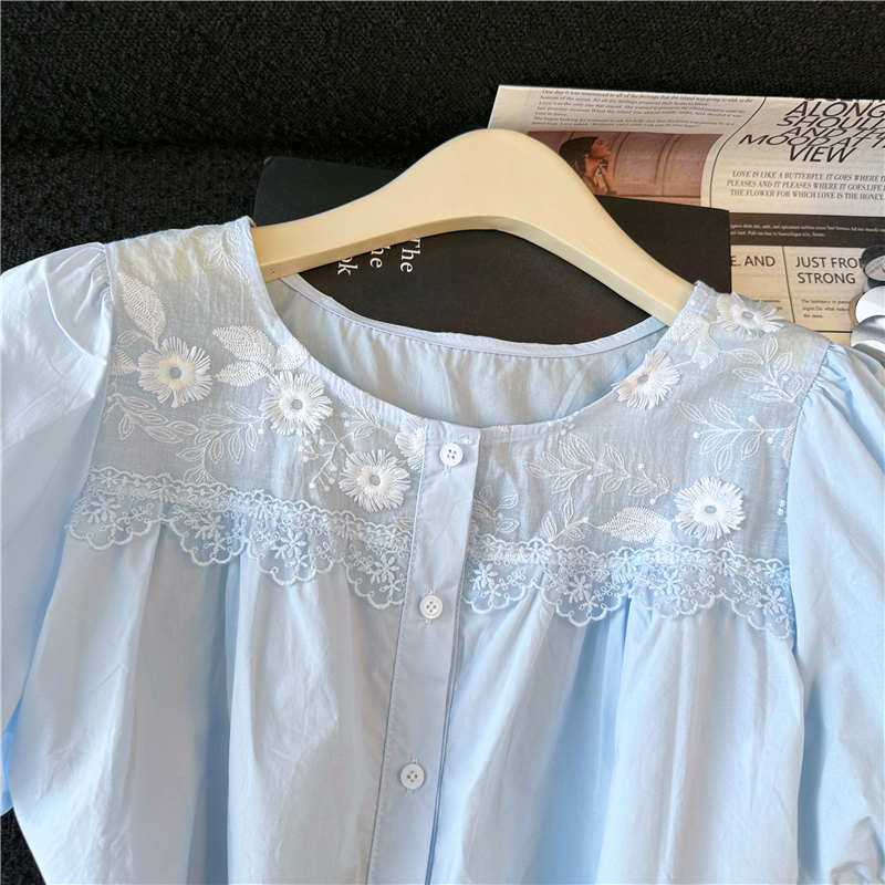 파란색 레이스 조각 자수 버블 반팔 셔츠 여성 의류 2026 여름 새로운 디자인 센스 아름다운 맨위