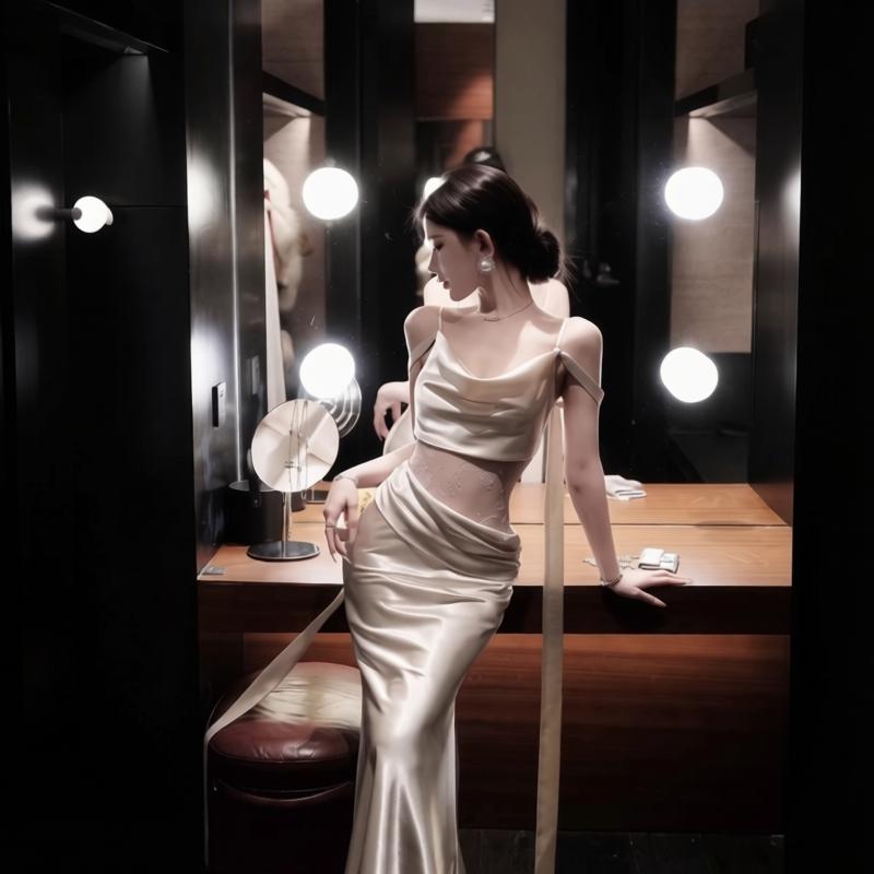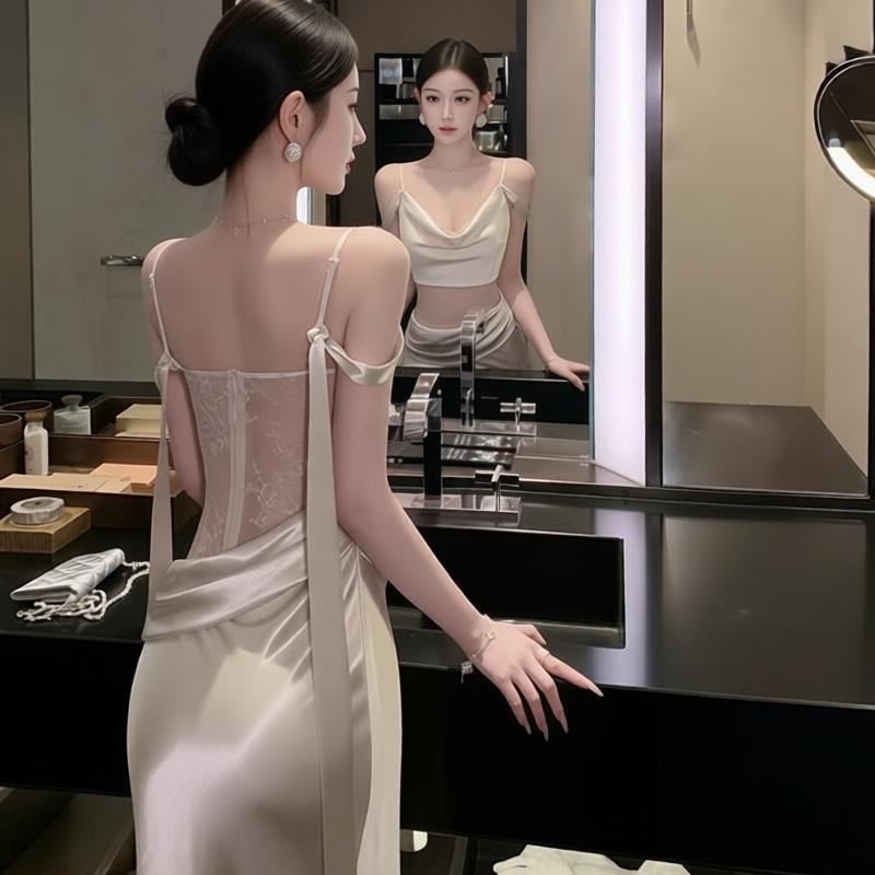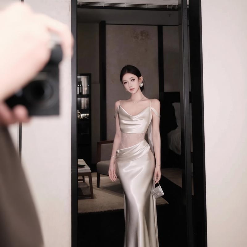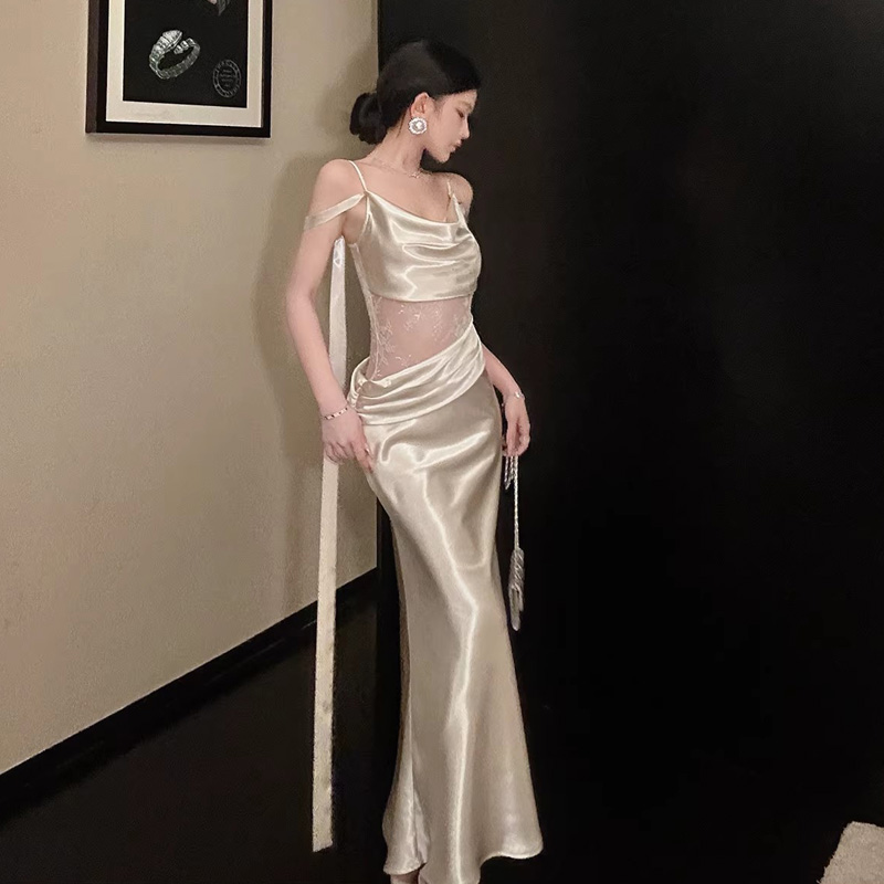 회화 솔루션 wahju 판매 부드러운 프랑스식 새틴 품격 비스듬한 어깨 천 금빛 바람 슬림해 보이는 한 마디 꼬집기 허리 드레스 봄
