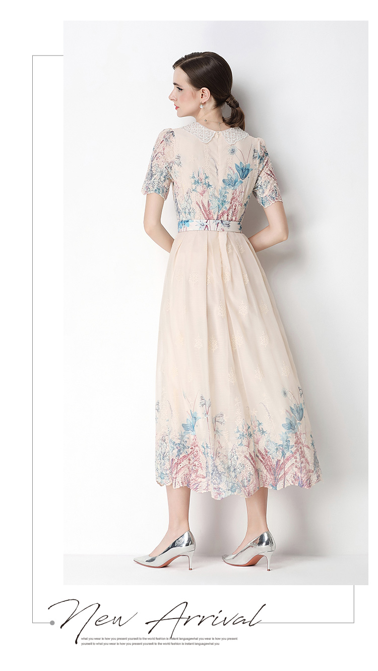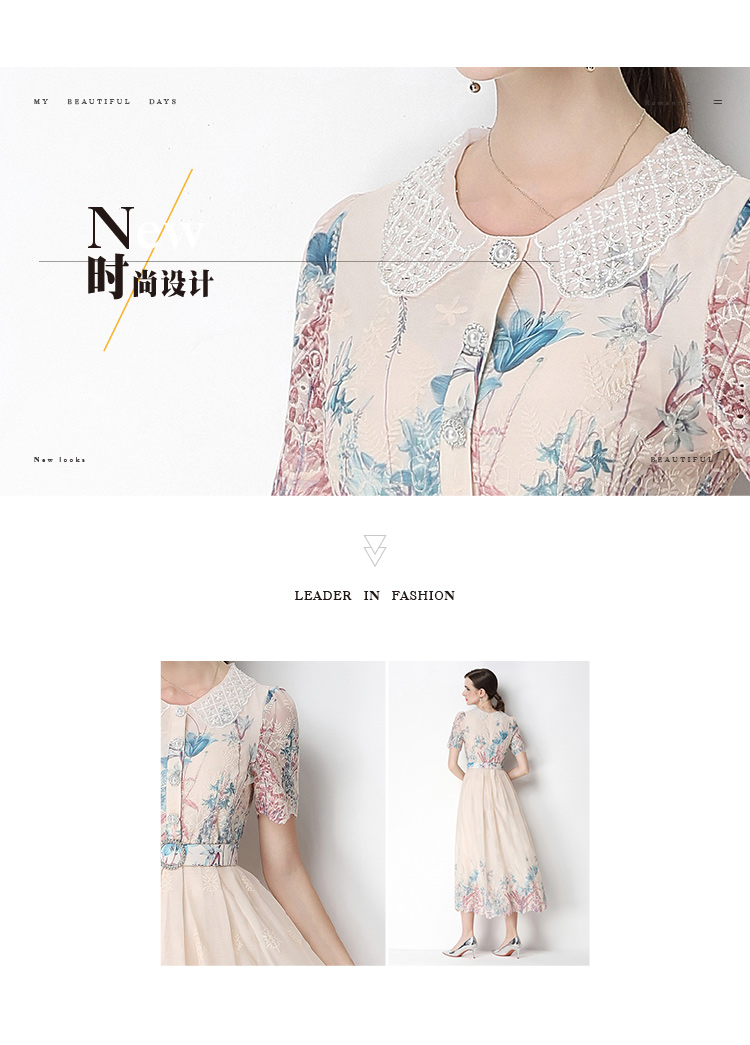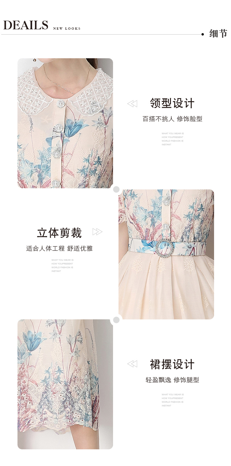 실사 반팔 슬림해 보이는 홀로우 아웃 물 용해 레이스 포지셔닝 중간 길이 드레스