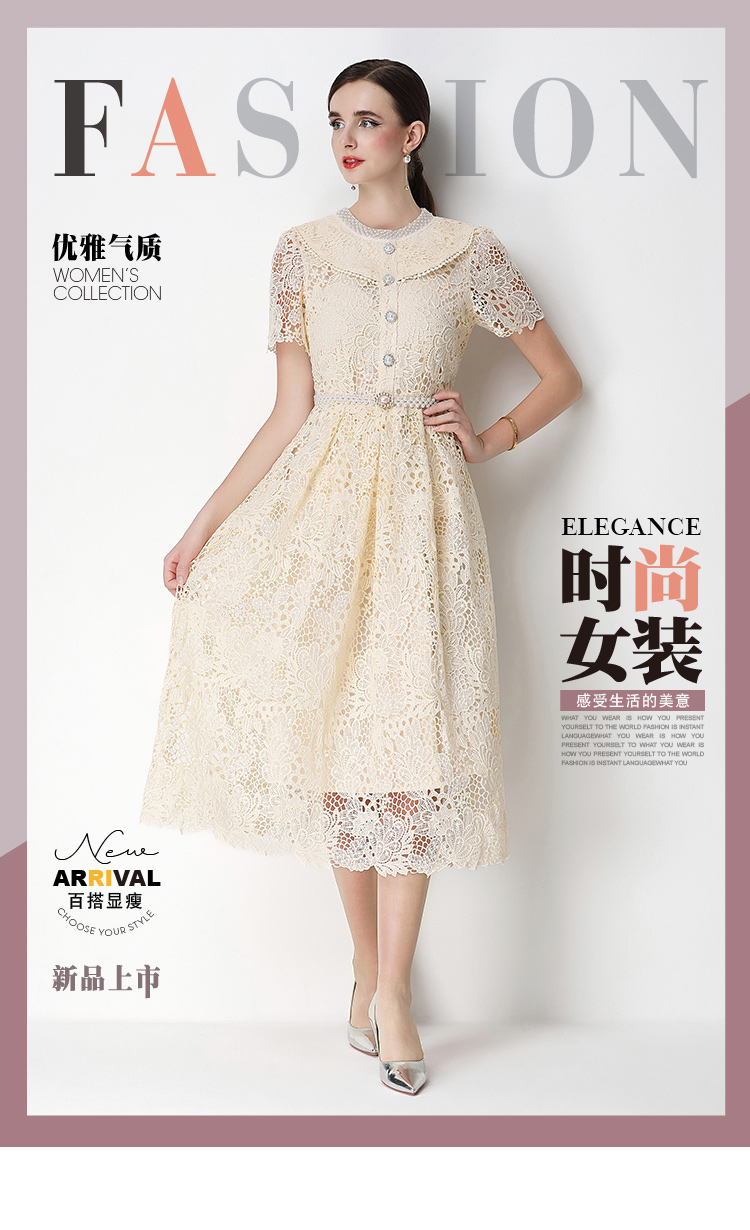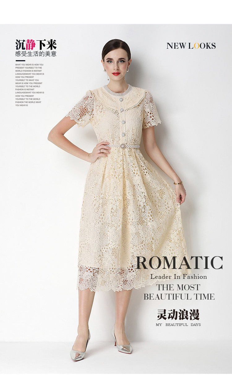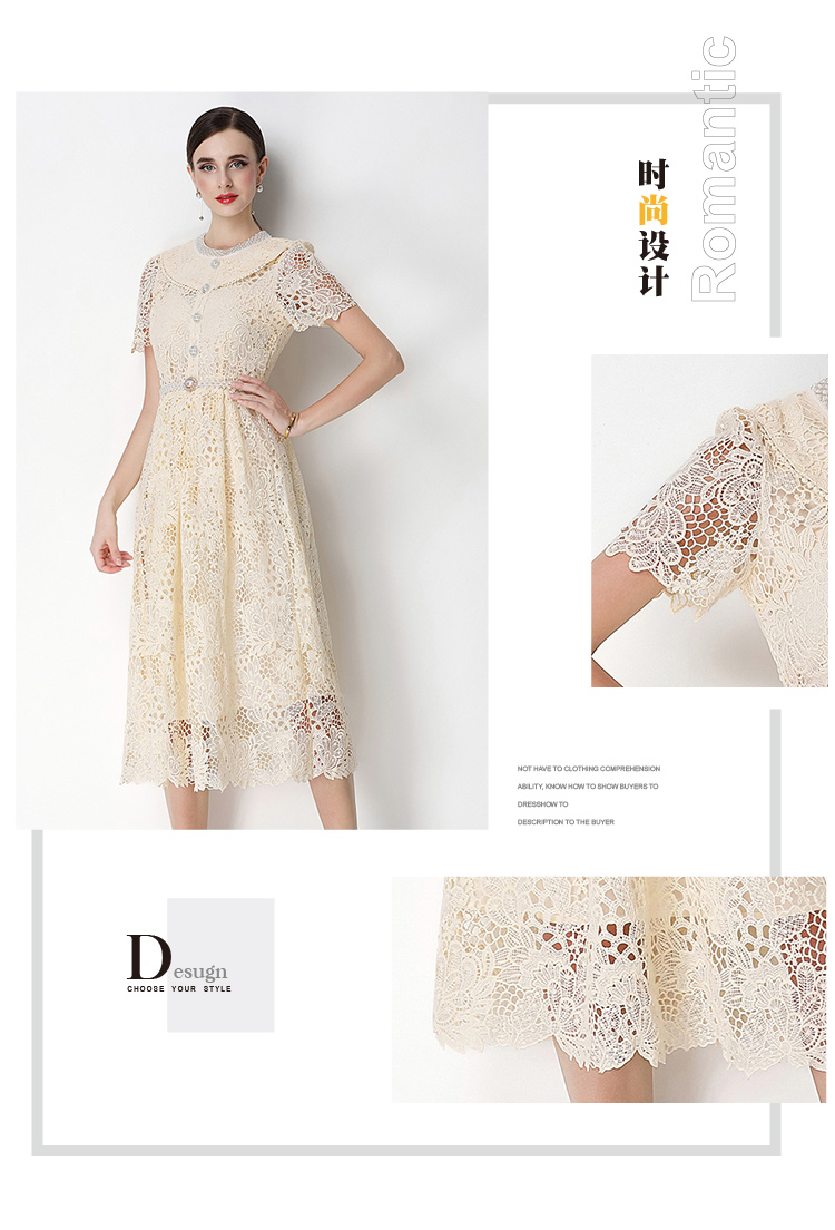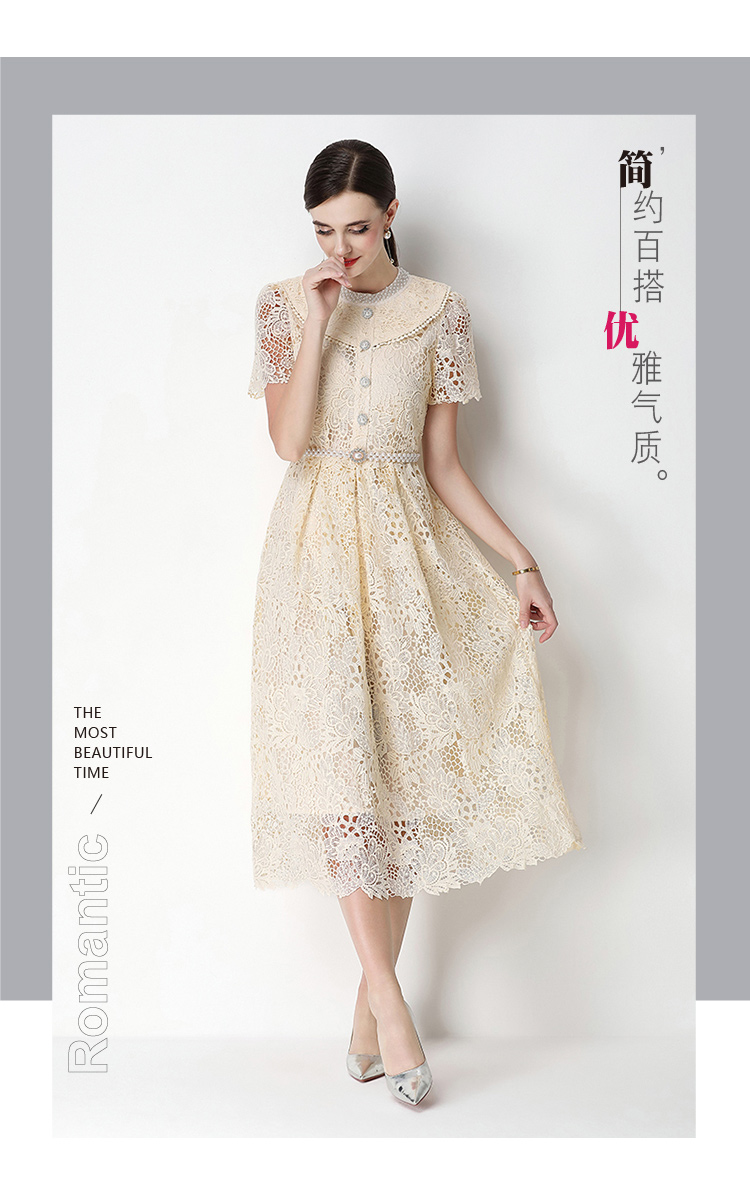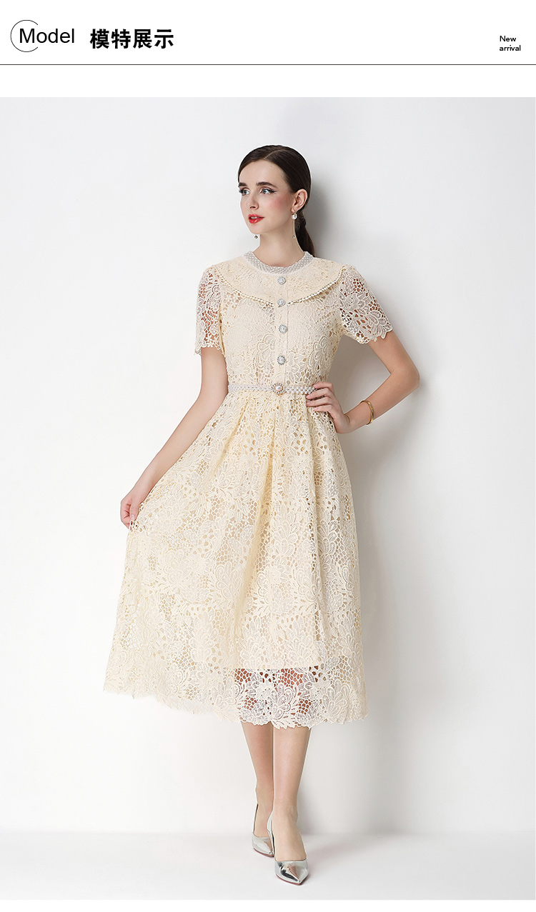 실사 반팔 슬림해 보이는 홀로우 아웃 물 용해 레이스 포지셔닝 중간 길이 드레스