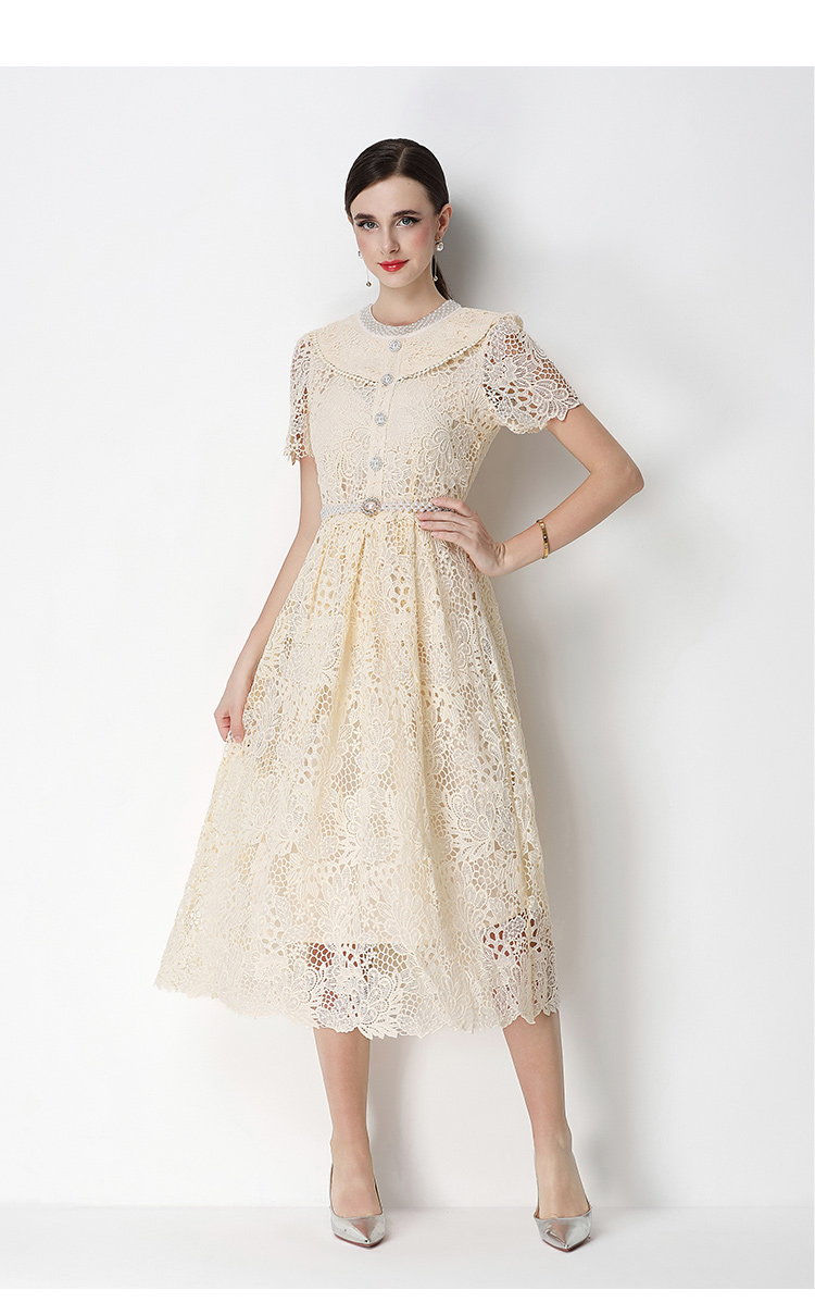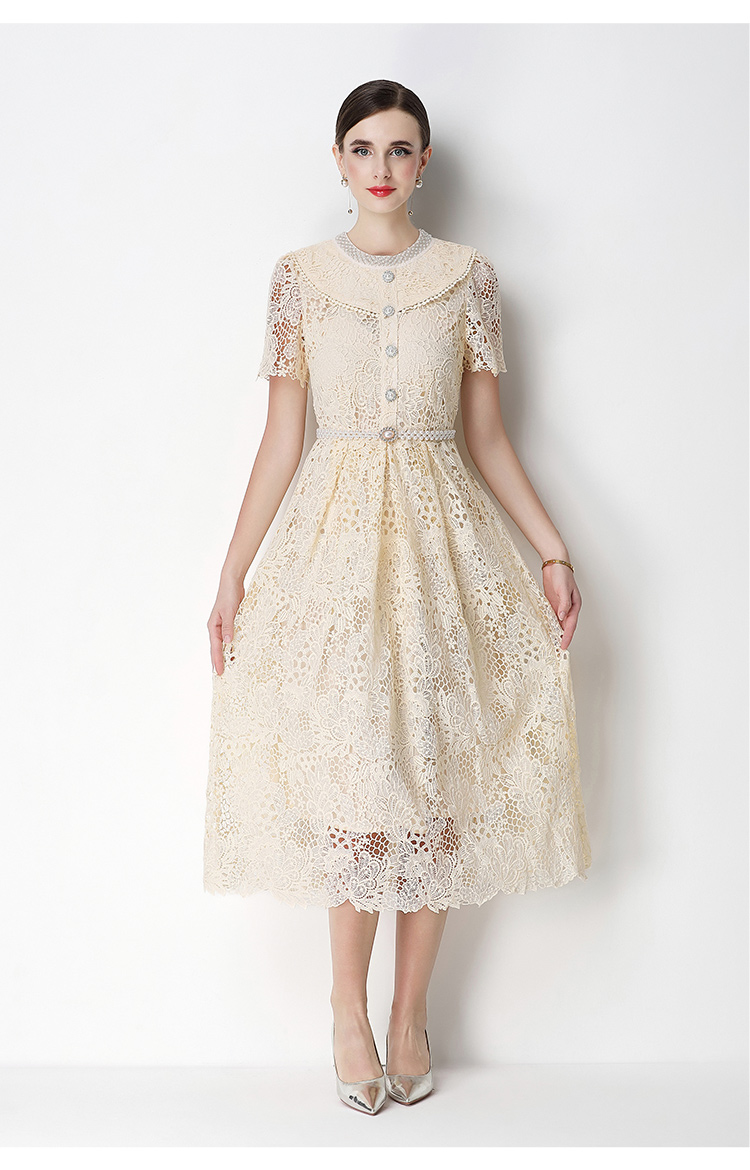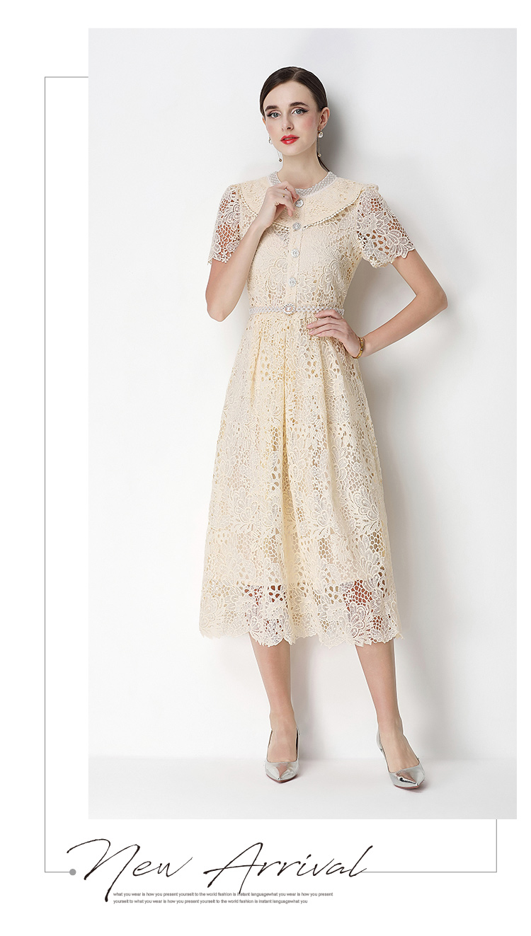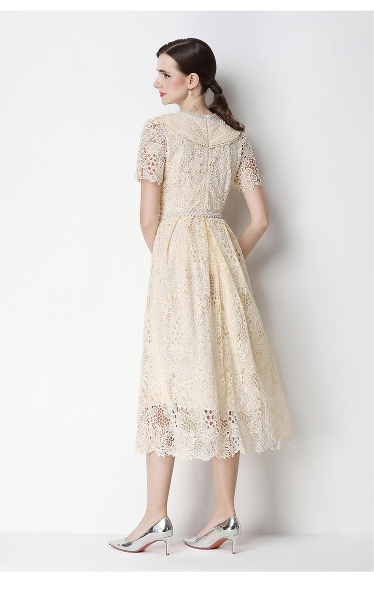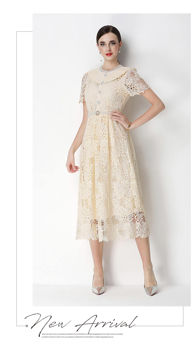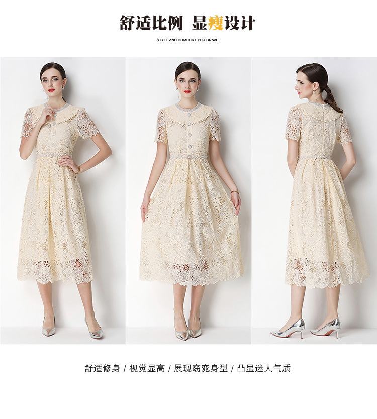 실사 반팔 슬림해 보이는 홀로우 아웃 물 용해 레이스 포지셔닝 중간 길이 드레스