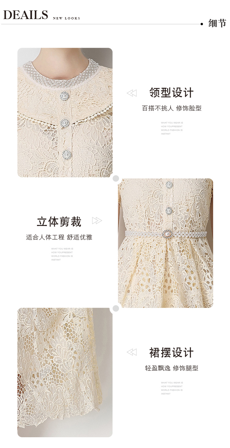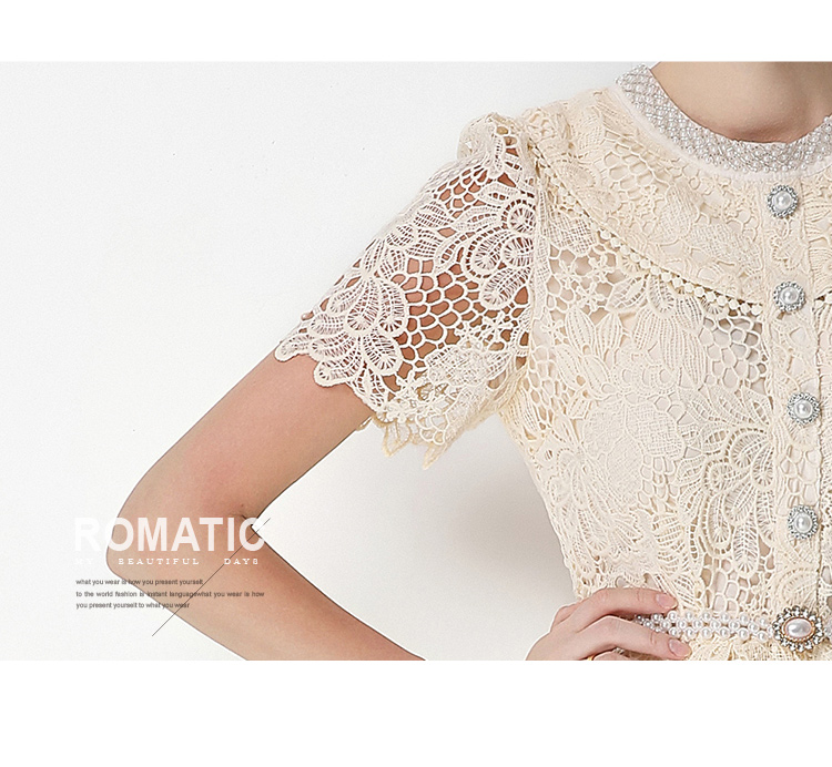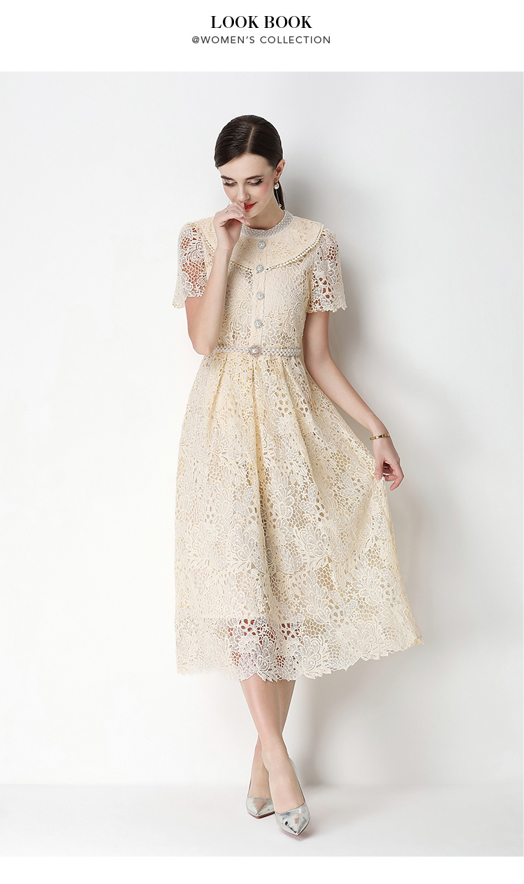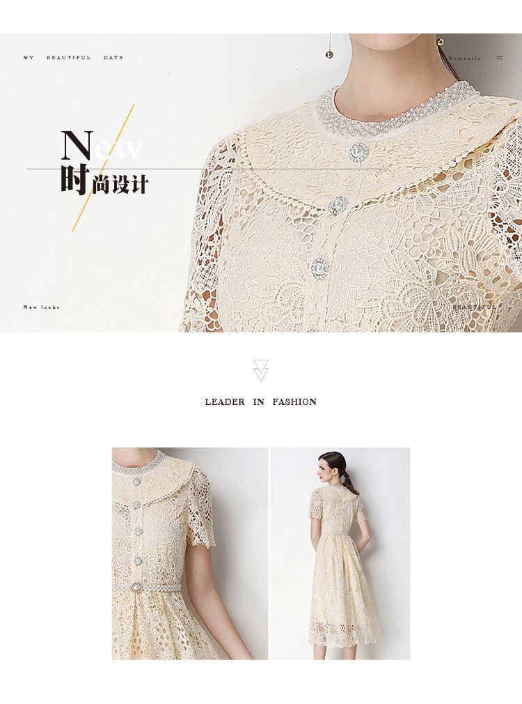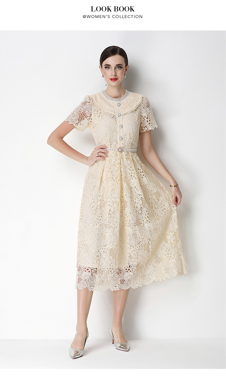 실사 반팔 슬림해 보이는 홀로우 아웃 물 용해 레이스 포지셔닝 중간 길이 드레스