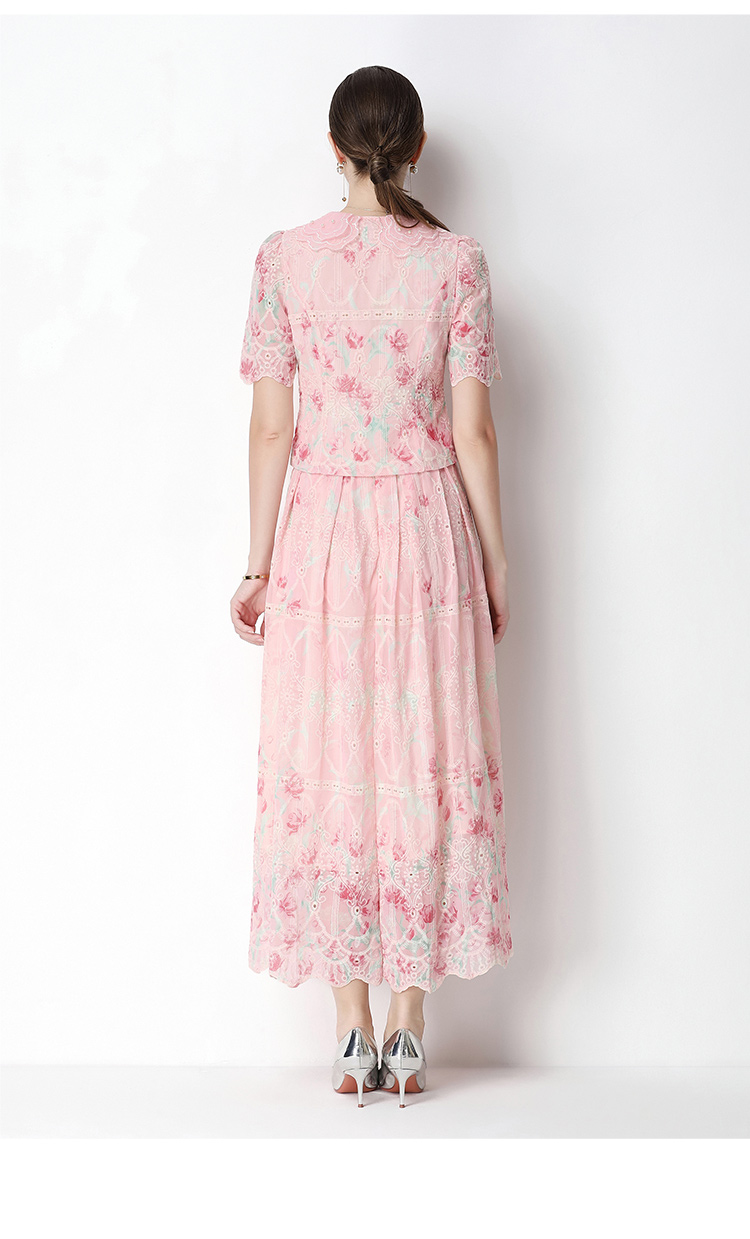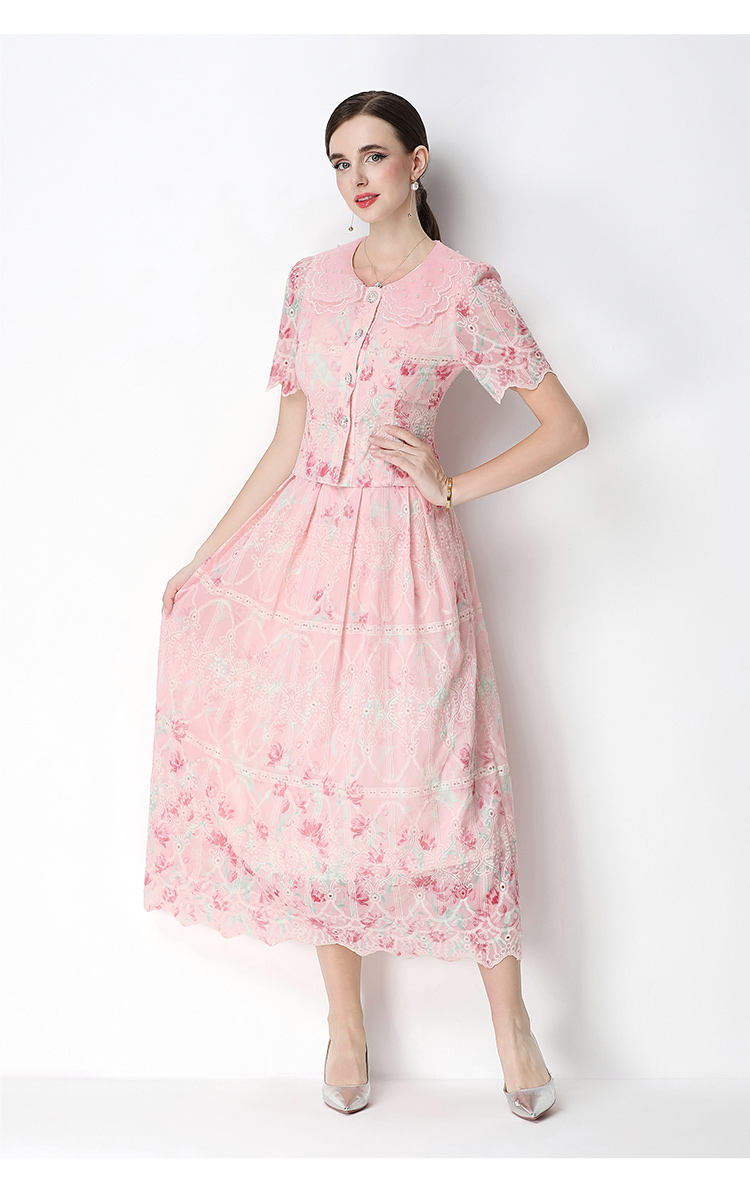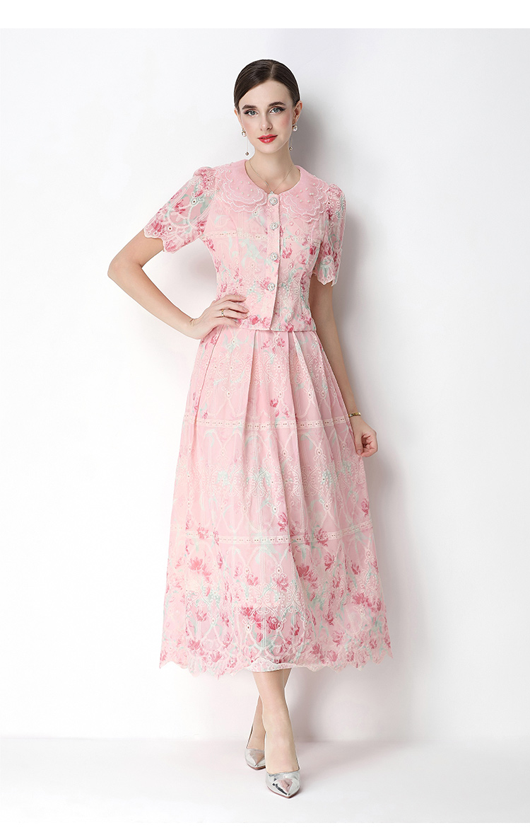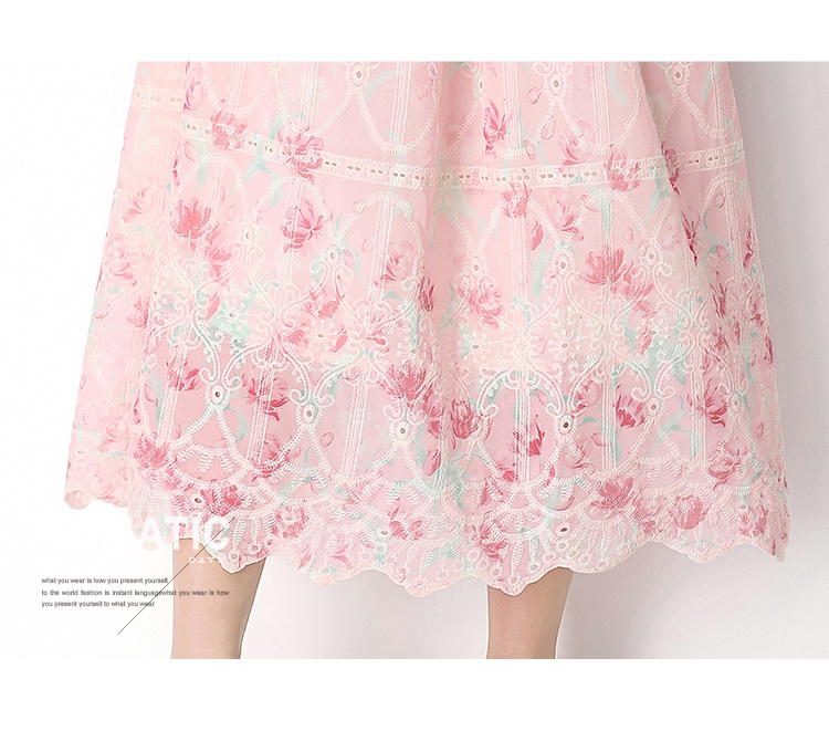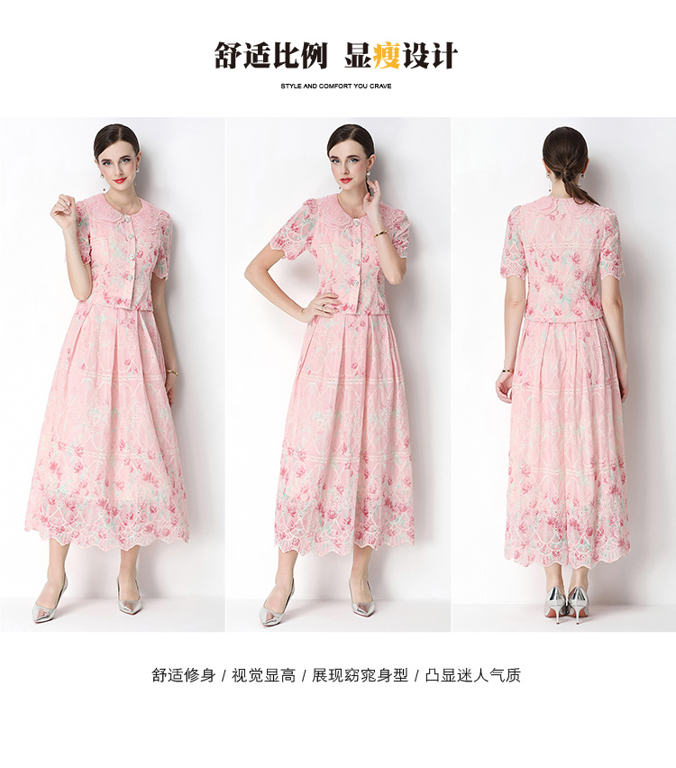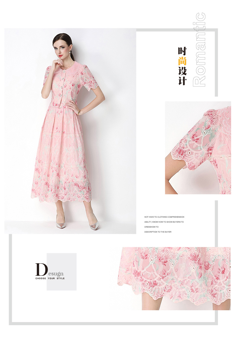 실사 반팔 슬림해 보이는 홀로우 아웃 물 용해 레이스 포지셔닝 중간 길이 드레스