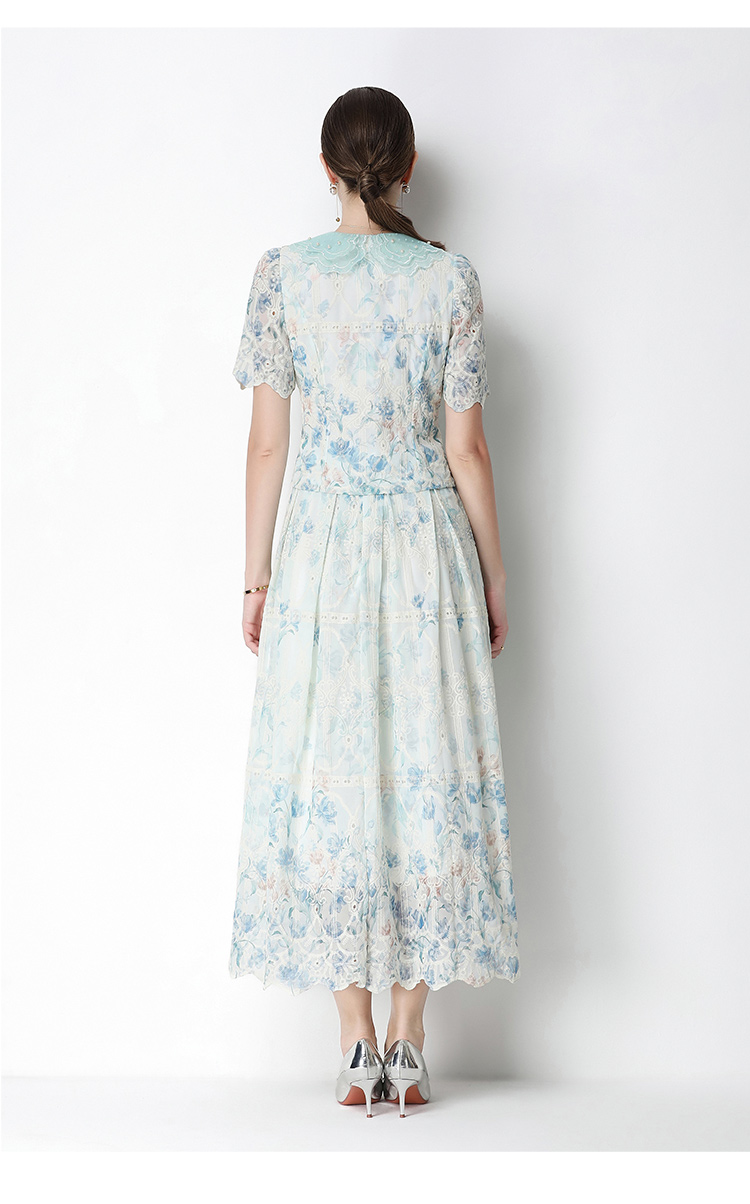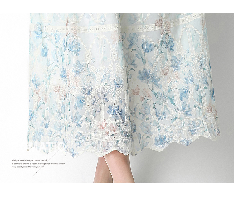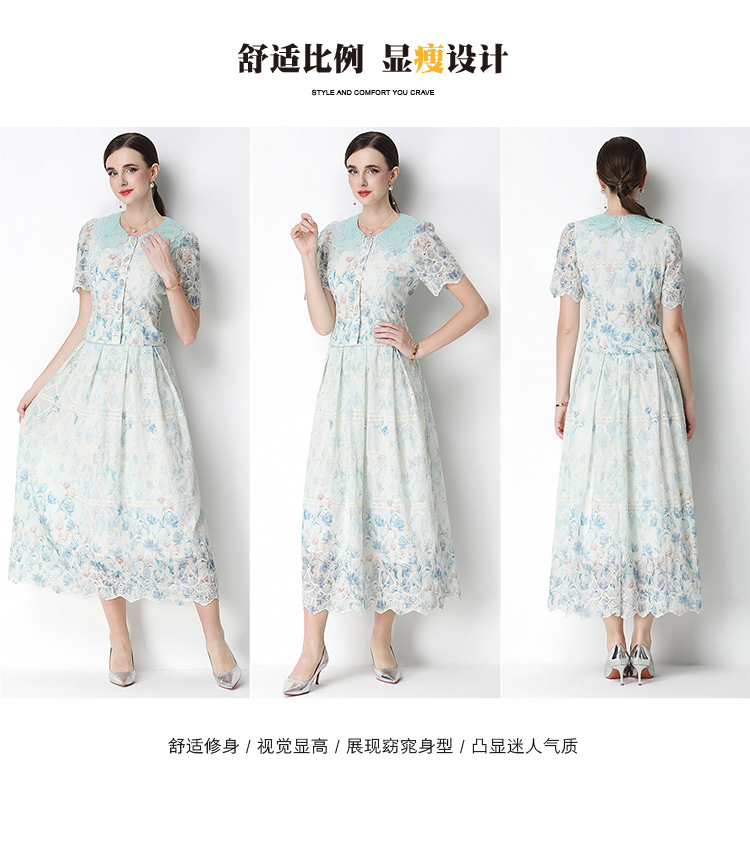 실사 반팔 슬림해 보이는 홀로우 아웃 물 용해 레이스 포지셔닝 중간 길이 드레스