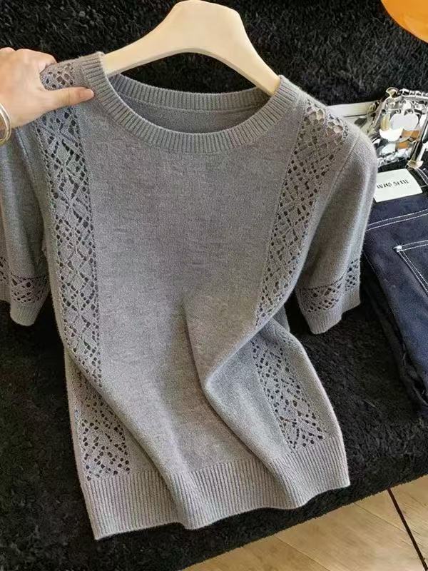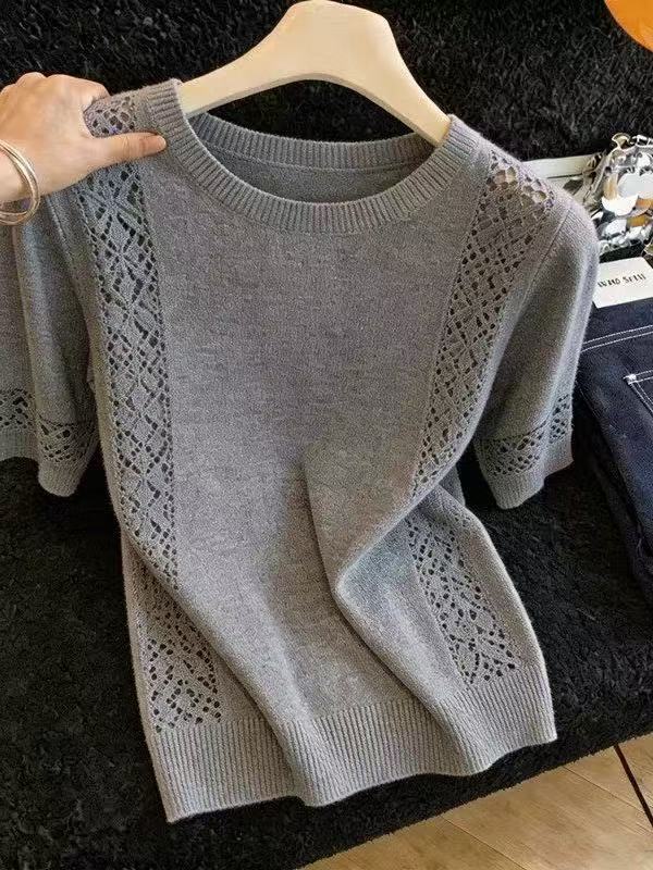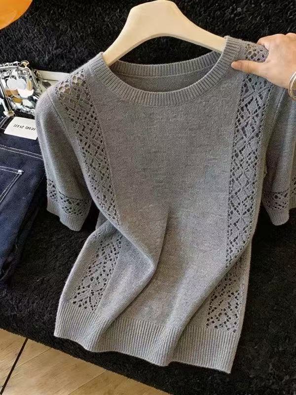 미니멀리즘 바람 회색 반팔 니트 스웨터 2026 여름 몸매 가꾸기 슬림해 보이는 홀로우 아웃 광장 칼라 맨위 얼음 실크 출퇴근 풀오버