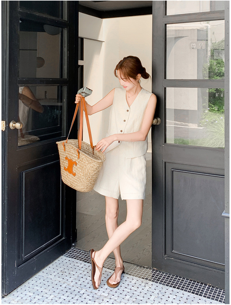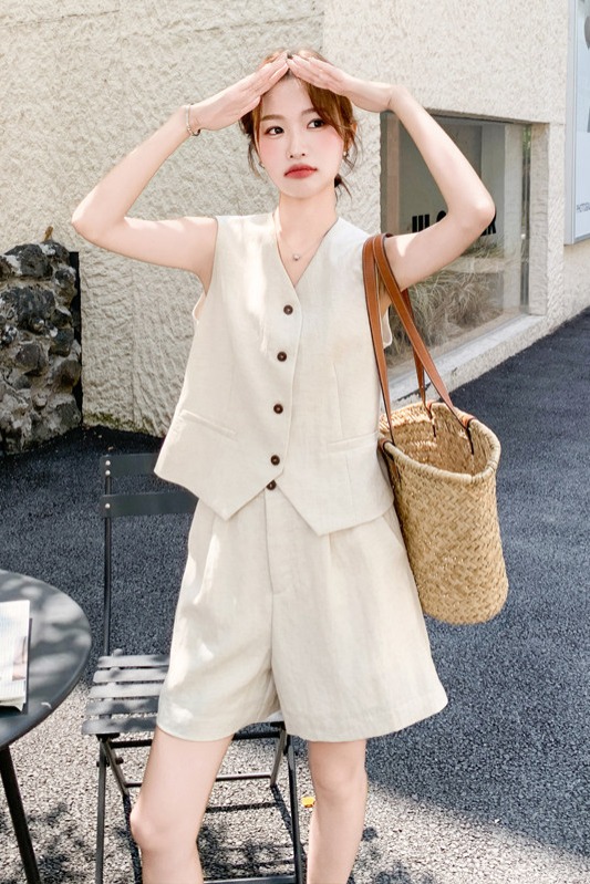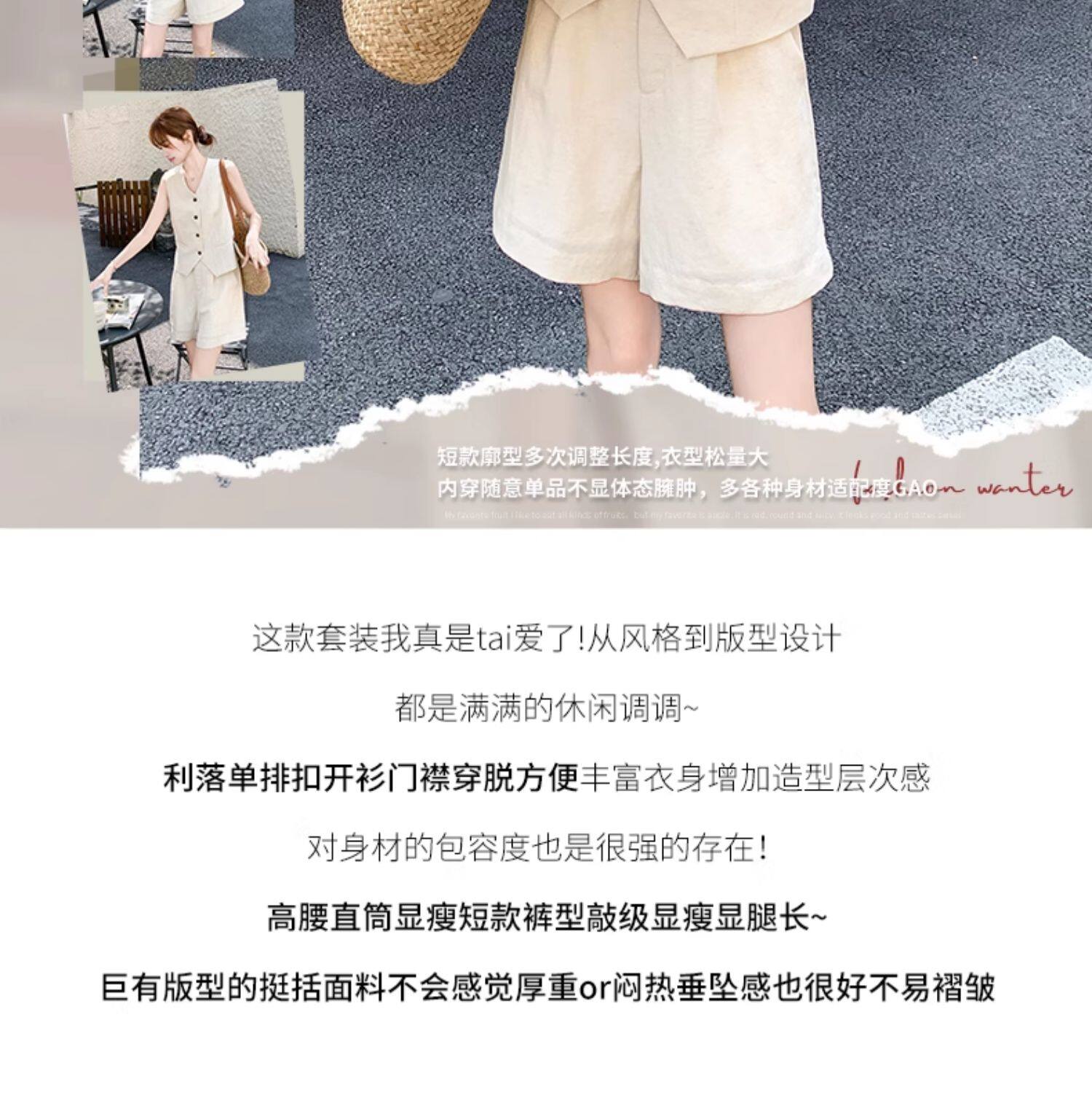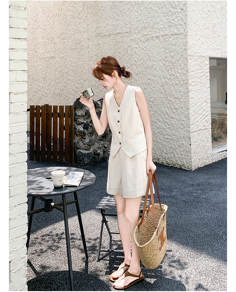 고급 센스 오래된 돈 바람 아마 베이지 색 민소매 싱글 줄 버튼 베스트 넓은 다리가 짧다. 바지 투피스 슈트 여성 2026 여름