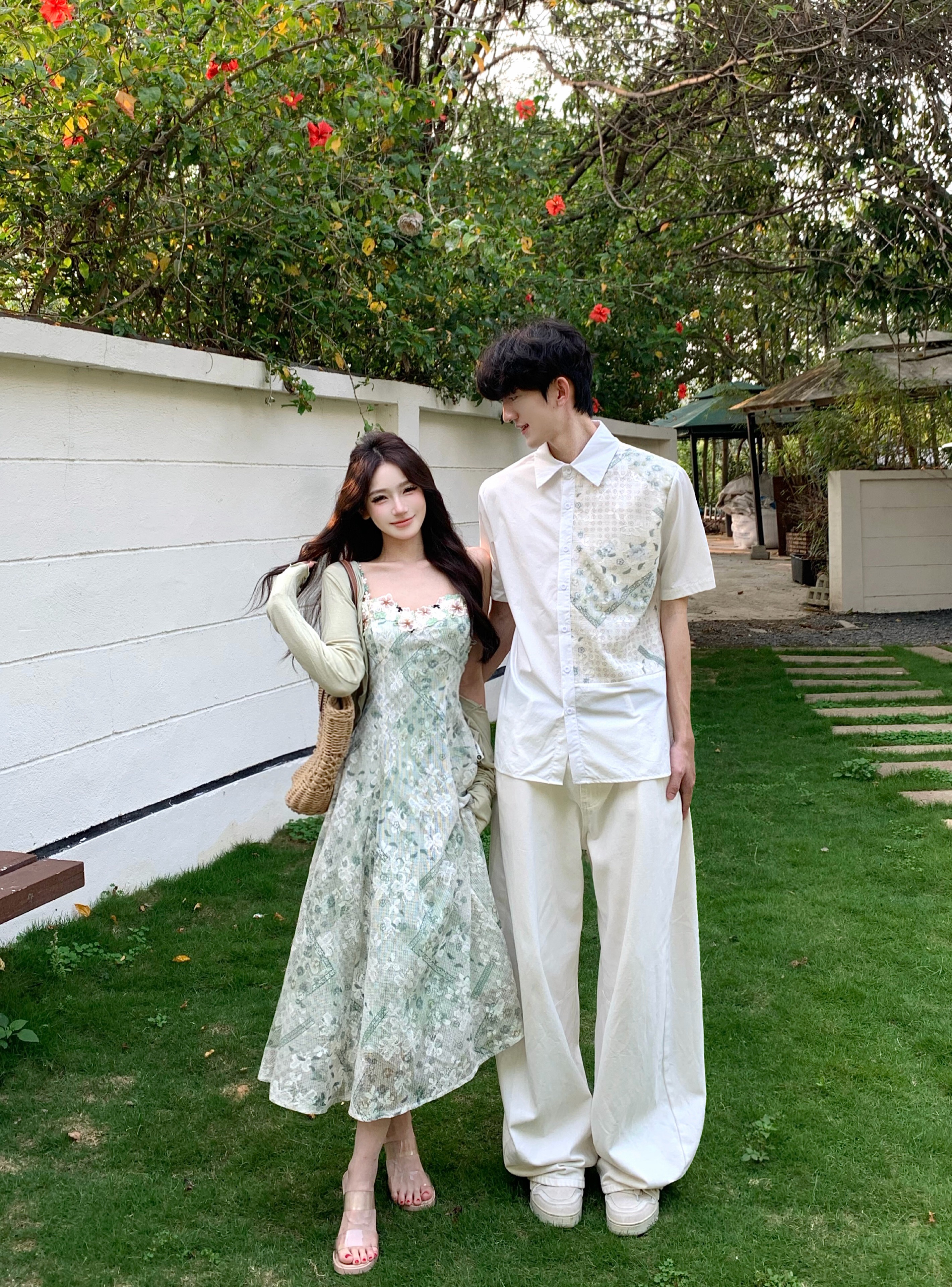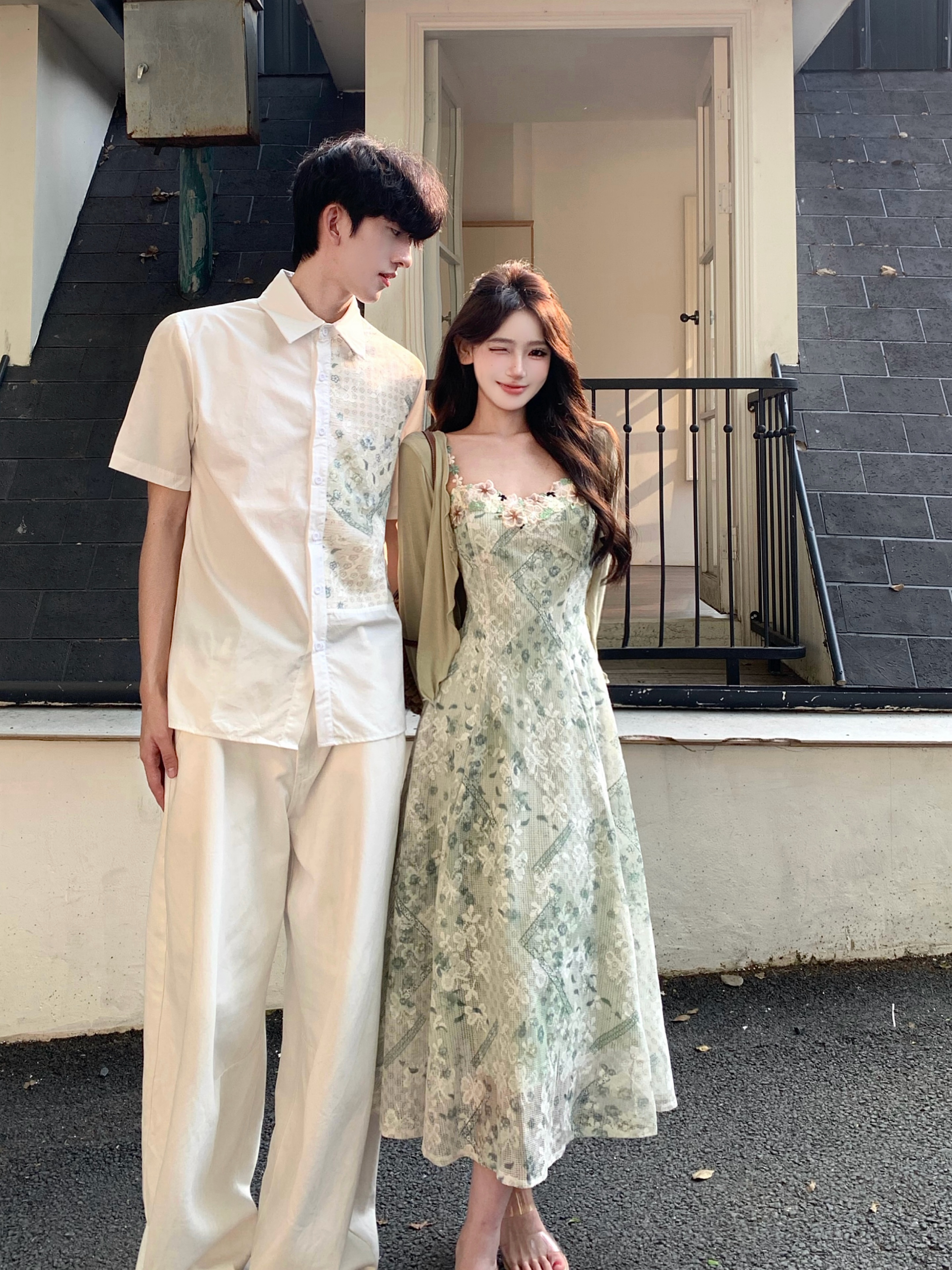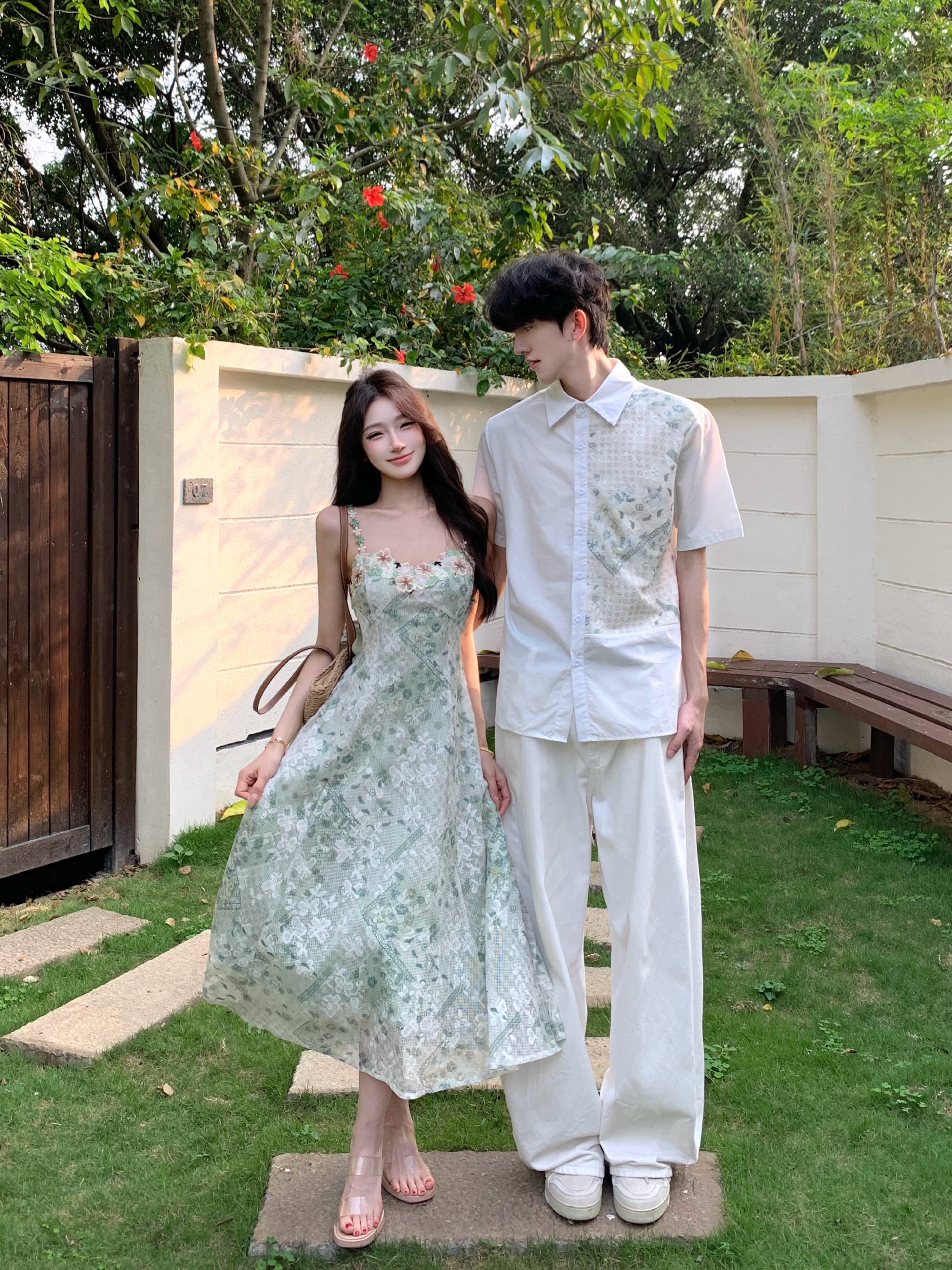 실사 프랑스식 휴가 바람 녹색 꽃무늬 여성 드레스 여름 새로운 슬림해 보이는 롱 스커트 커플룩