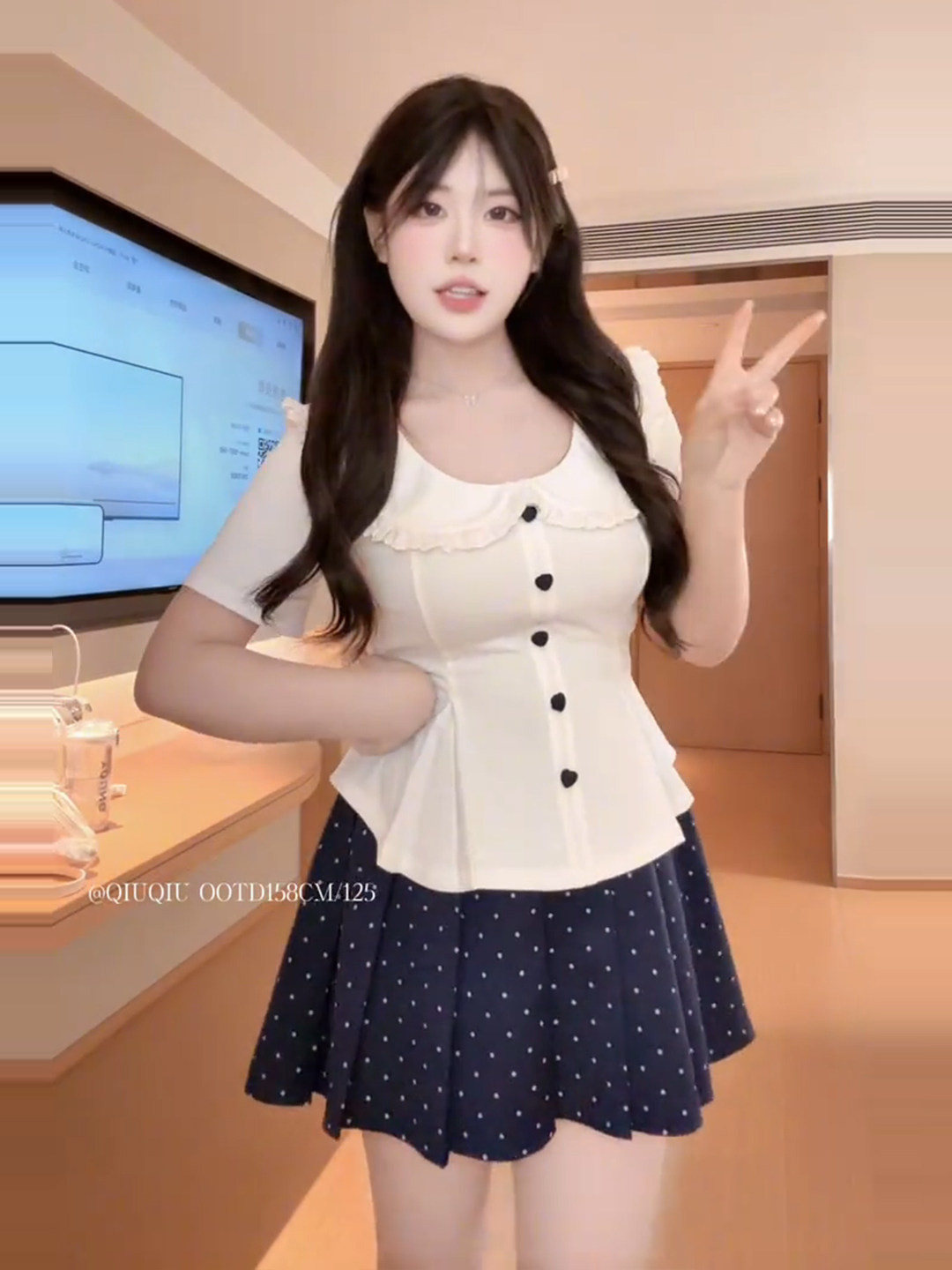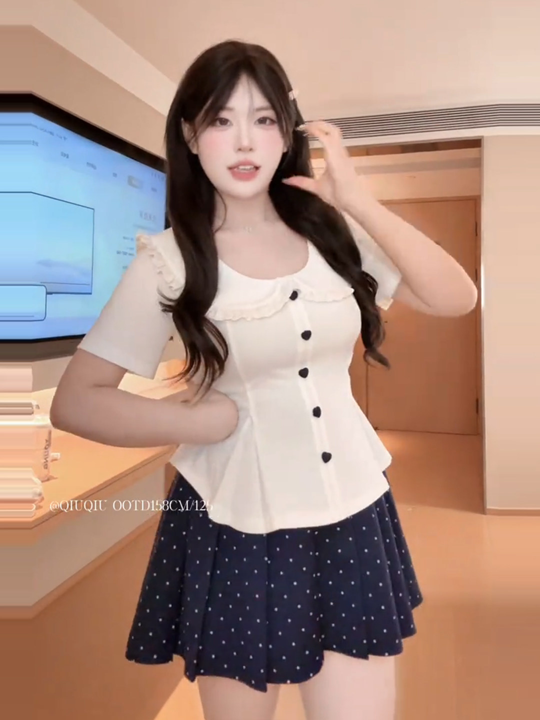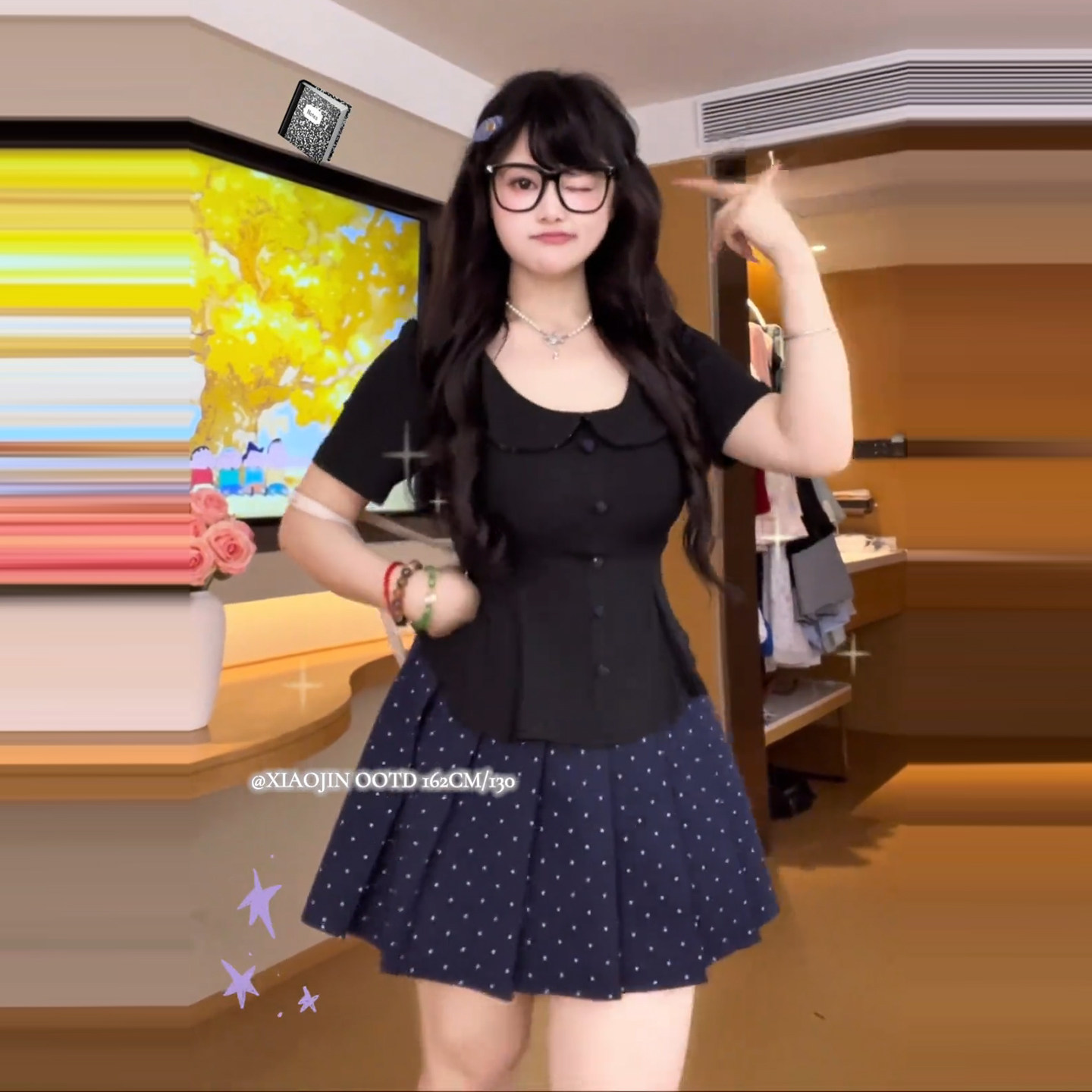 빅 사이즈 한 부서 고급 센스 베이비 칼라 반팔 셔츠 여성 여름 지방 mm 하이웨이스트 도트 무늬 플리츠 스커트 슬림해 보이는 세트