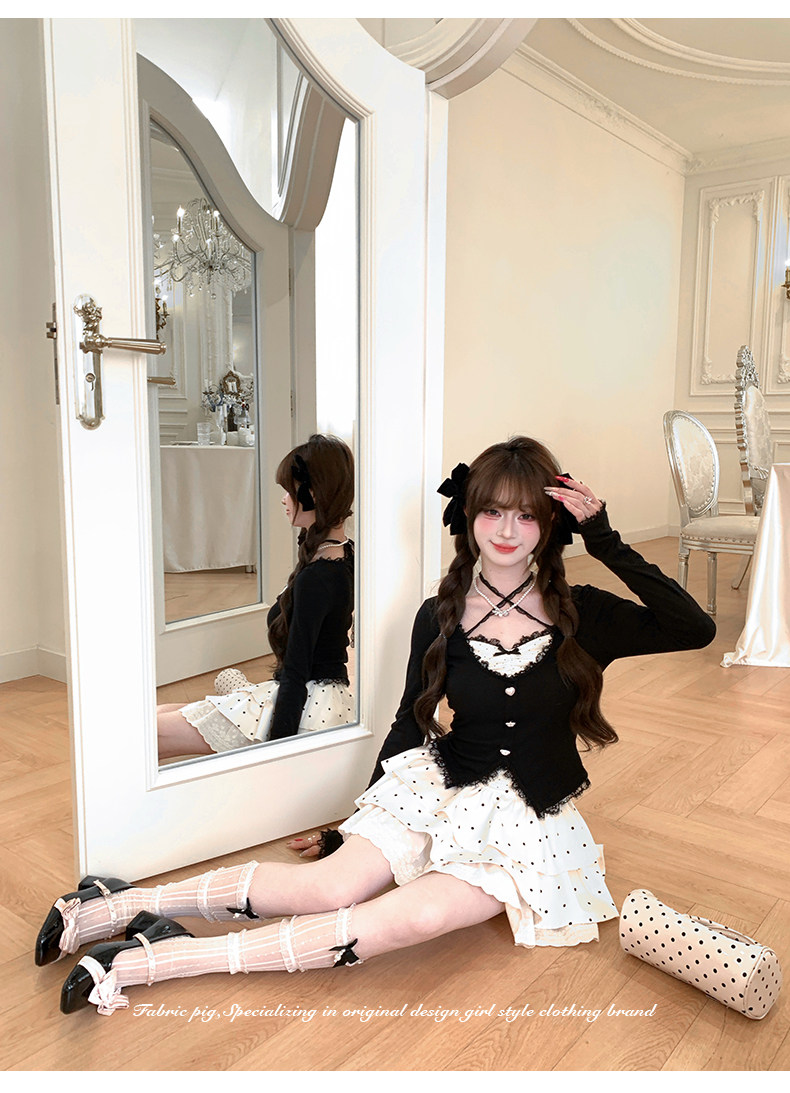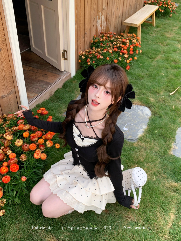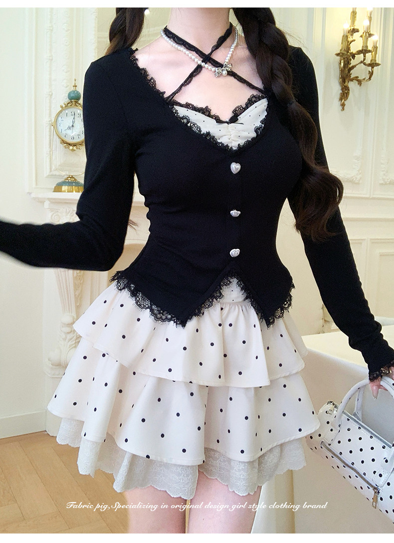 있음 선적 프랑스식 달콤함 순수한 욕망 여름 새로운 흑인과 백인 페이크 레이어드 레이스 레이스 반팔 맨위 도트 무늬 치마