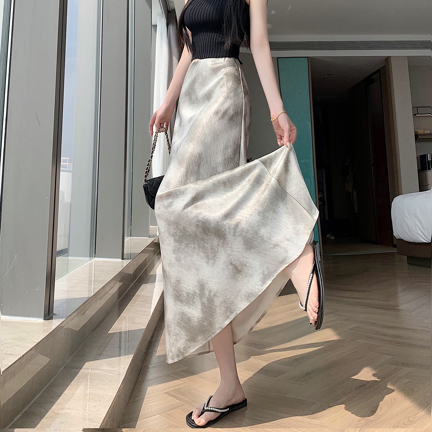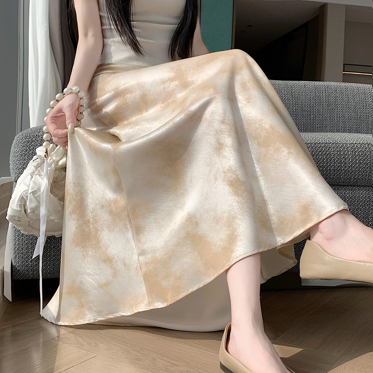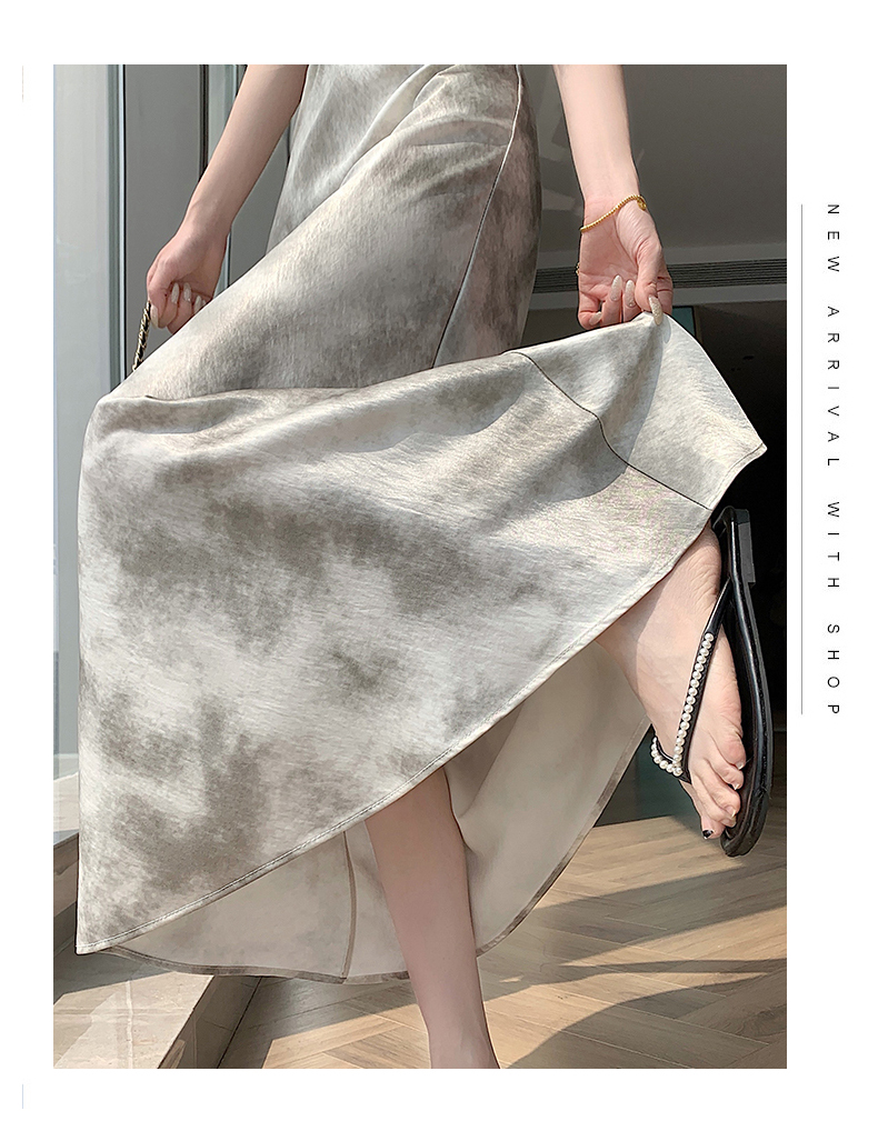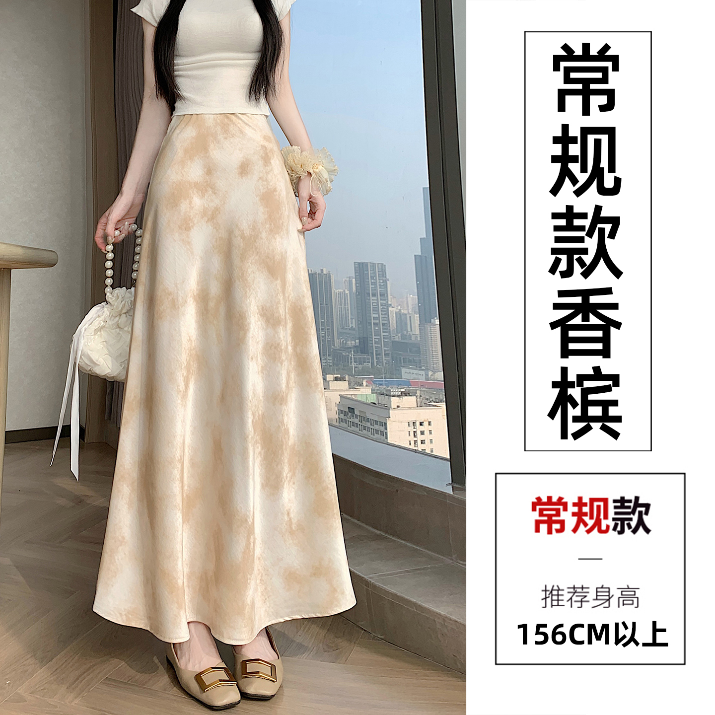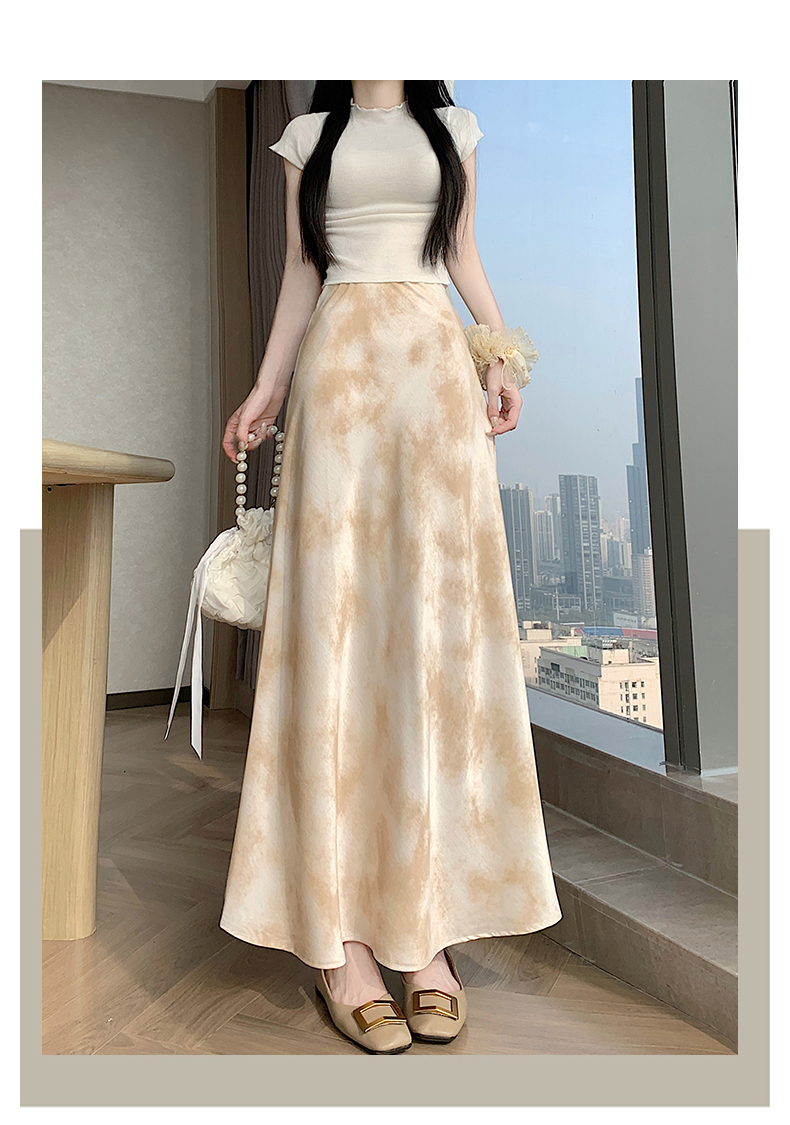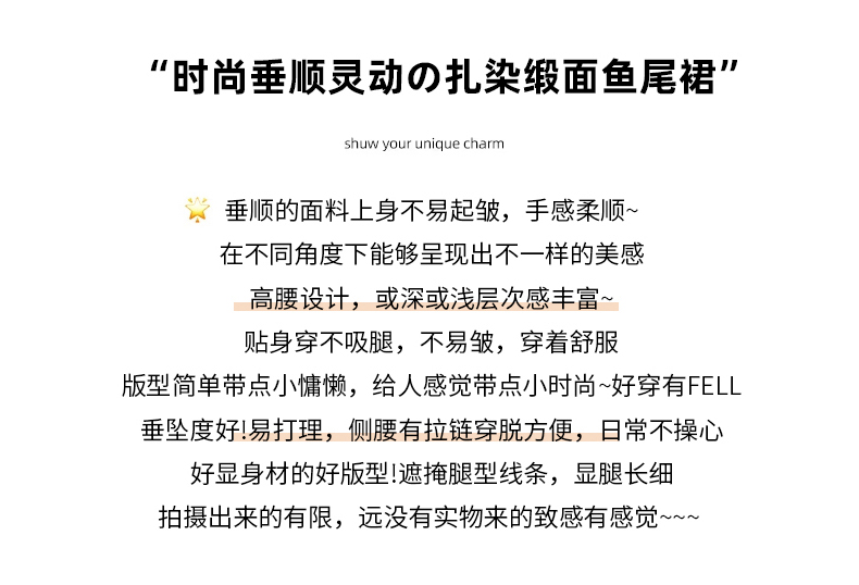 실사 길이 쇼트 스타일 아세트산 새틴 깃발 도트 무늬 반신 스커트 허리밴드 롱 스커트 트임 원사 한 마디 롱 스커트