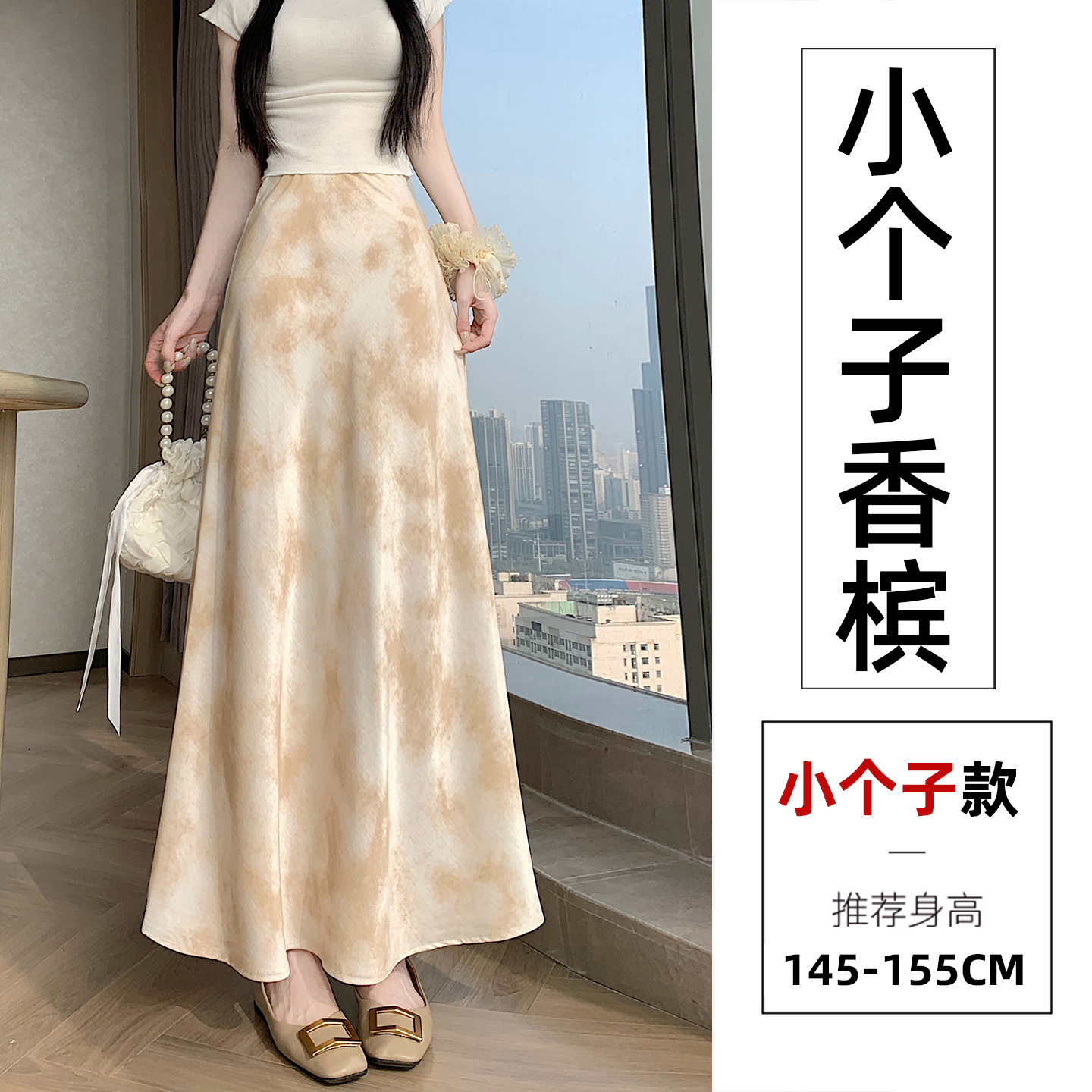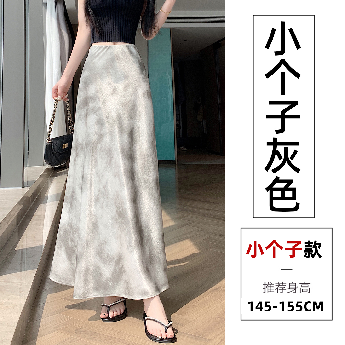 실사 작은 키 길이 쇼트 스타일 아세트산 새틴 깃발 도트 무늬 반신 스커트 허리밴드 트임 원사 롱 스커트