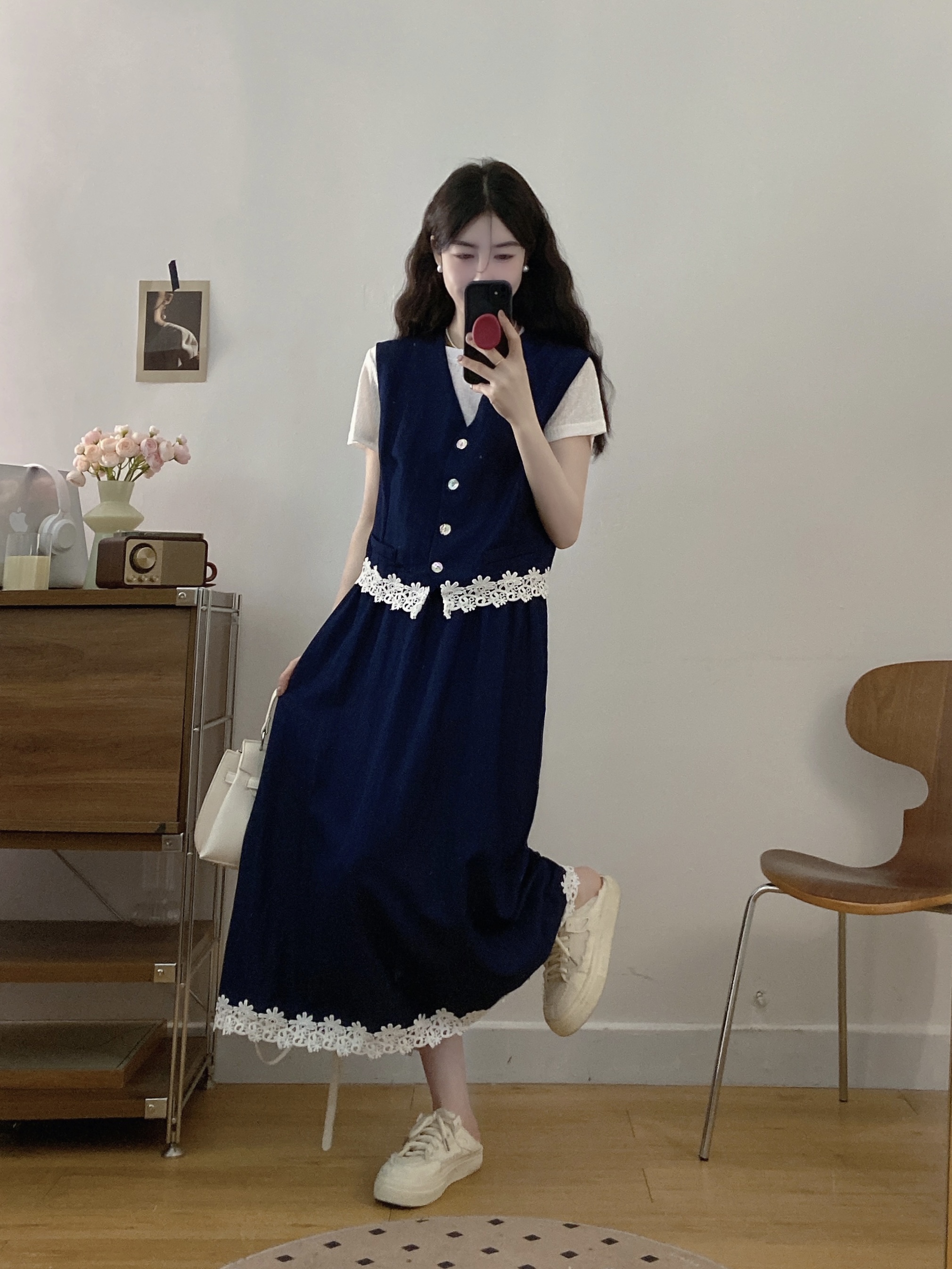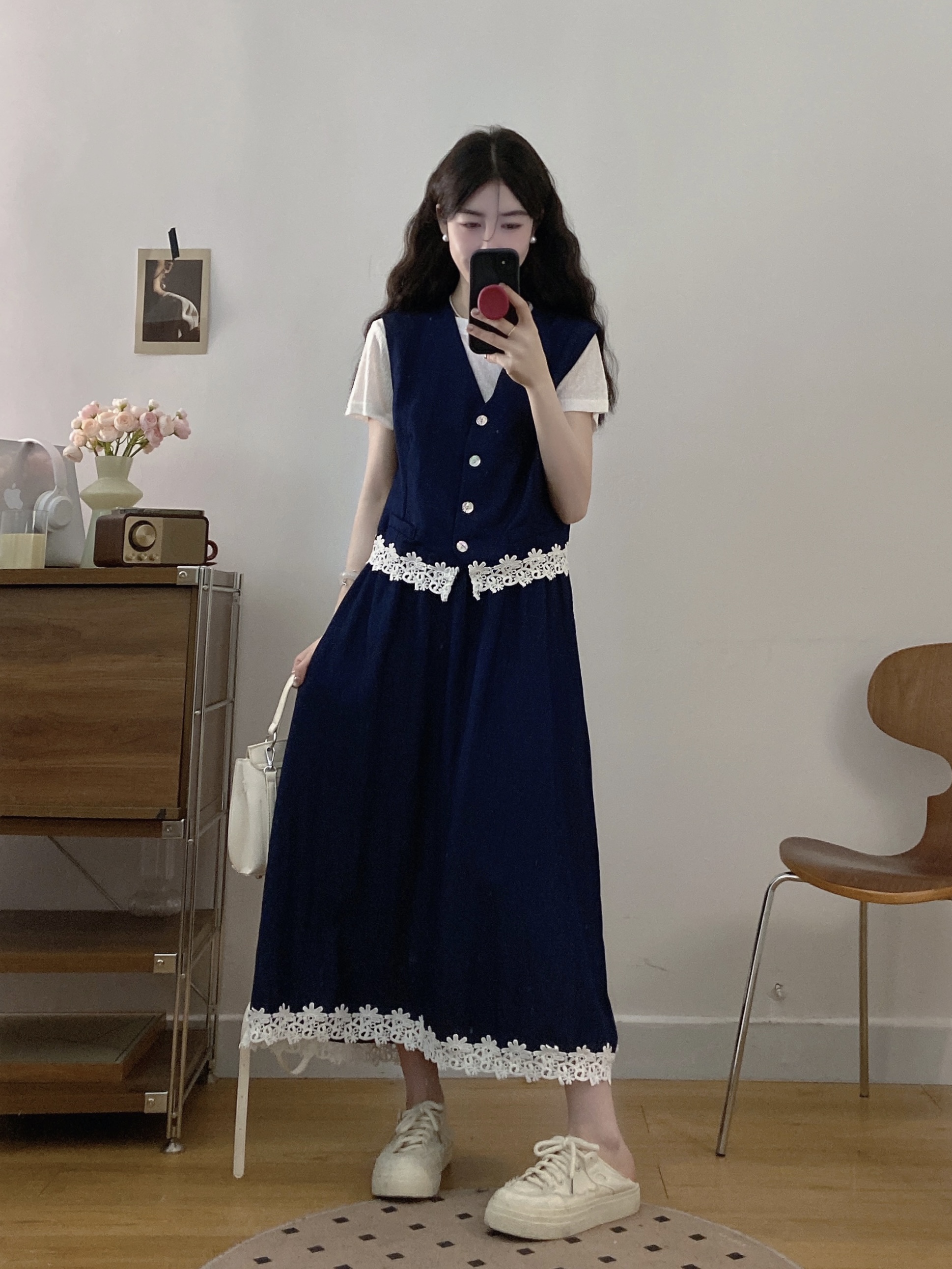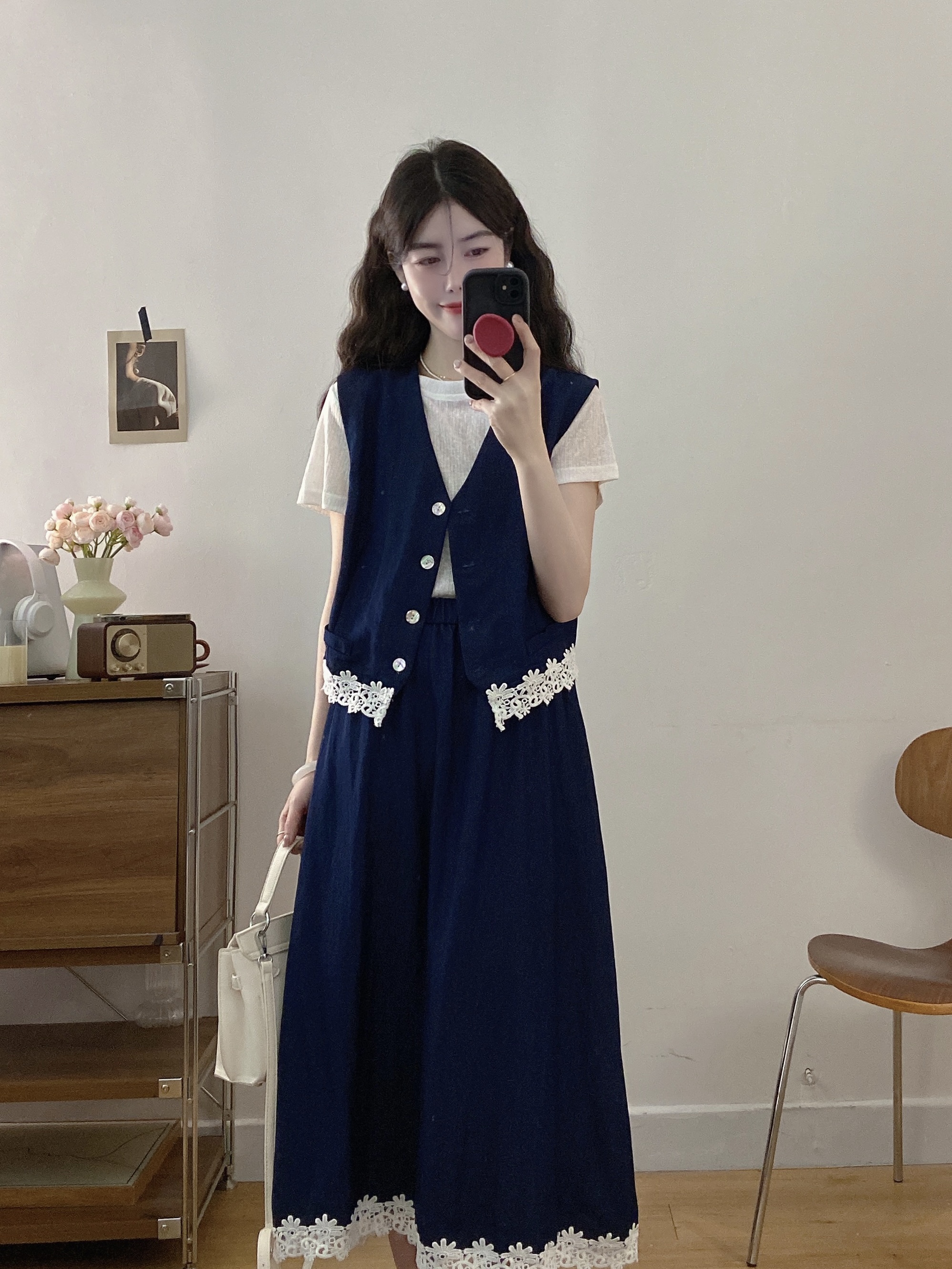 실사 빅 사이즈 여성 의류 2026 여름 캐주얼 레이스 조각 주간 실크 데님 베스트 반신 스커트 3종 세트 세트
