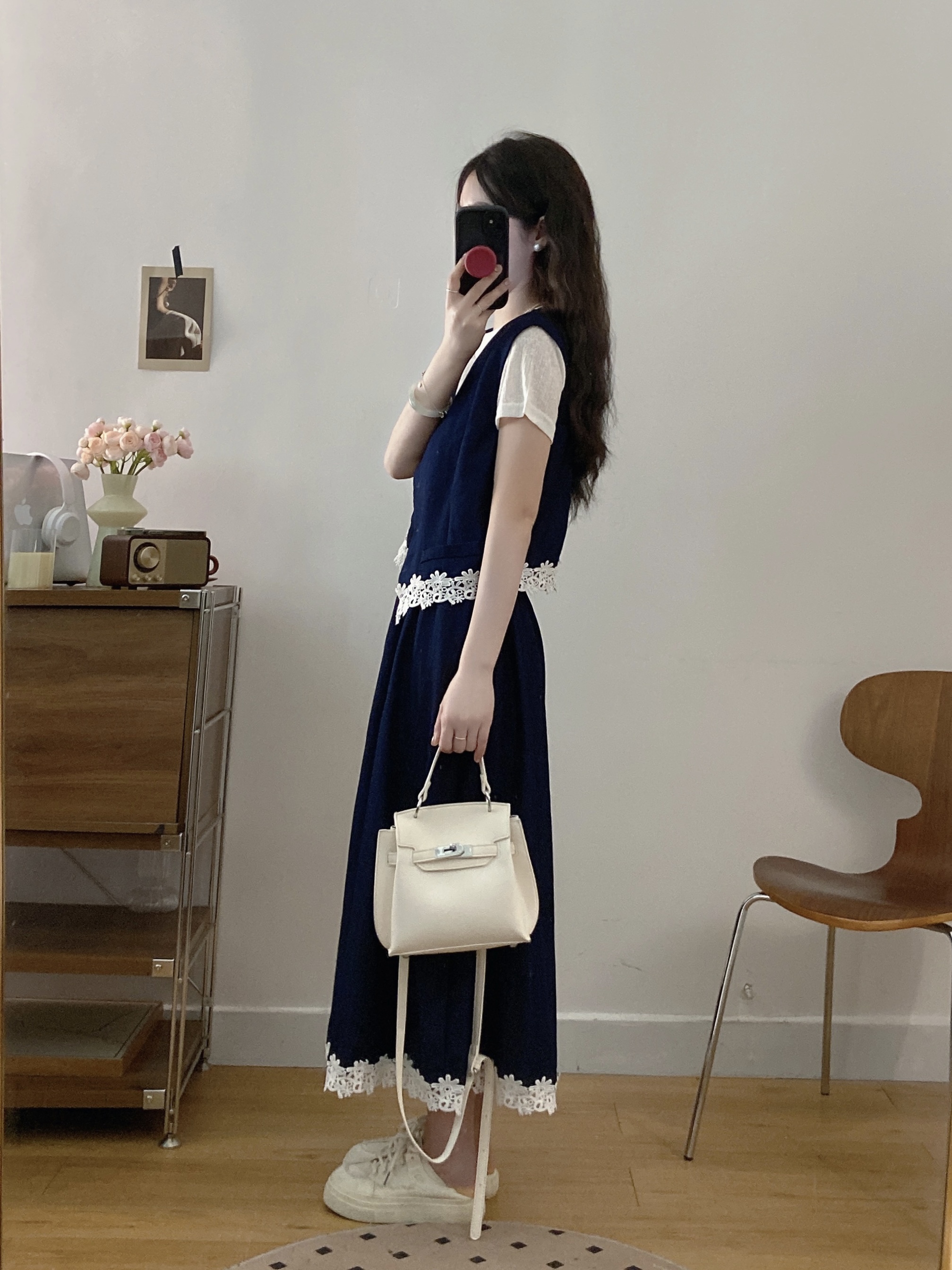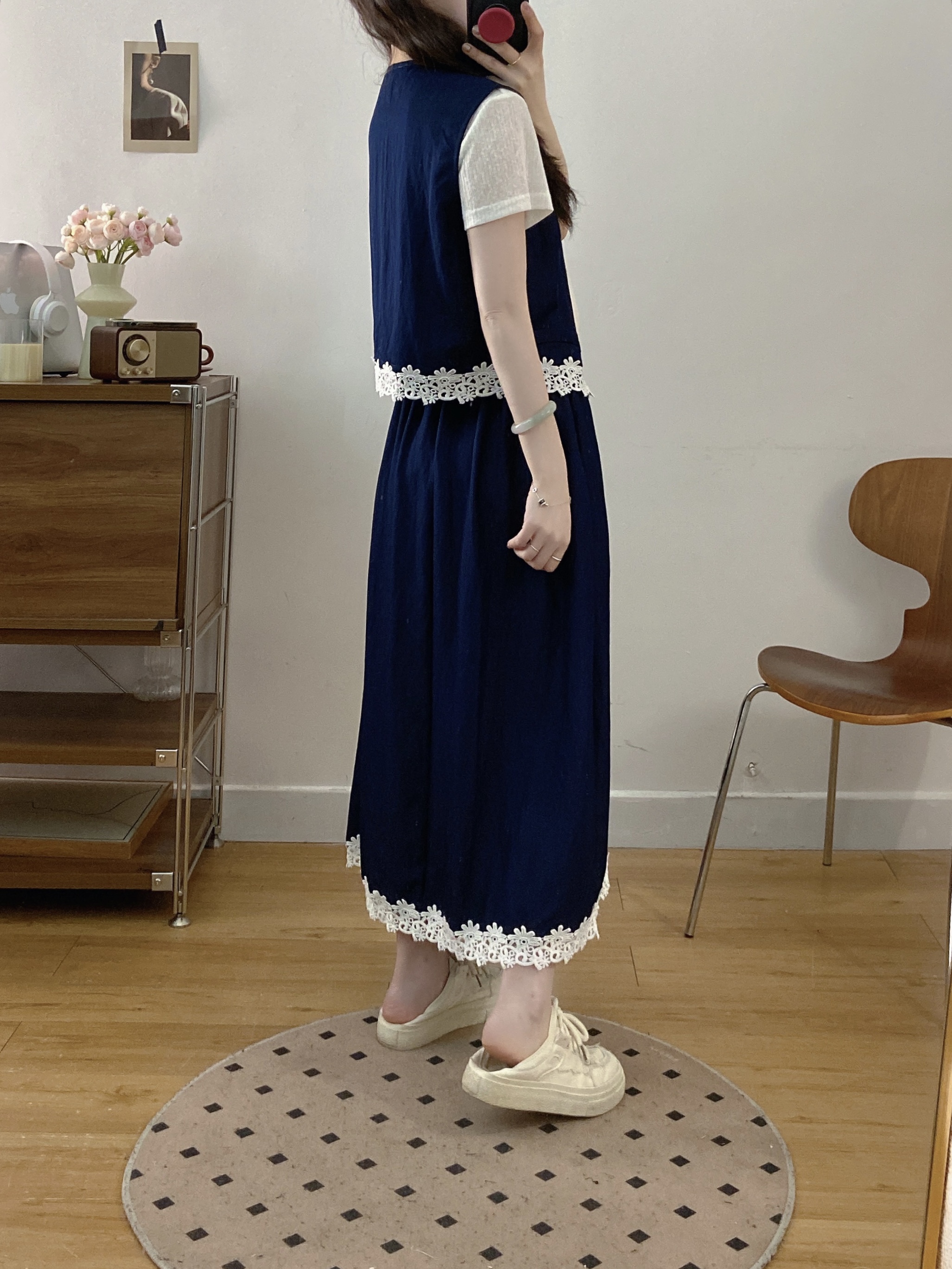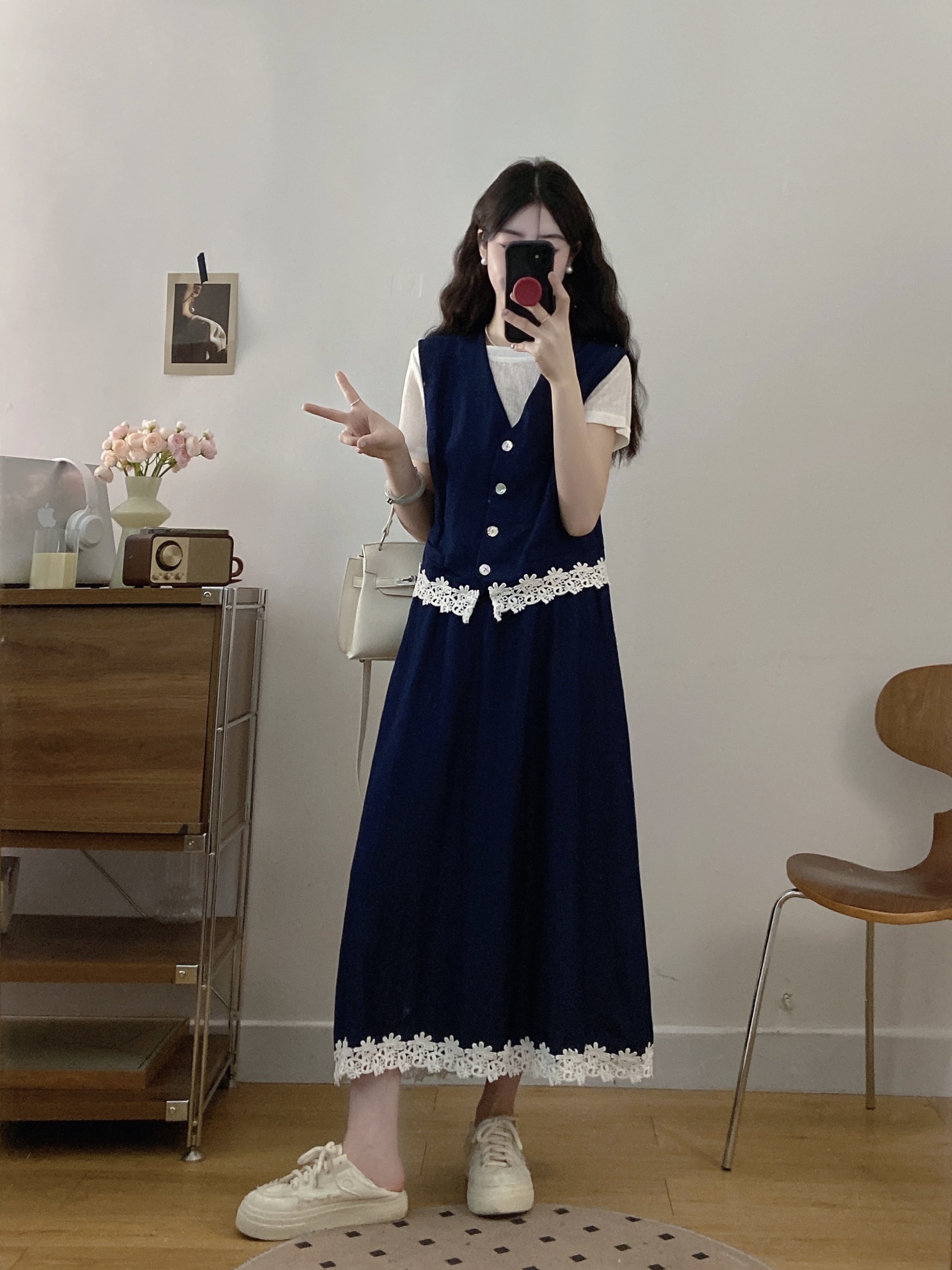 실사 빅 사이즈 여성 의류 2026 여름 캐주얼 레이스 조각 주간 실크 데님 베스트 반신 스커트 3종 세트 세트