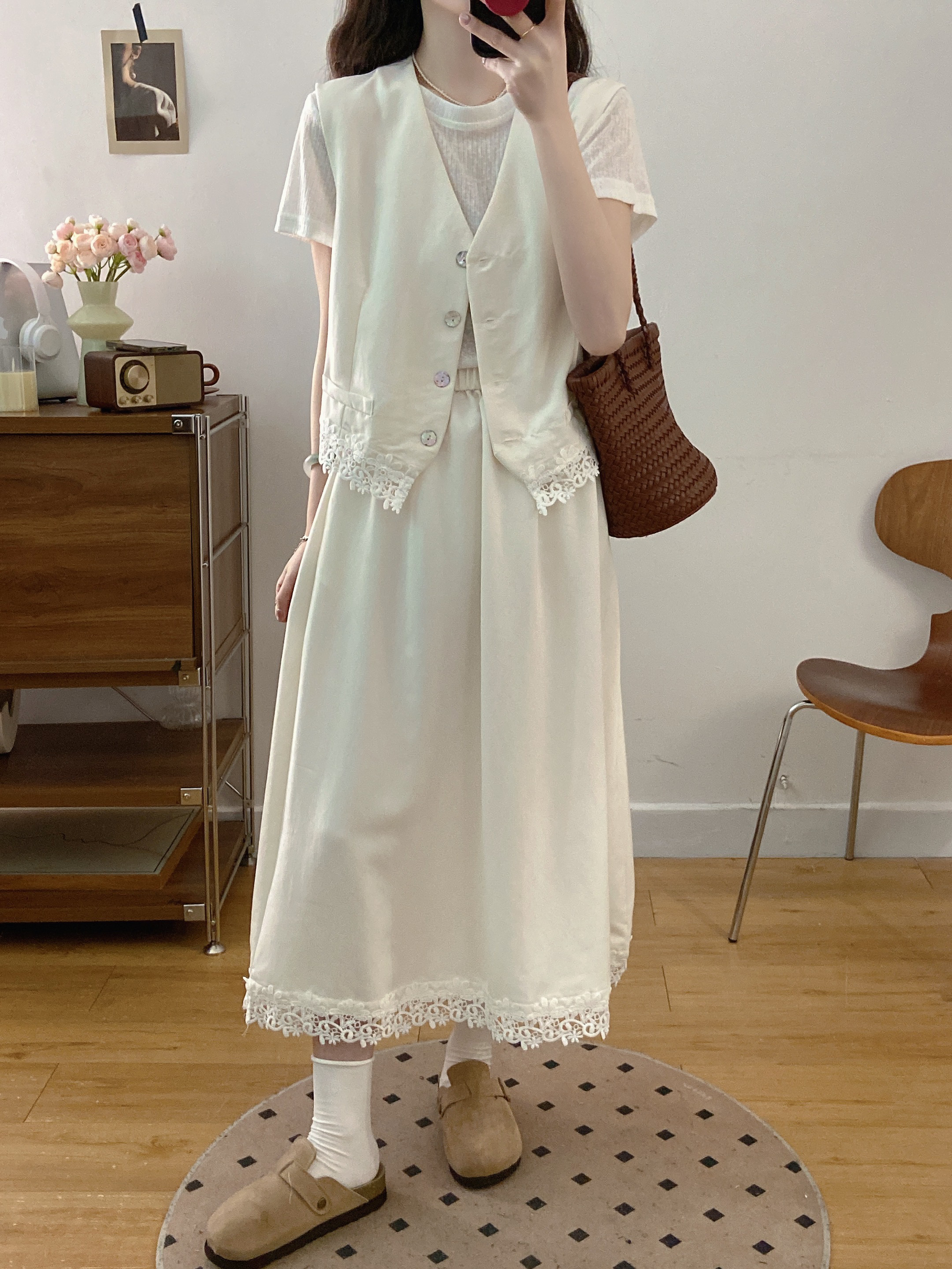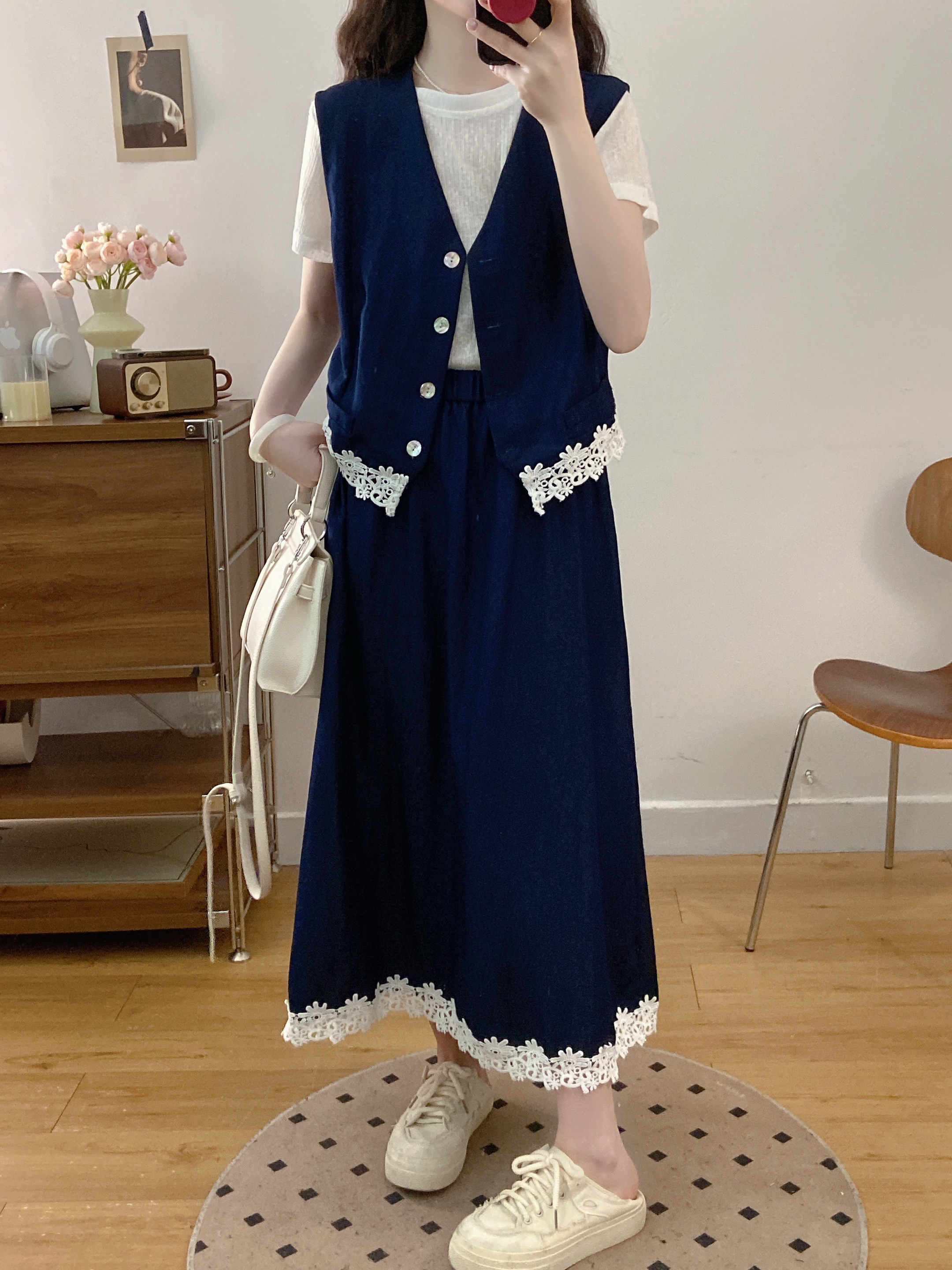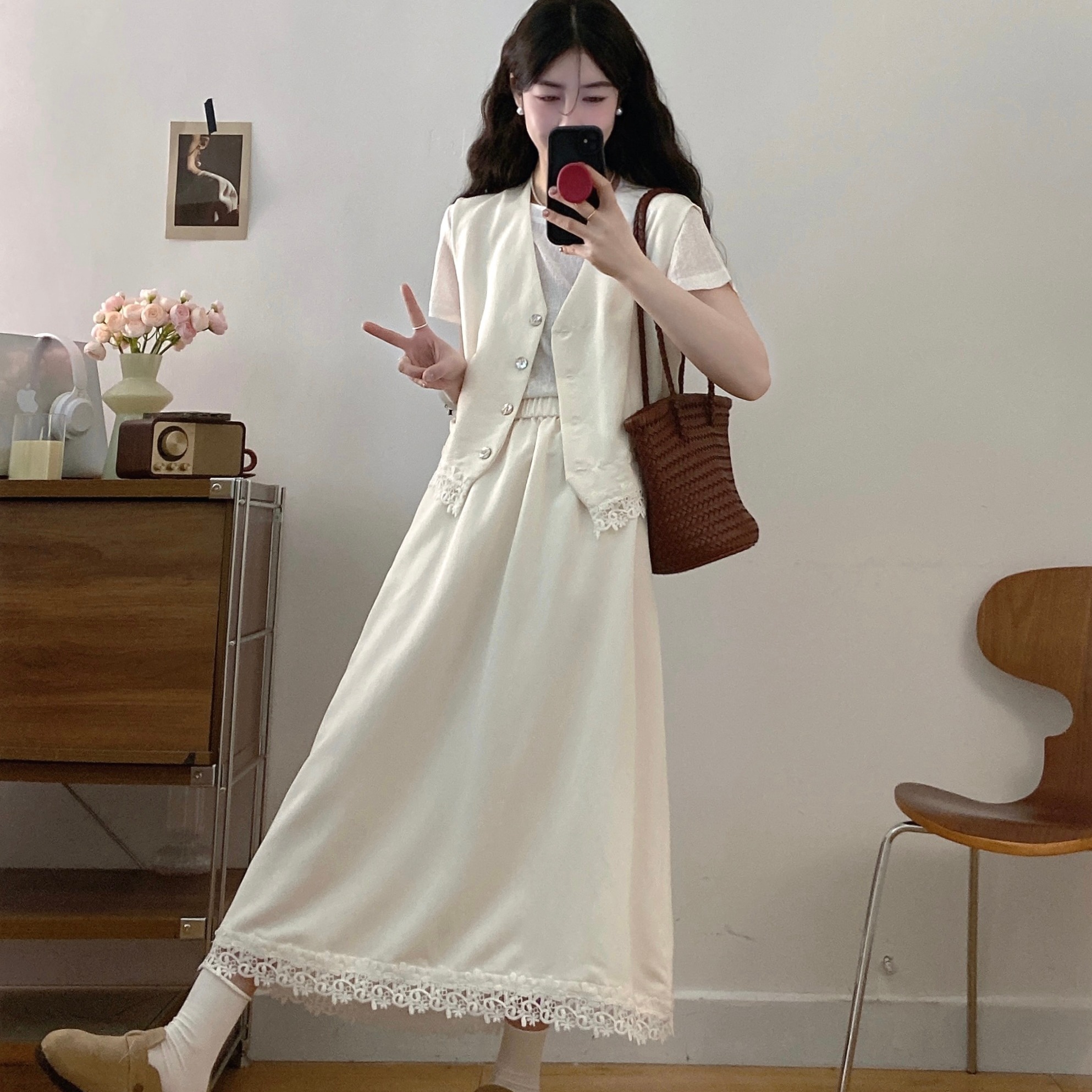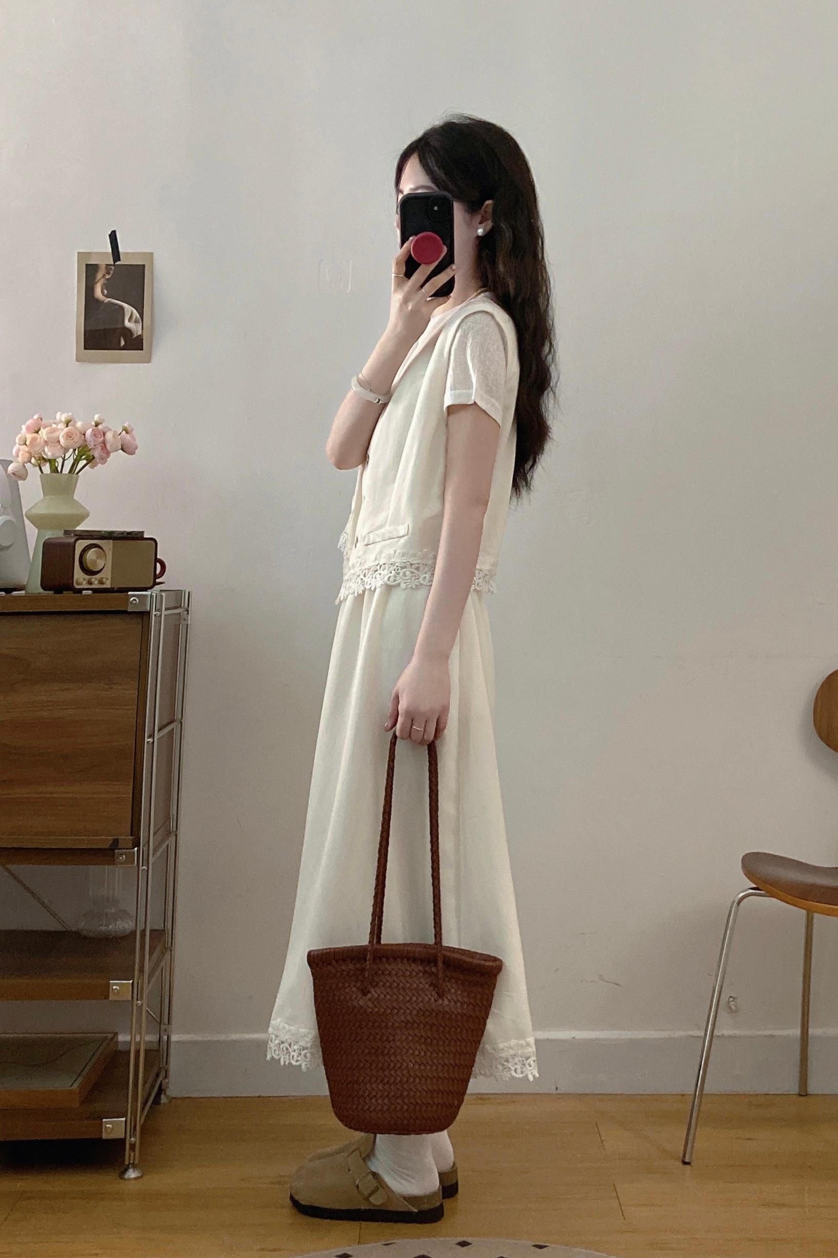 실사 빅 사이즈 세트 여성 2026 년 여름 한국 스타일 라운드 넥 캐주얼 조끼 스커트 화이트 반팔 티셔츠 투피스 슈트