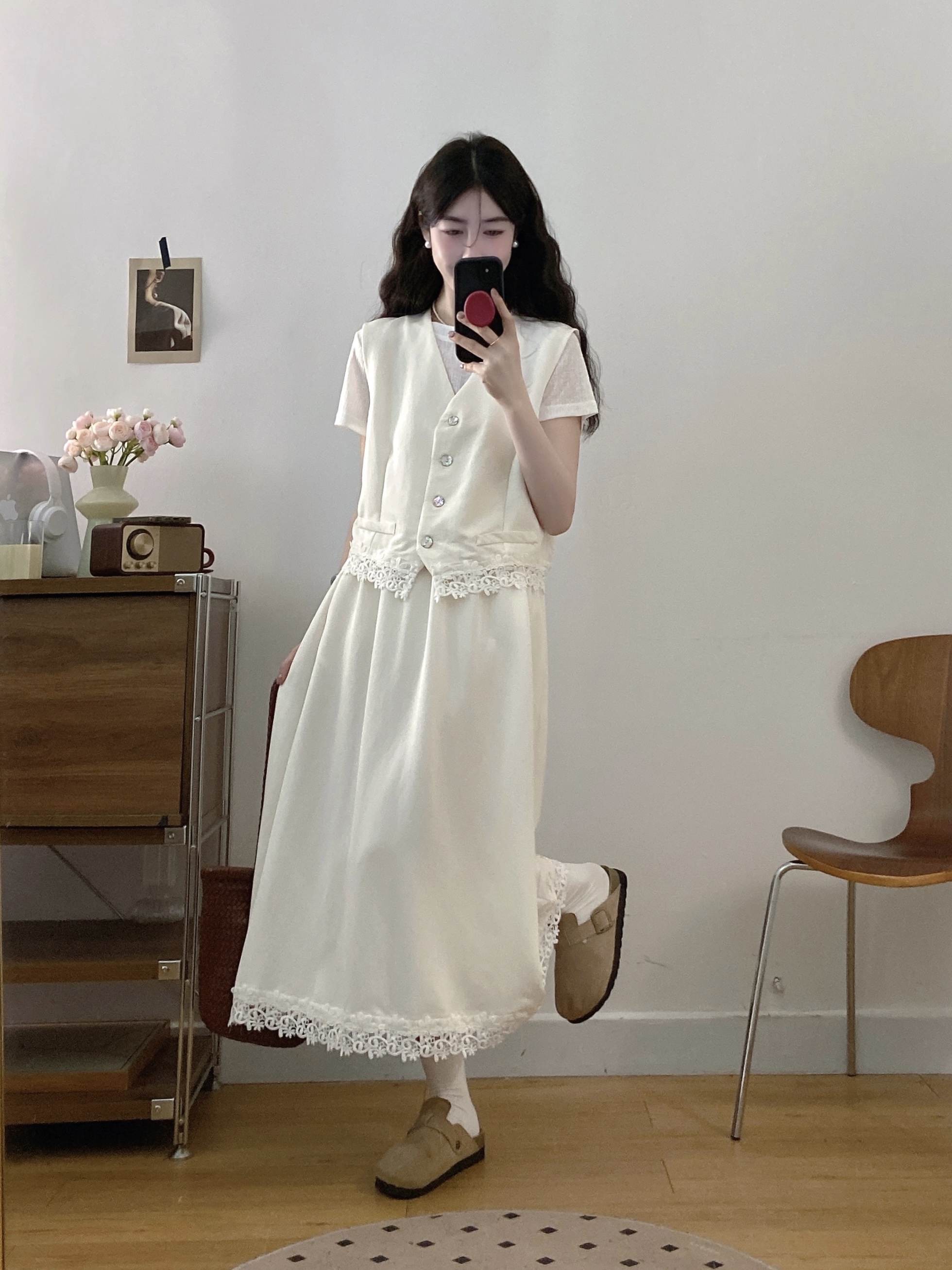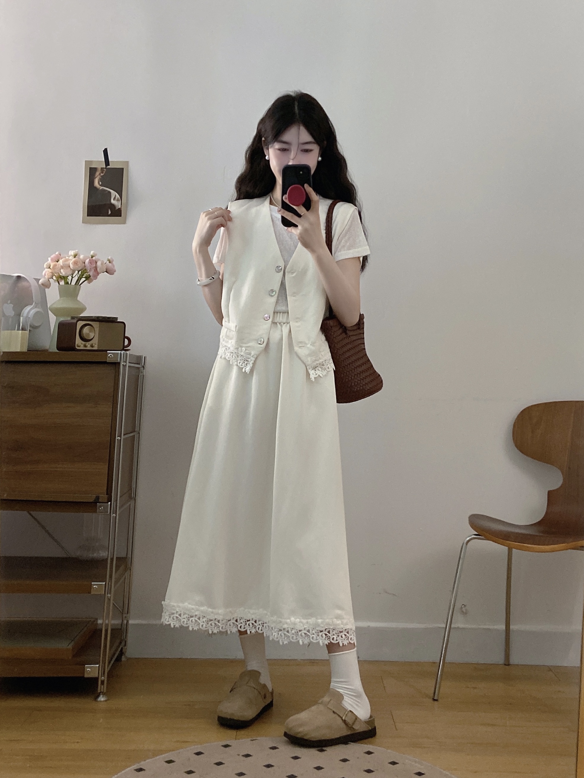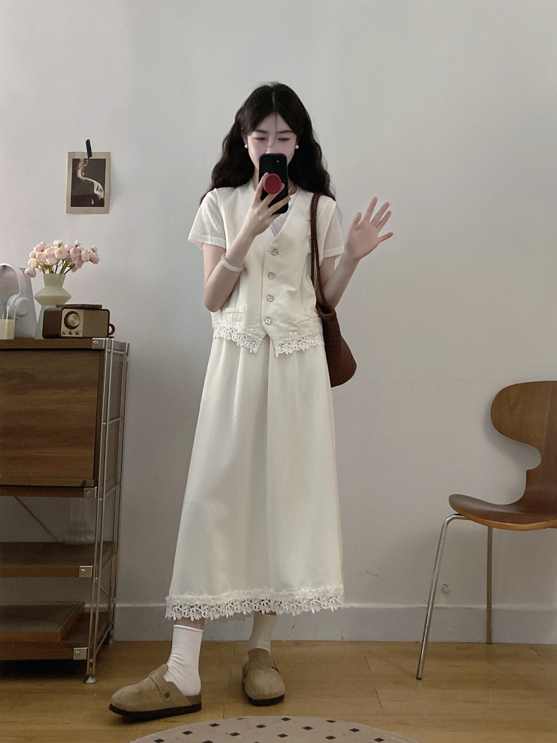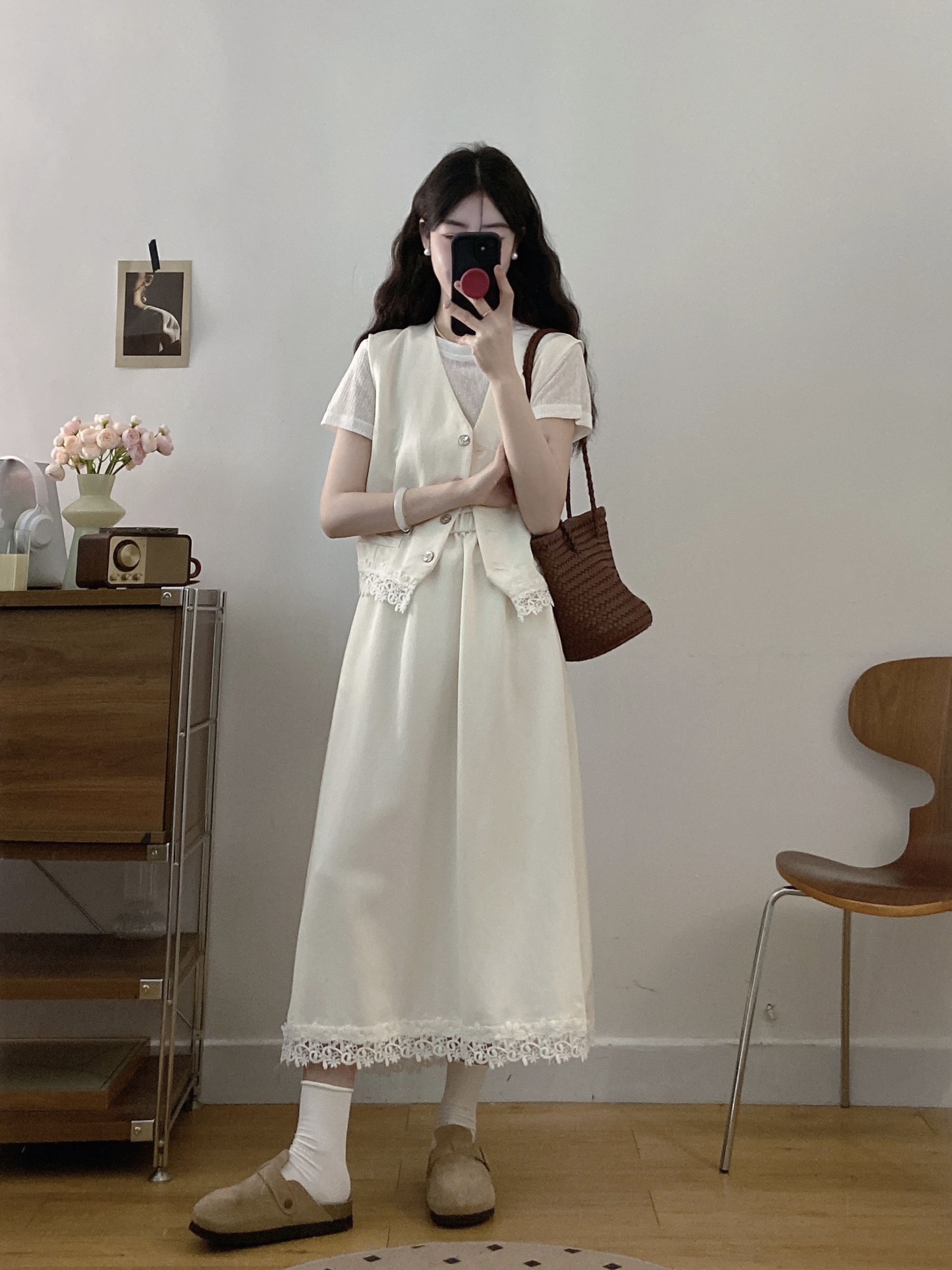 실사 빅 사이즈 세트 여성 2026 년 여름 한국 스타일 라운드 넥 캐주얼 조끼 스커트 화이트 반팔 티셔츠 투피스 슈트