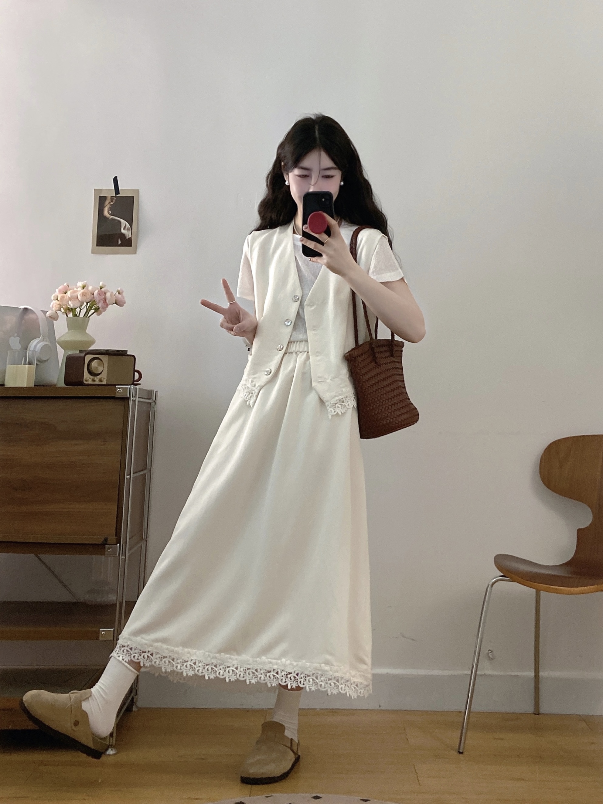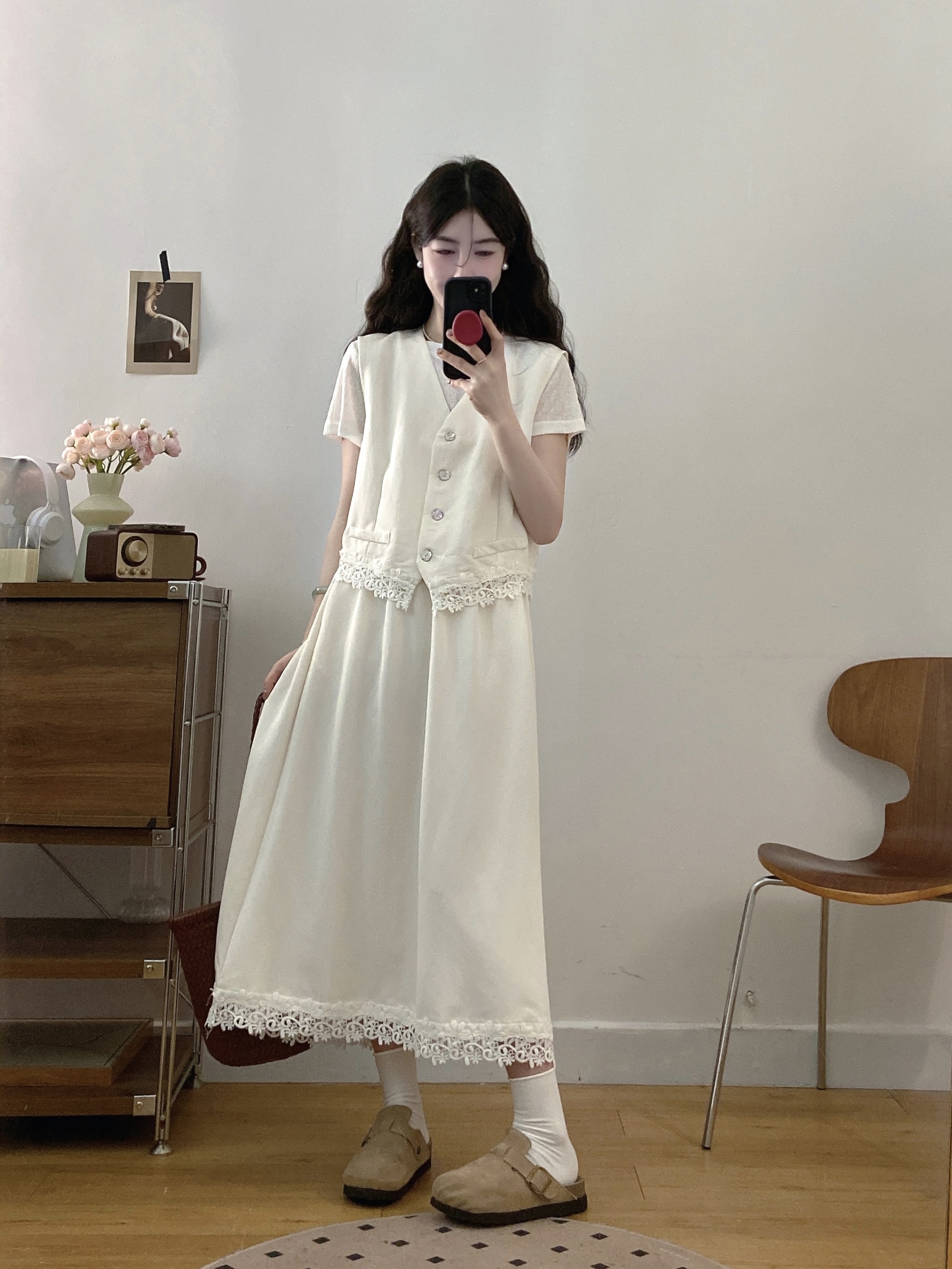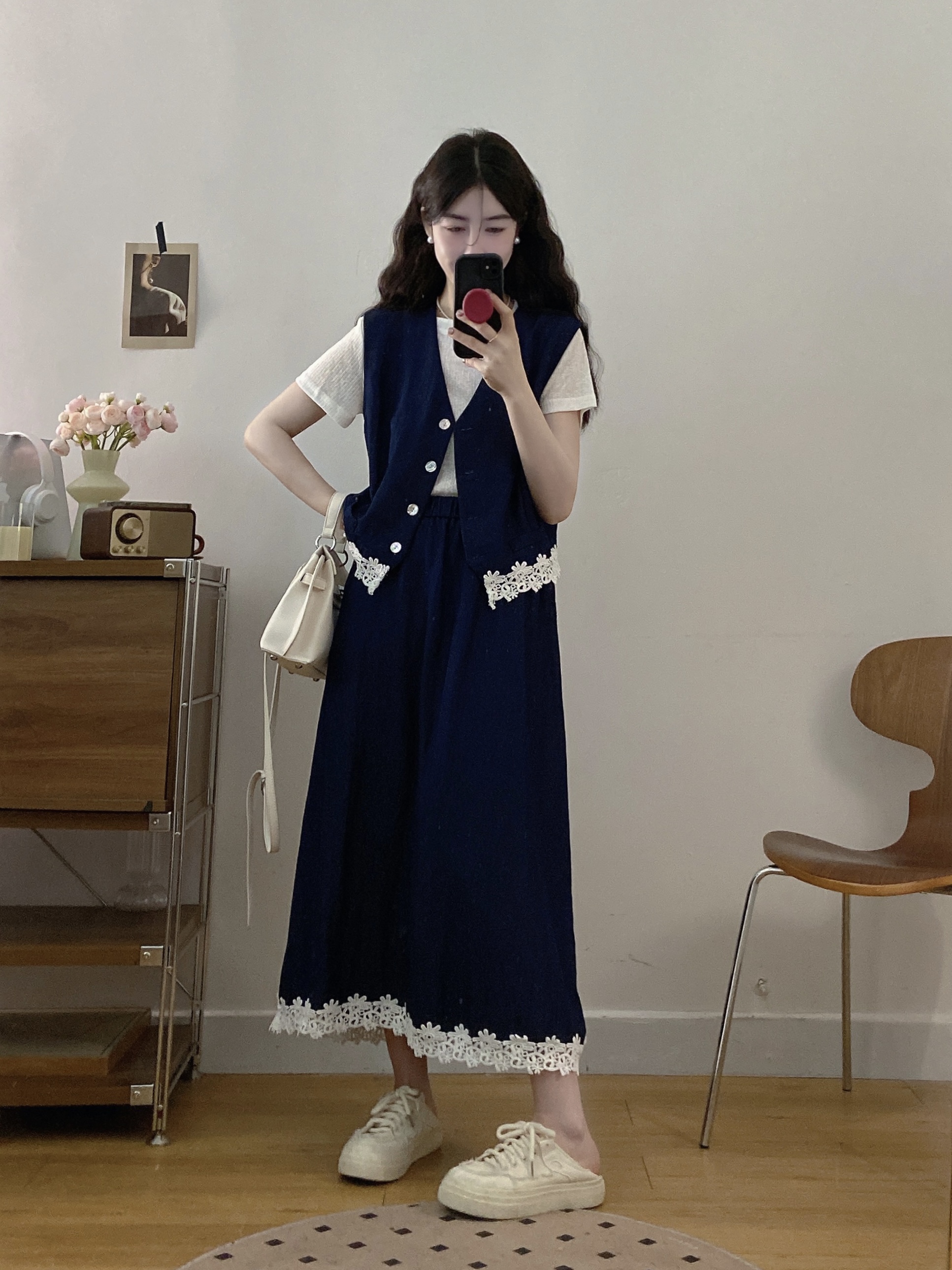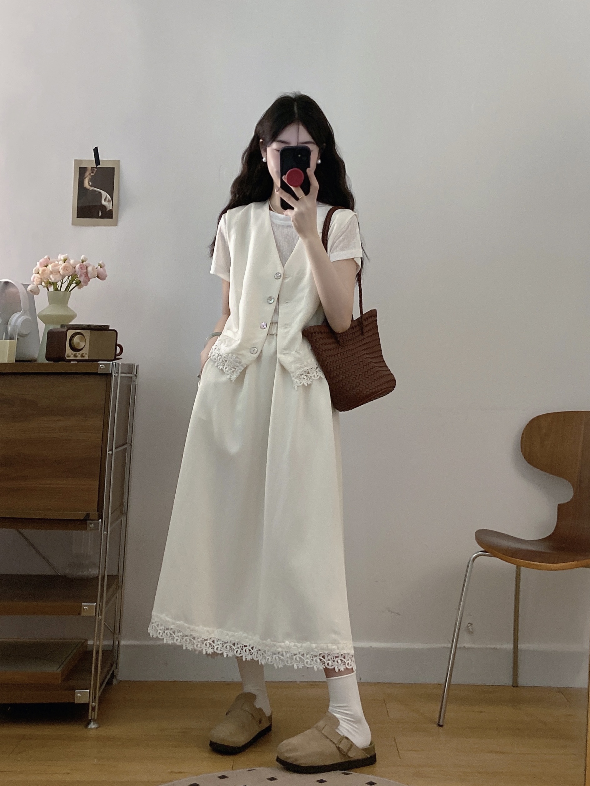 실사 빅 사이즈 세트 여성 2026 년 여름 한국 스타일 라운드 넥 캐주얼 조끼 스커트 화이트 반팔 티셔츠 투피스 슈트