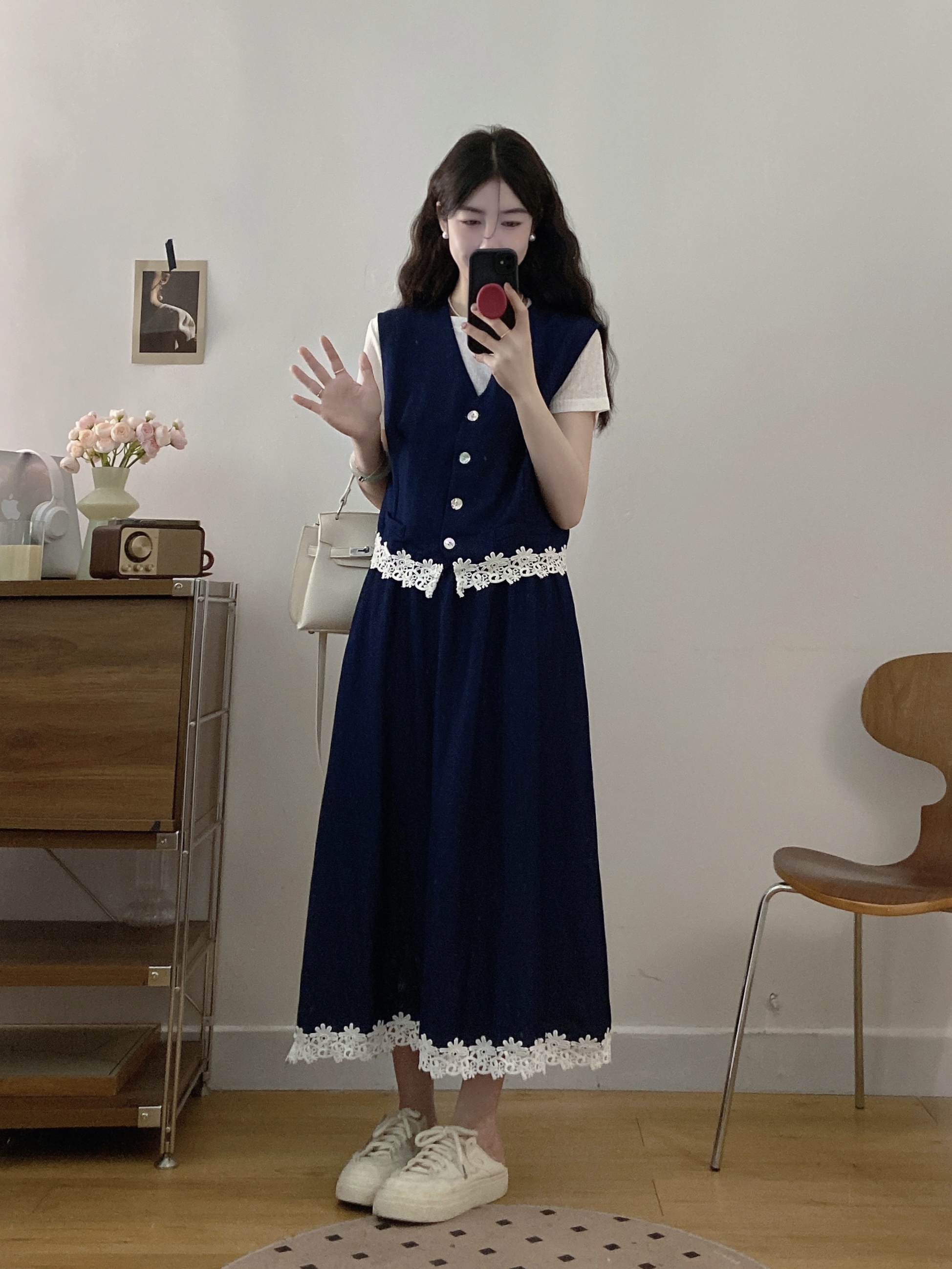 실사 빅 사이즈 여성 의류 2026 여름 프랑스식 품격 POLO 칼라 고급 센스 레이스 조각 슬림해 보이는 드레스