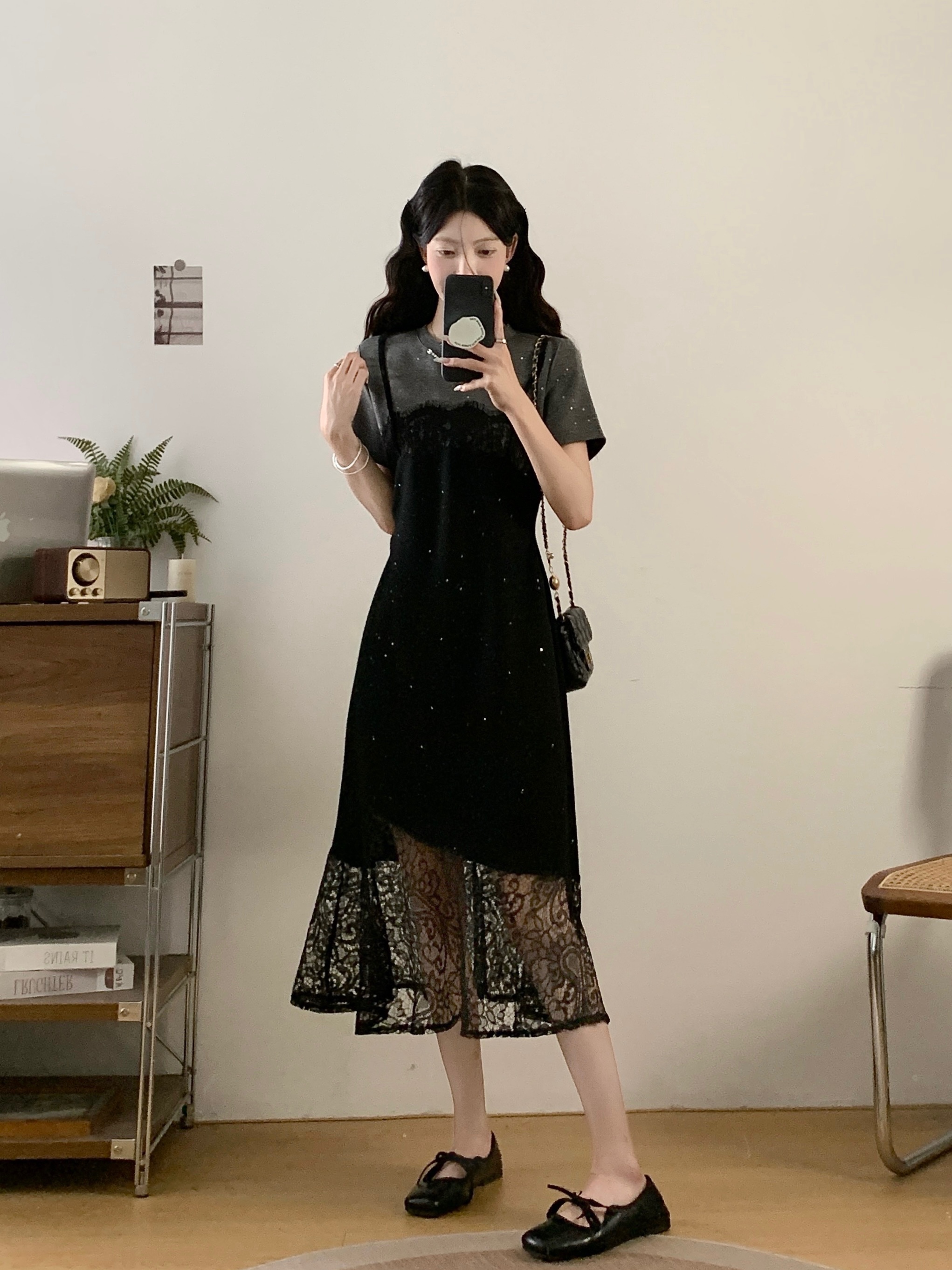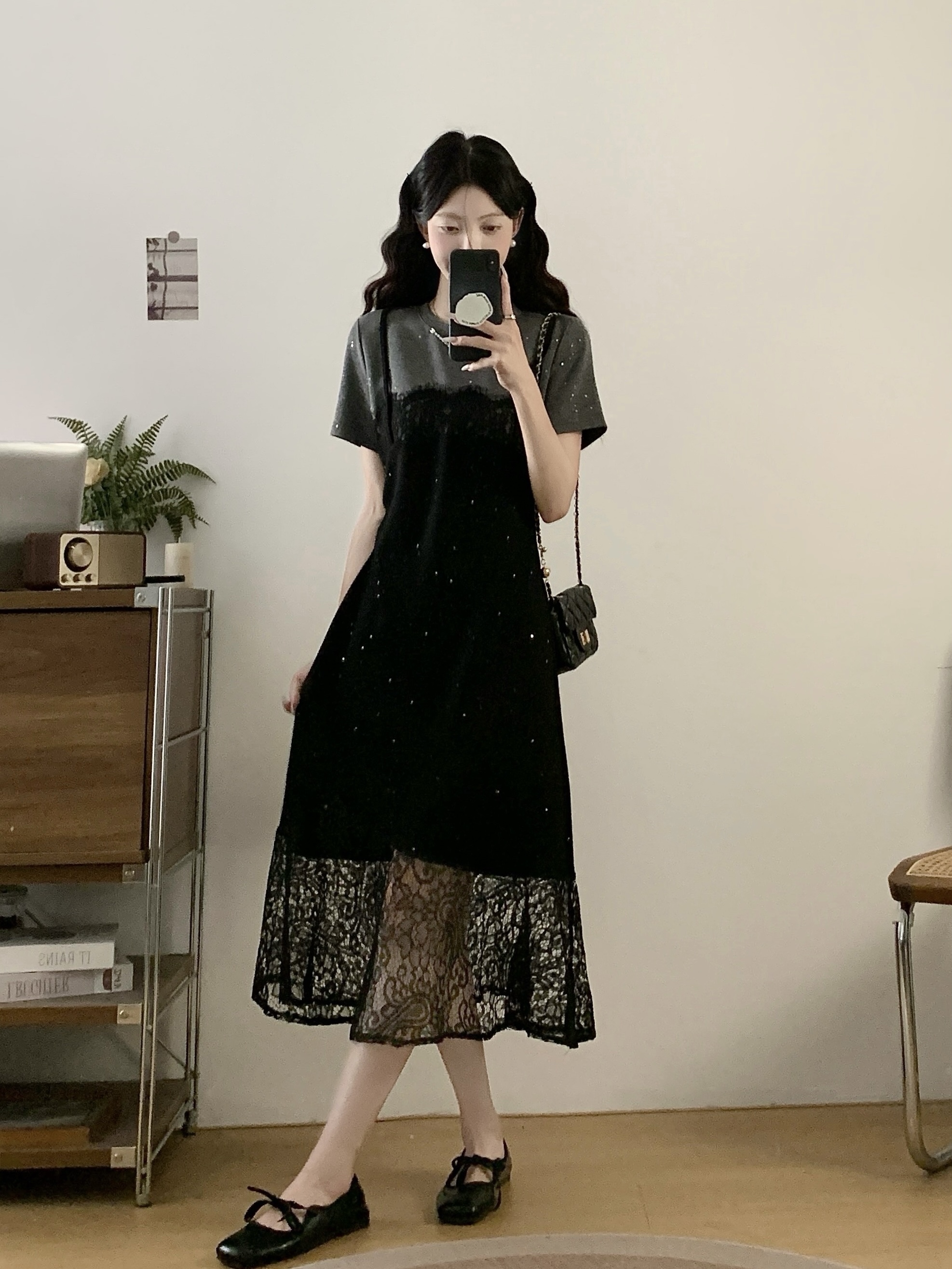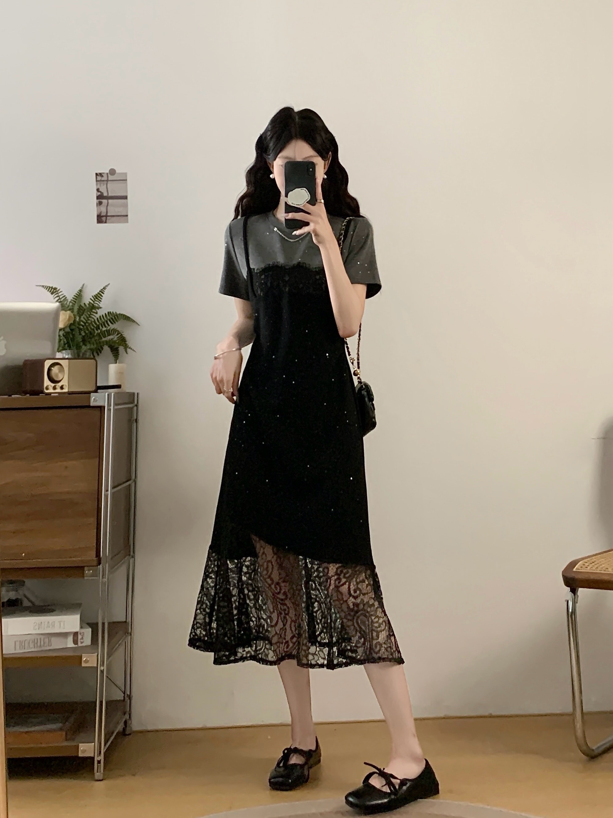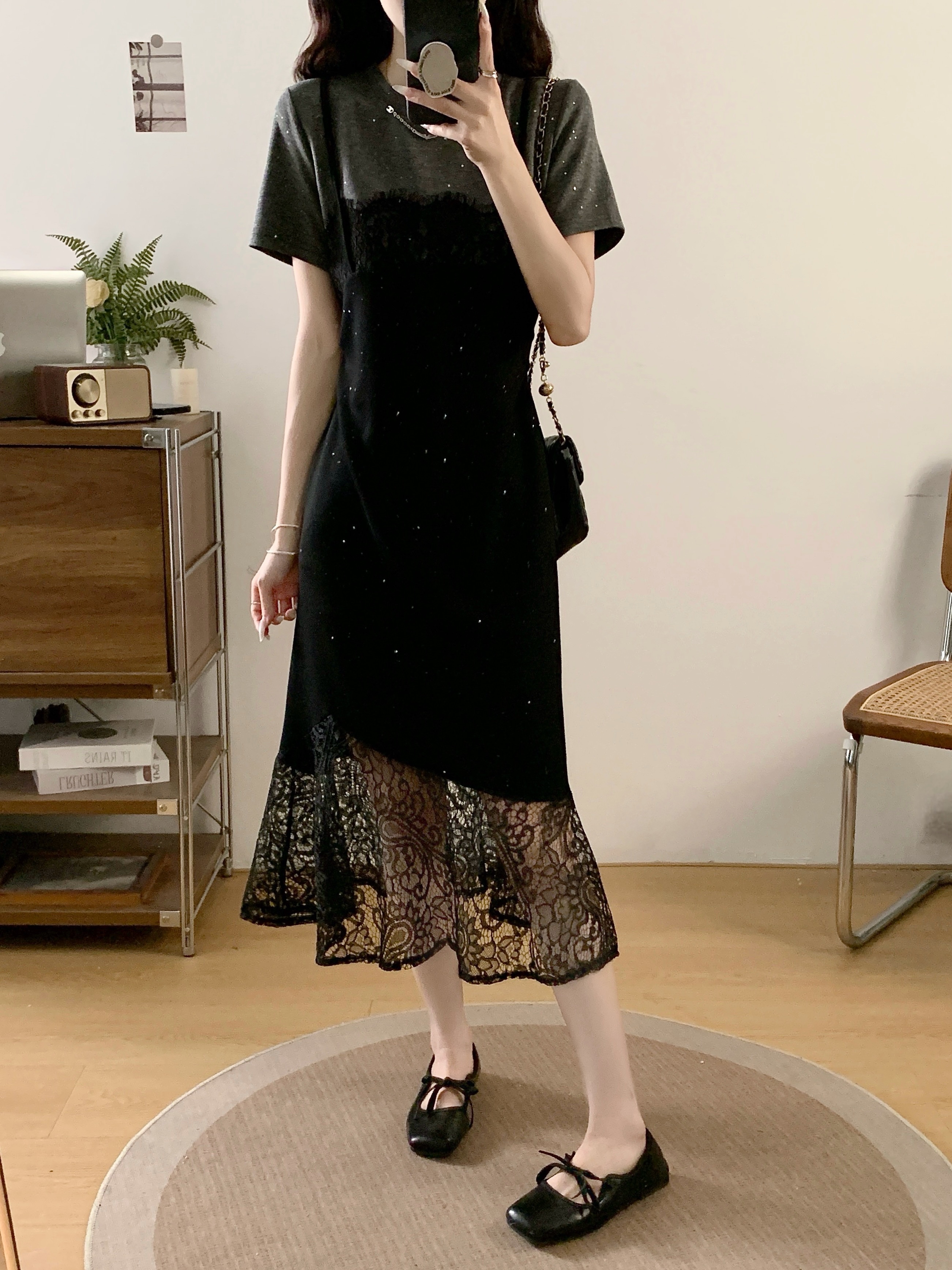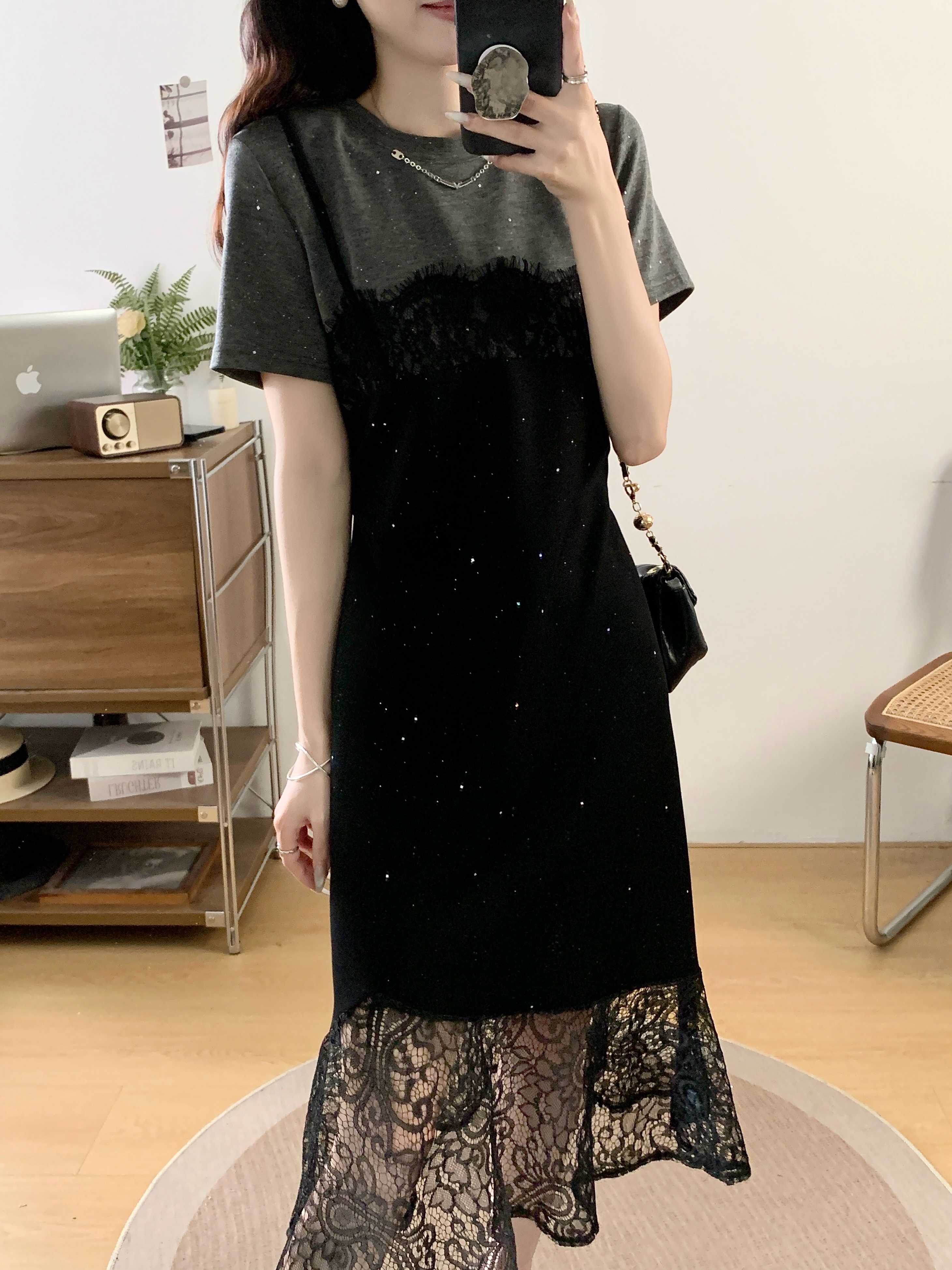 실사 빅 사이즈 여성 의류 2026 여름 프랑스식 패션 캐주얼 레이스 조각 페이크 레이어드 슬림해 보이는 반팔 드레스