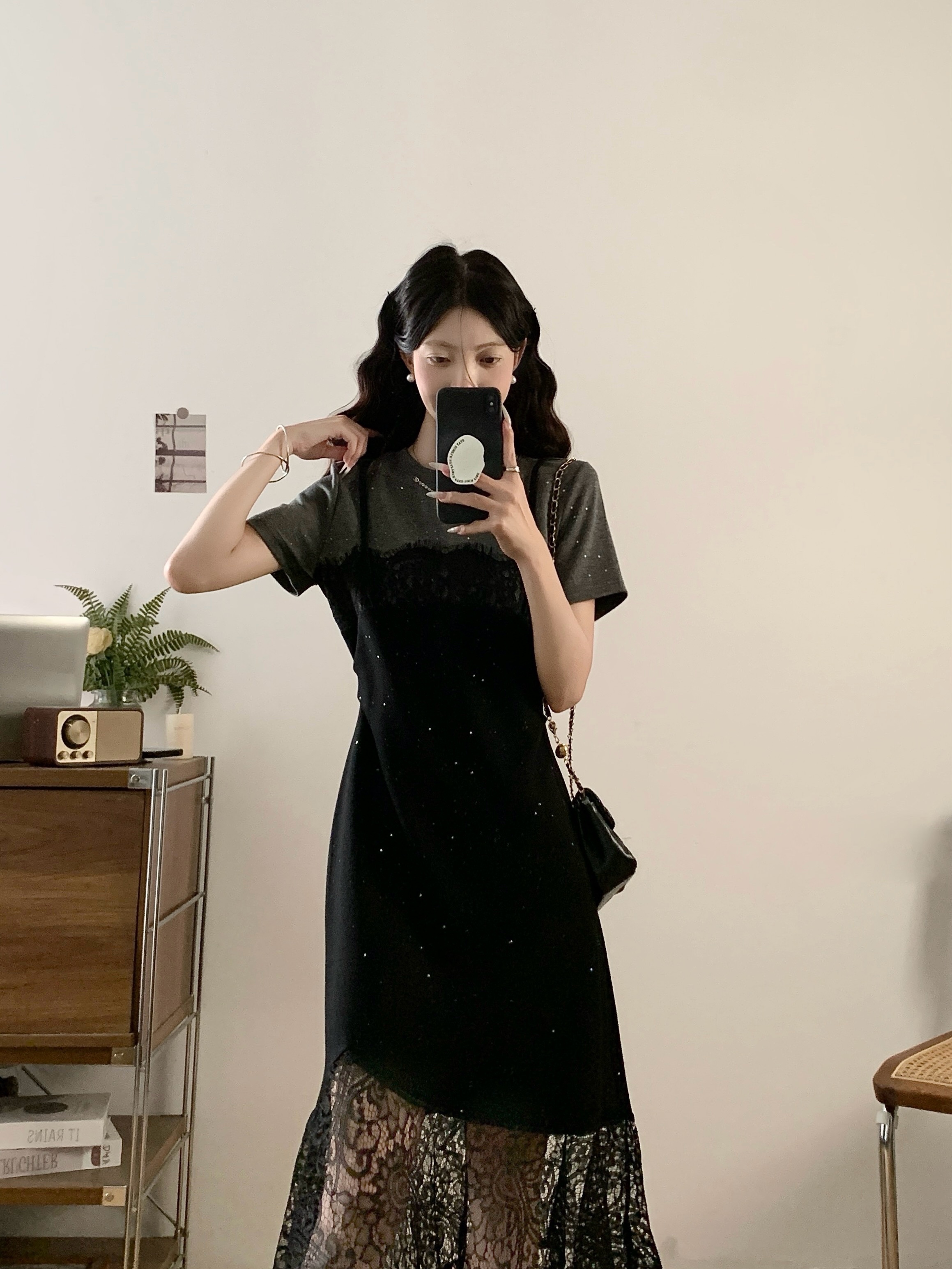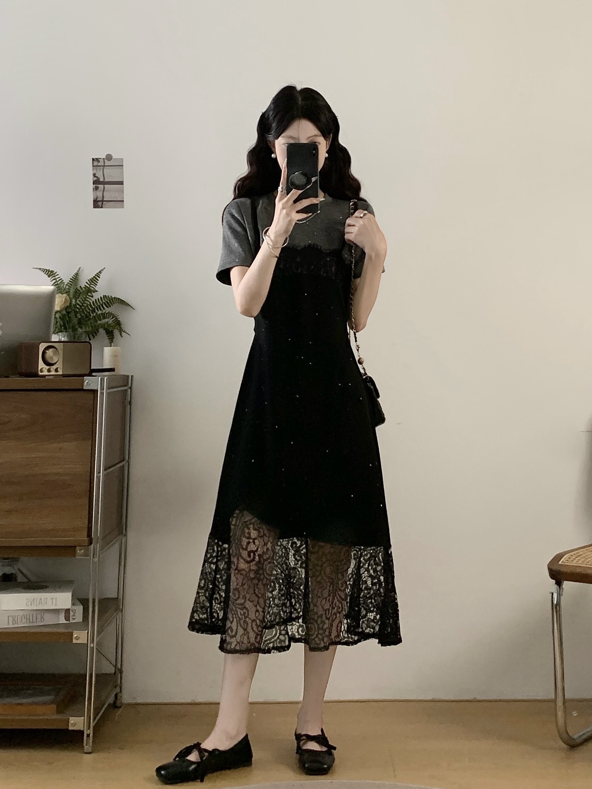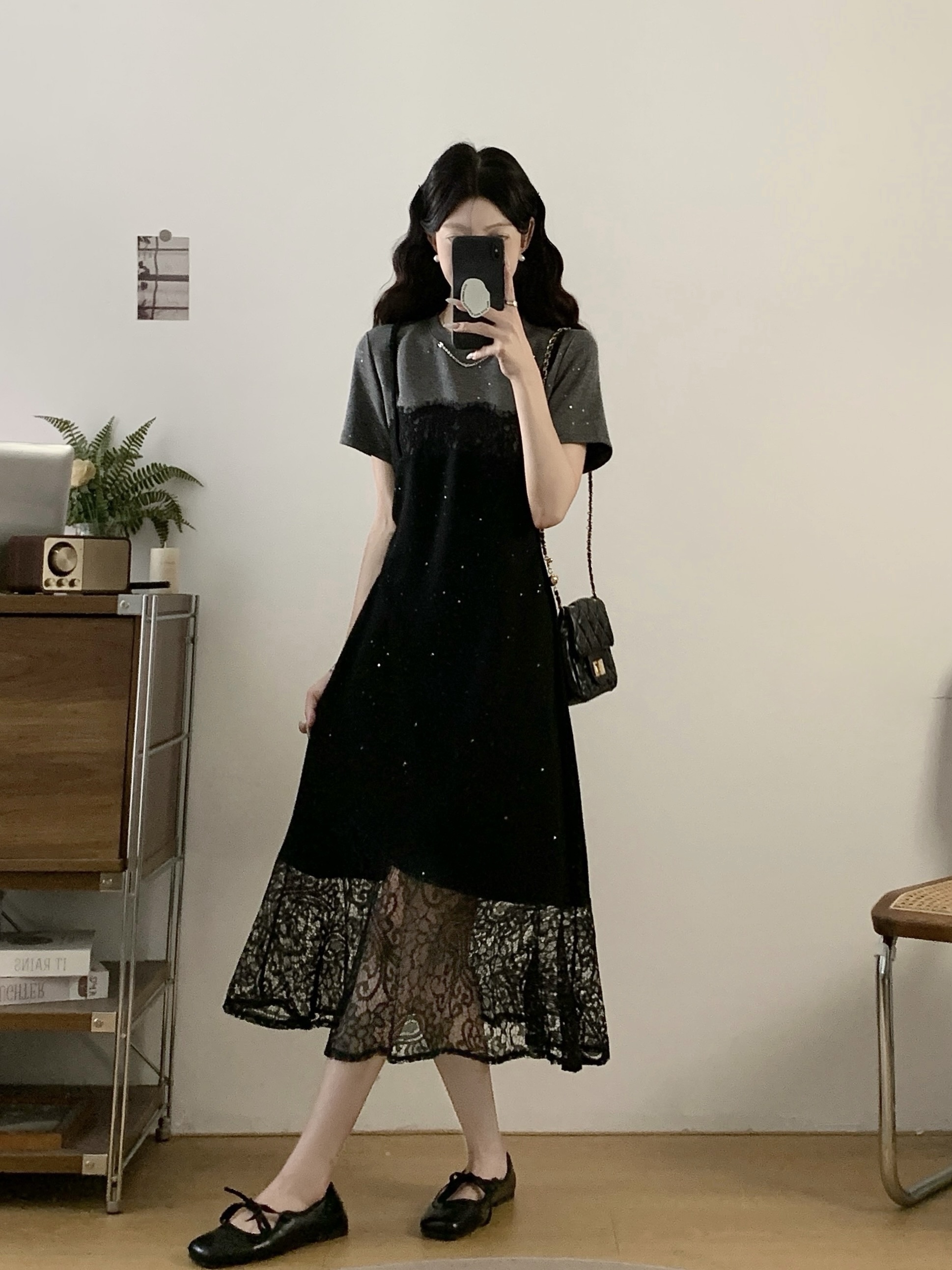 실사 빅 사이즈 여성 의류 2026 여름 새로운 디자인 센스 품격 캐주얼 레이스 조각 슬림해 보이는 회색 드레스