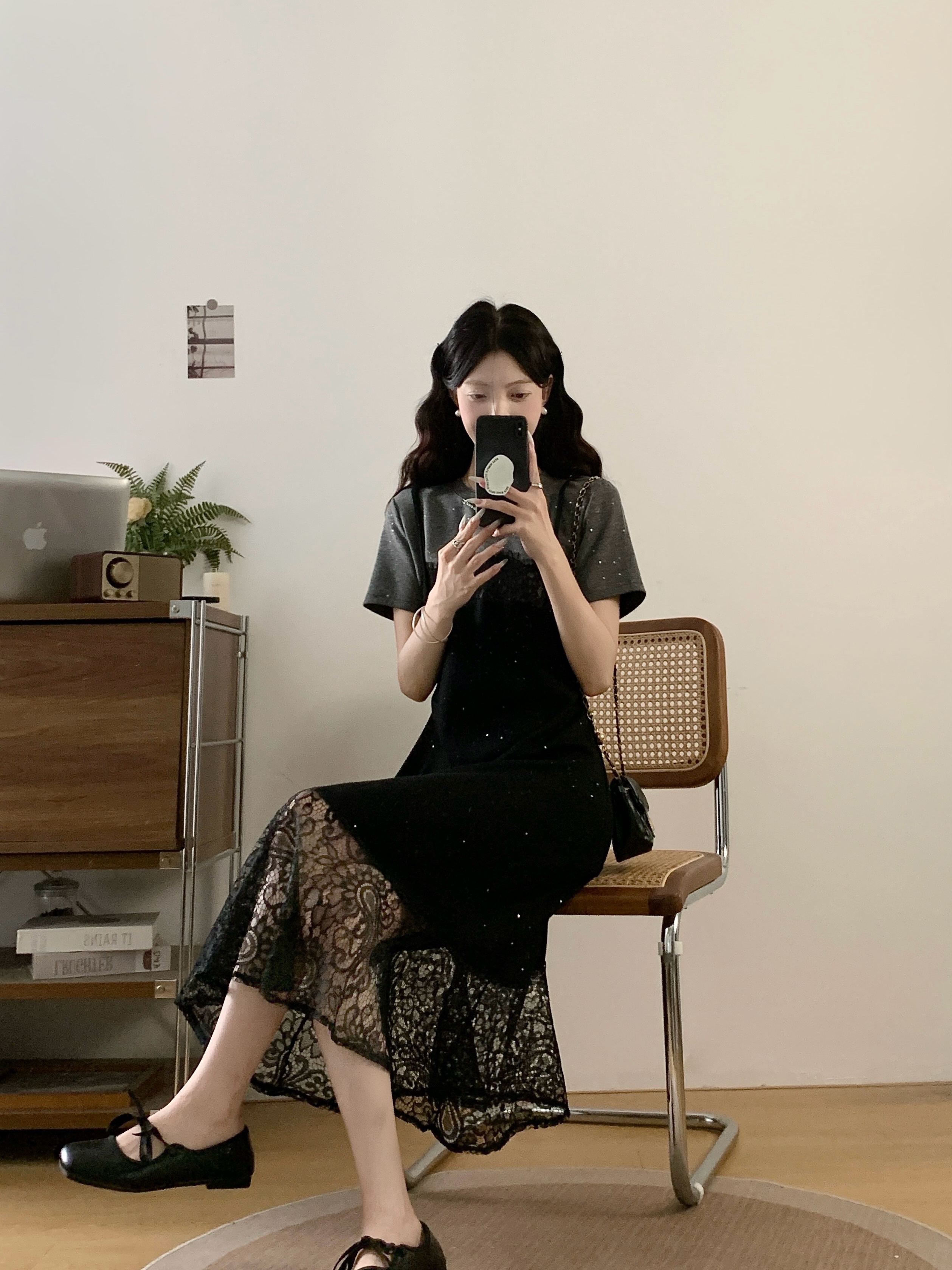 실사 빅 사이즈 여성 의류 지방 mm 봄 여름 디자인 센스 패치워크 레이스 불규칙 루즈핏 티셔츠 맨위 기본 셔츠