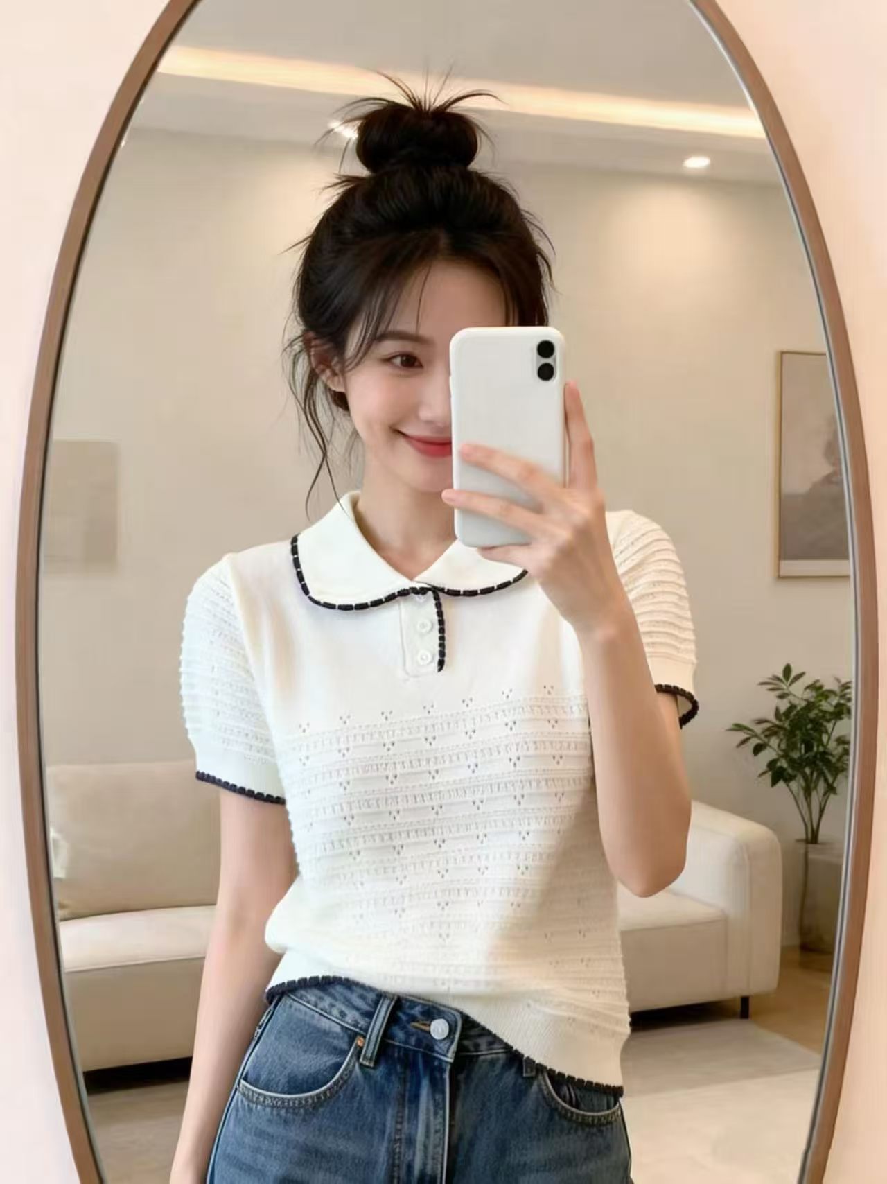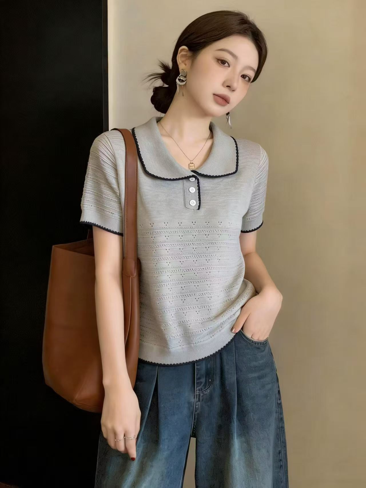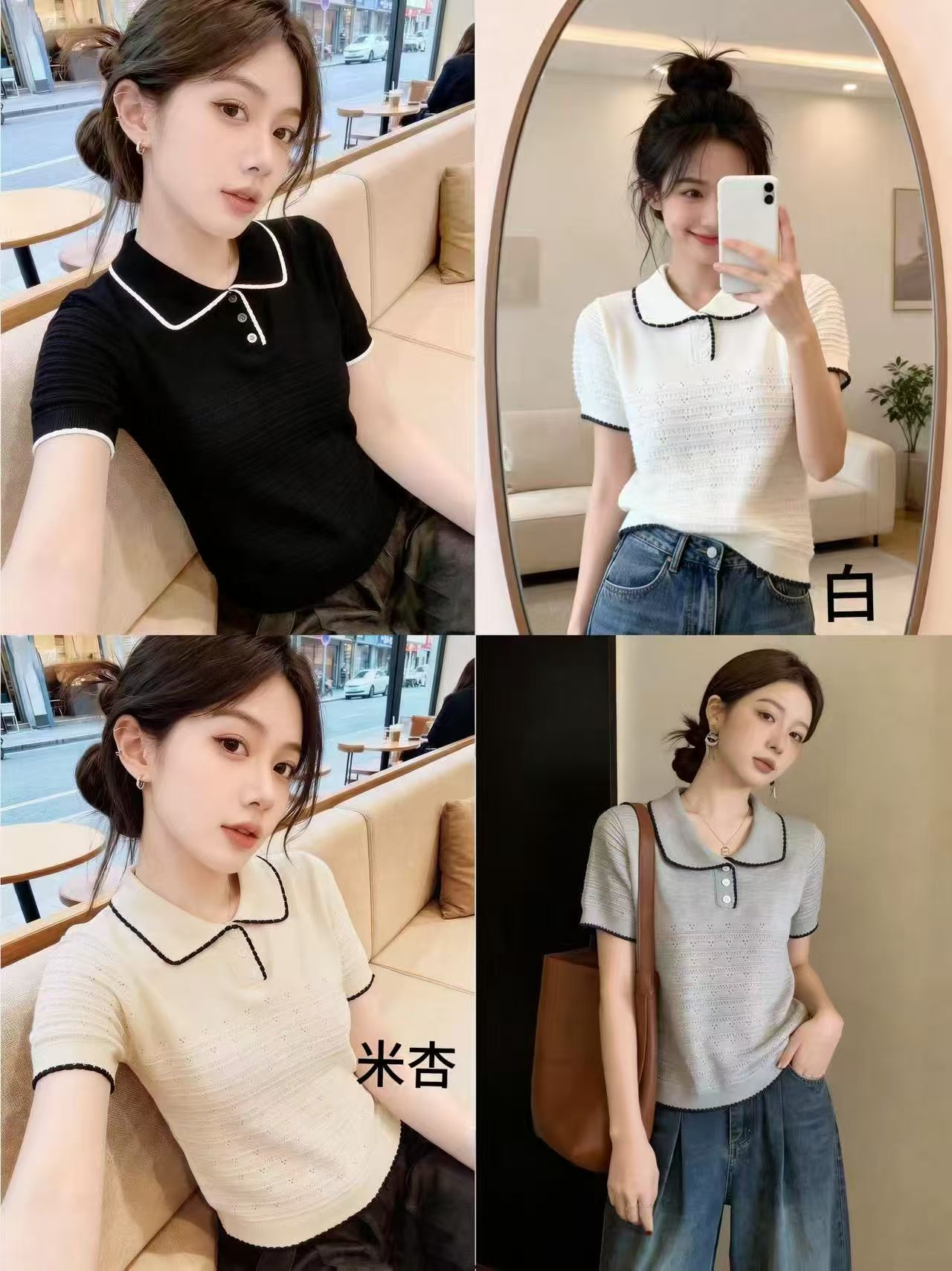 배색 POLO 칼라 니트 스웨터 티셔츠 반팔 여성 여름 새로운 한 부서 착용 가져 가라. 캐주얼 작은 키 슬림해 보이는 맨위