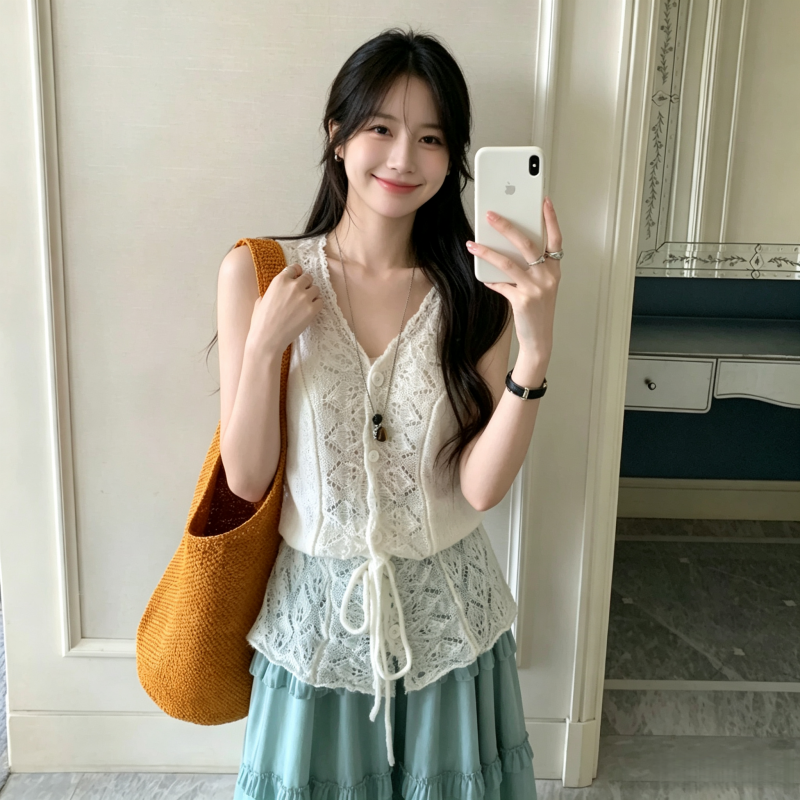실사 정가 낭만주의 부드러운 바람 레이스 레이스 V넥 민소매 니트 조끼 품격 오픈 가디건 맨위
